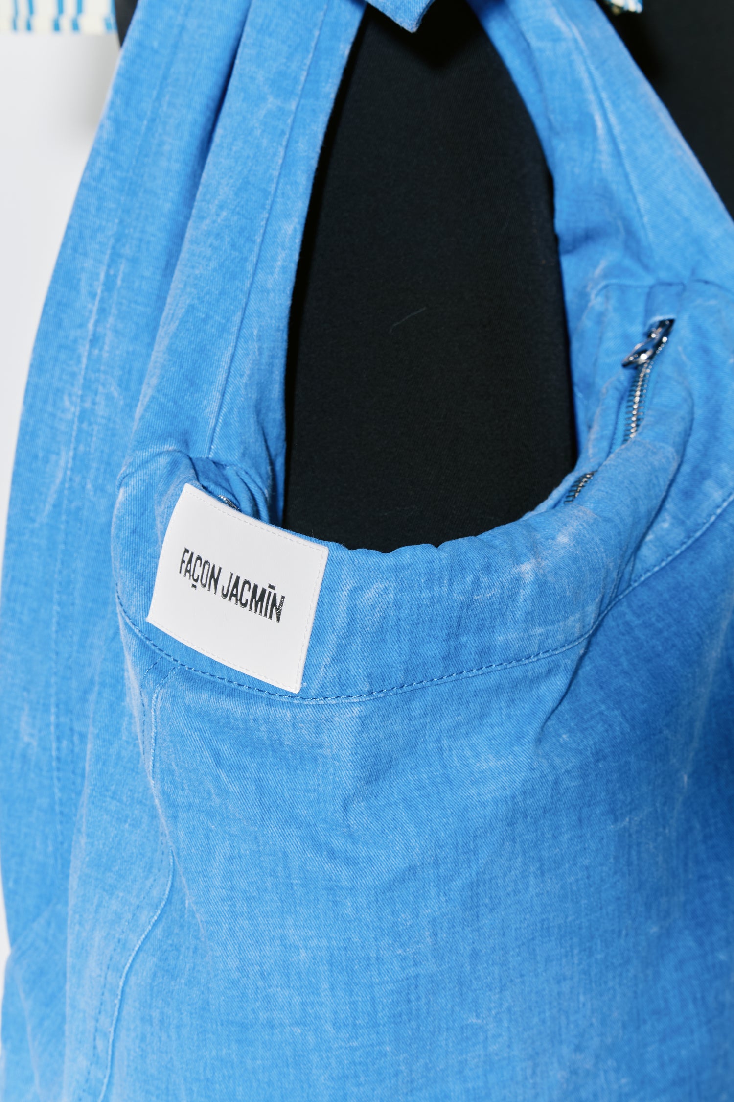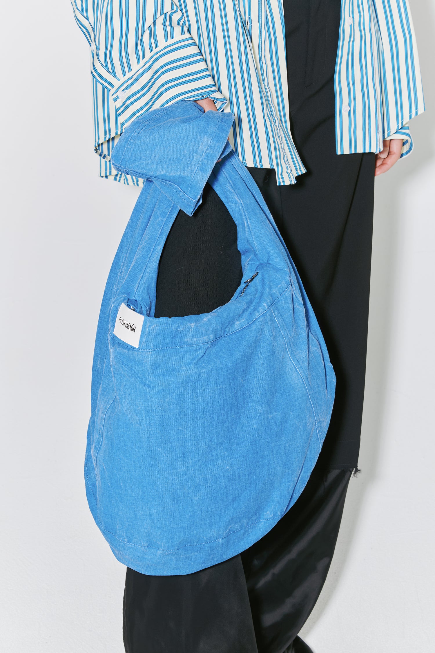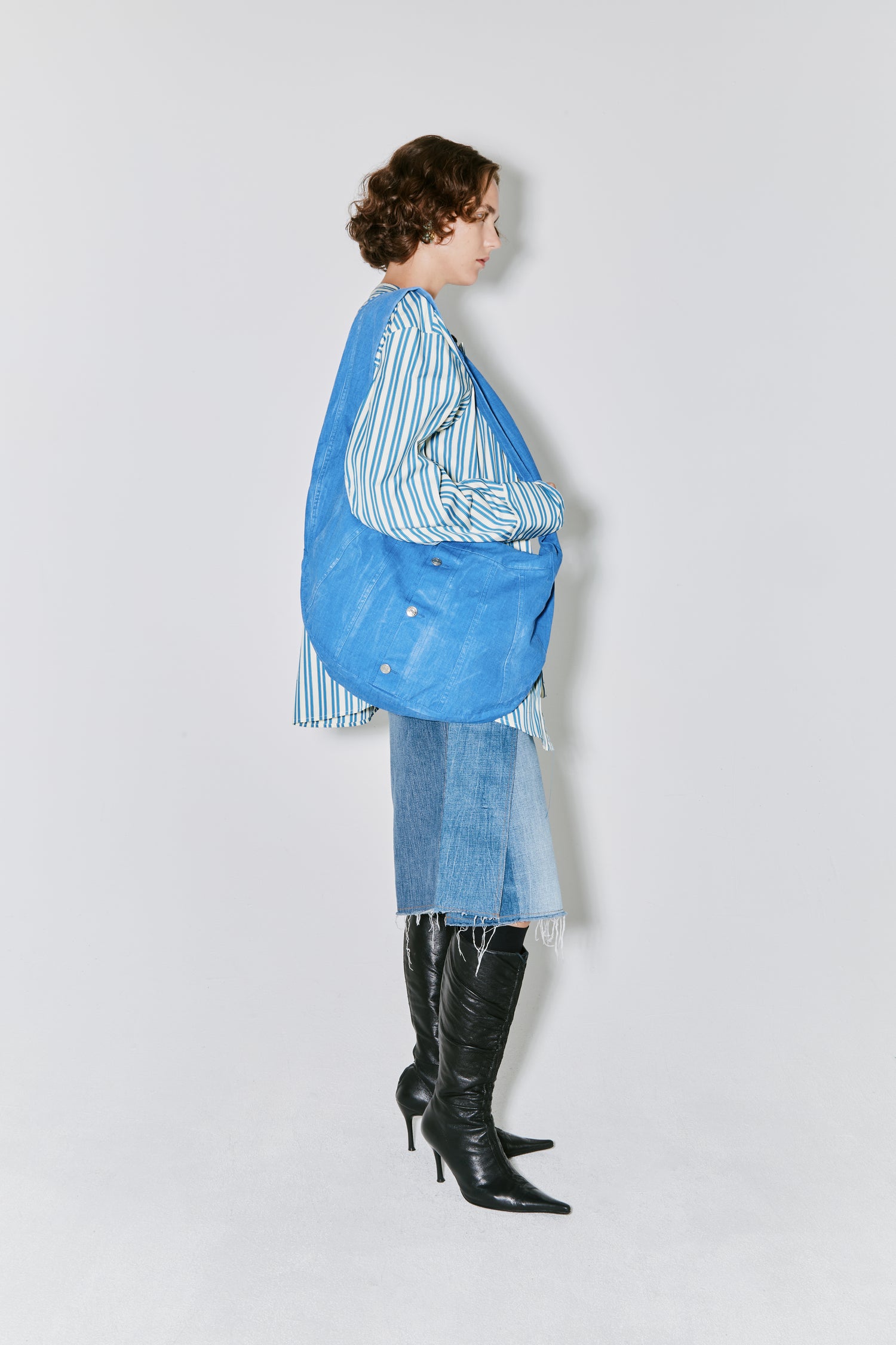 AMY is a shopping bag made from Italian blue coated cotton, designed with a denim jacket-inspired look.