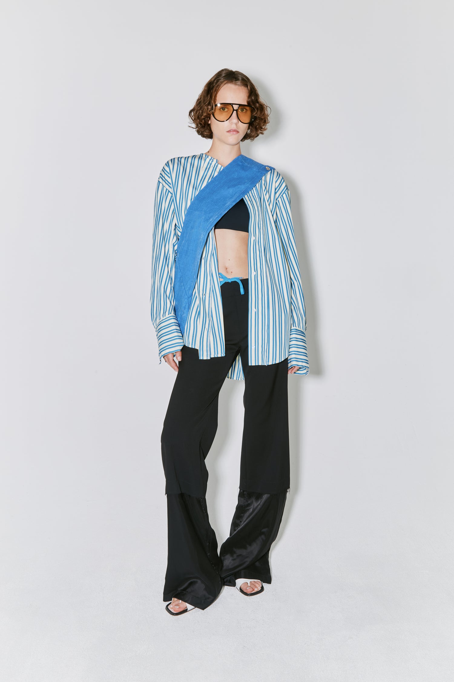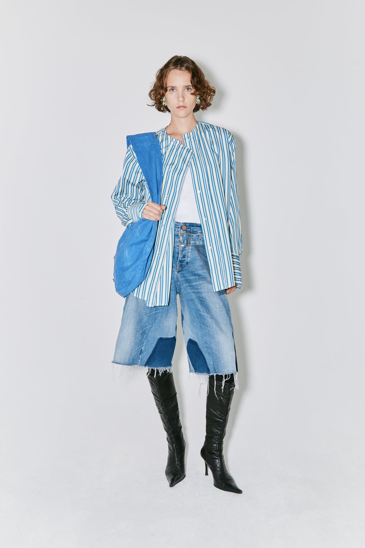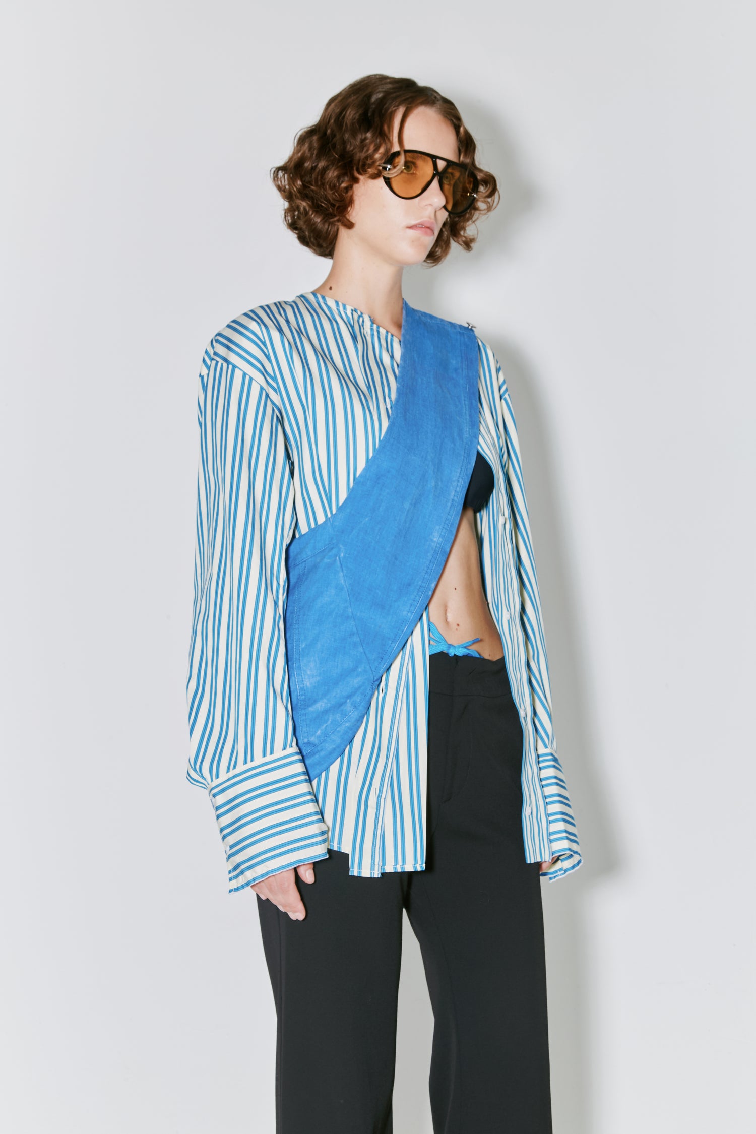 AMY is a shopping bag made from Italian blue coated cotton, designed with a denim jacket-inspired look.