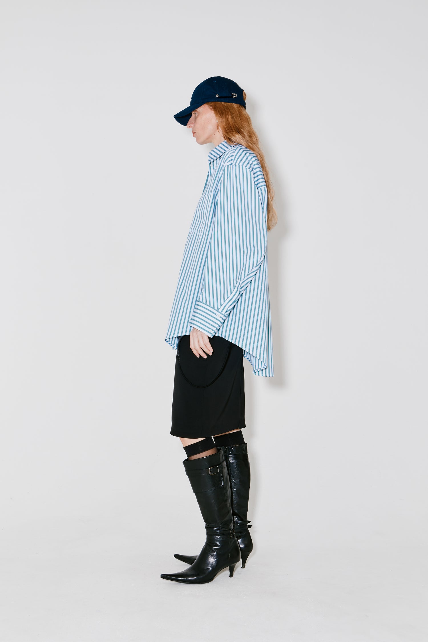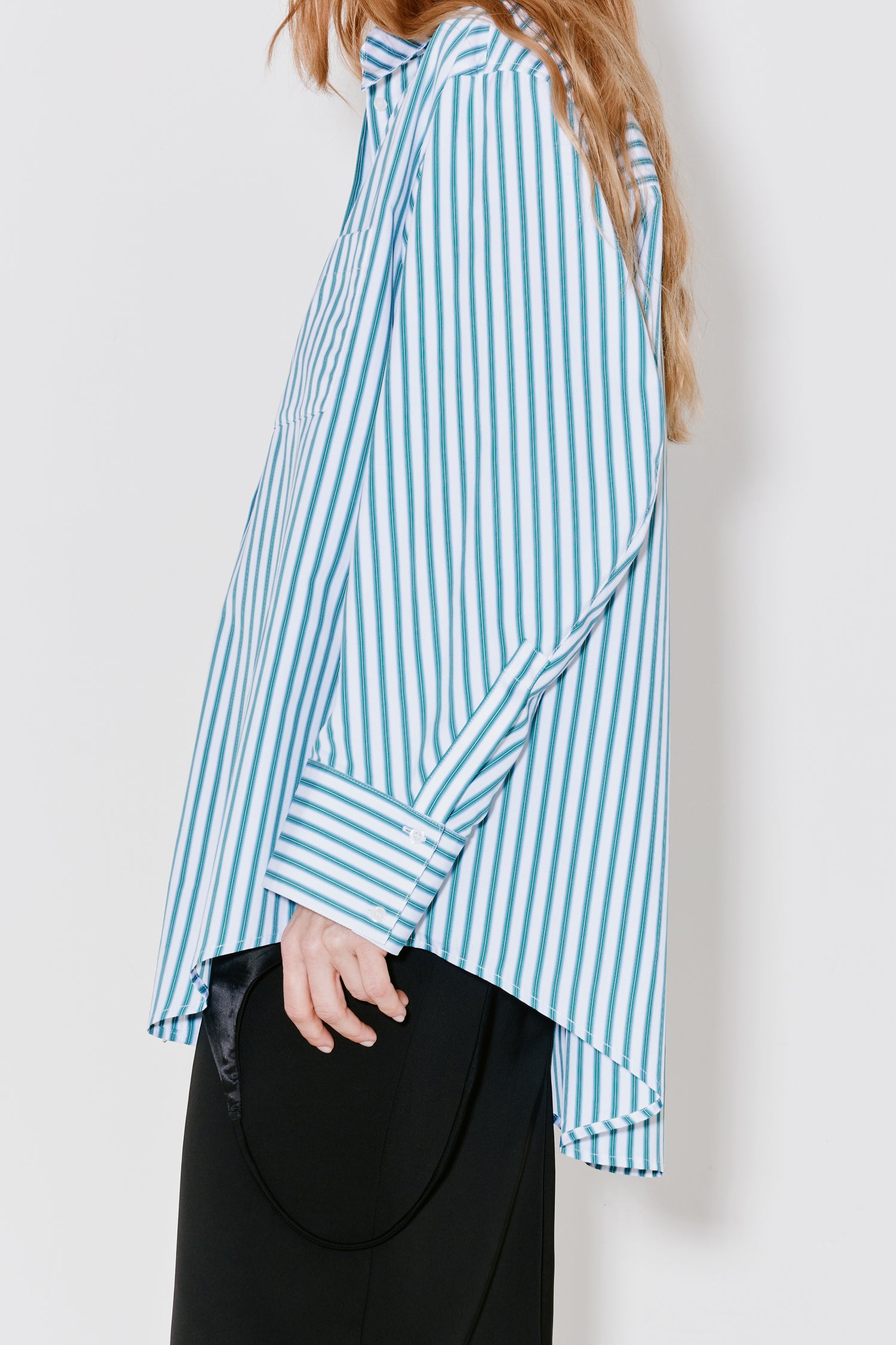 CAREL is a button-up shirt crafted from Italian poplin with green stripes. Features a clean front closure, dropped shoulders, and wide buttoned cuffs. Designed with curved hem and minimal detailing. Cut to an oversized fit and hip length.