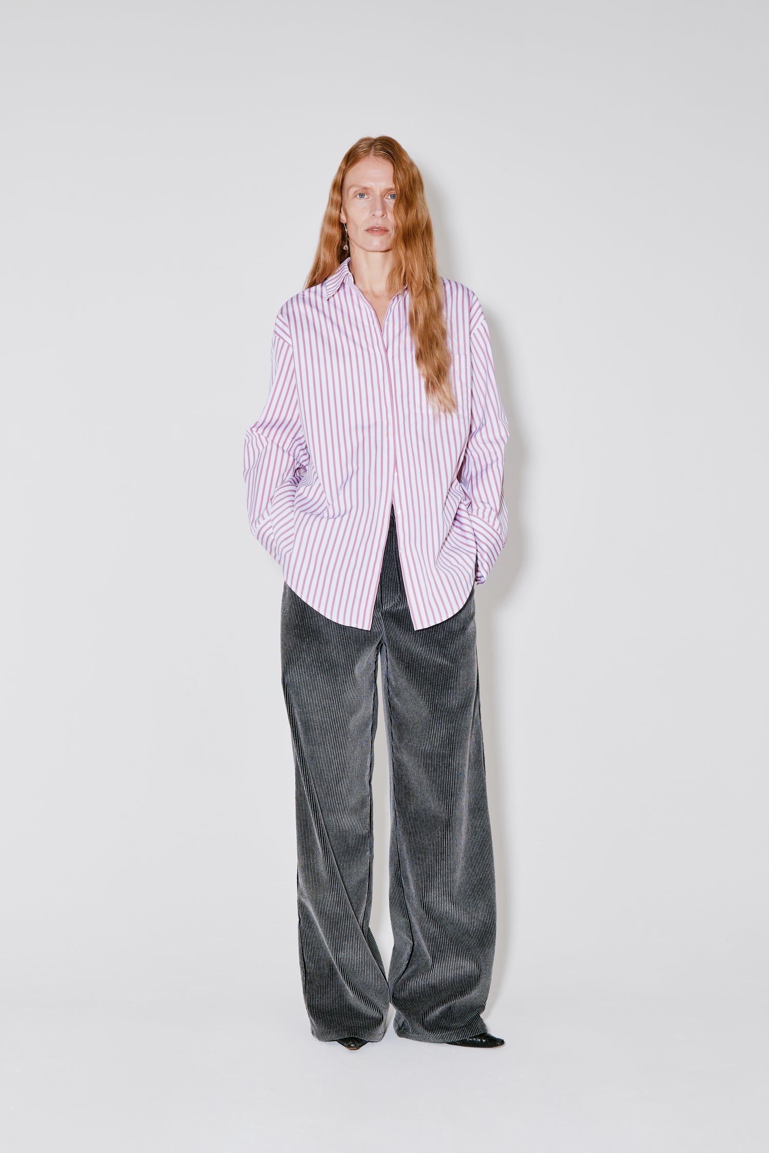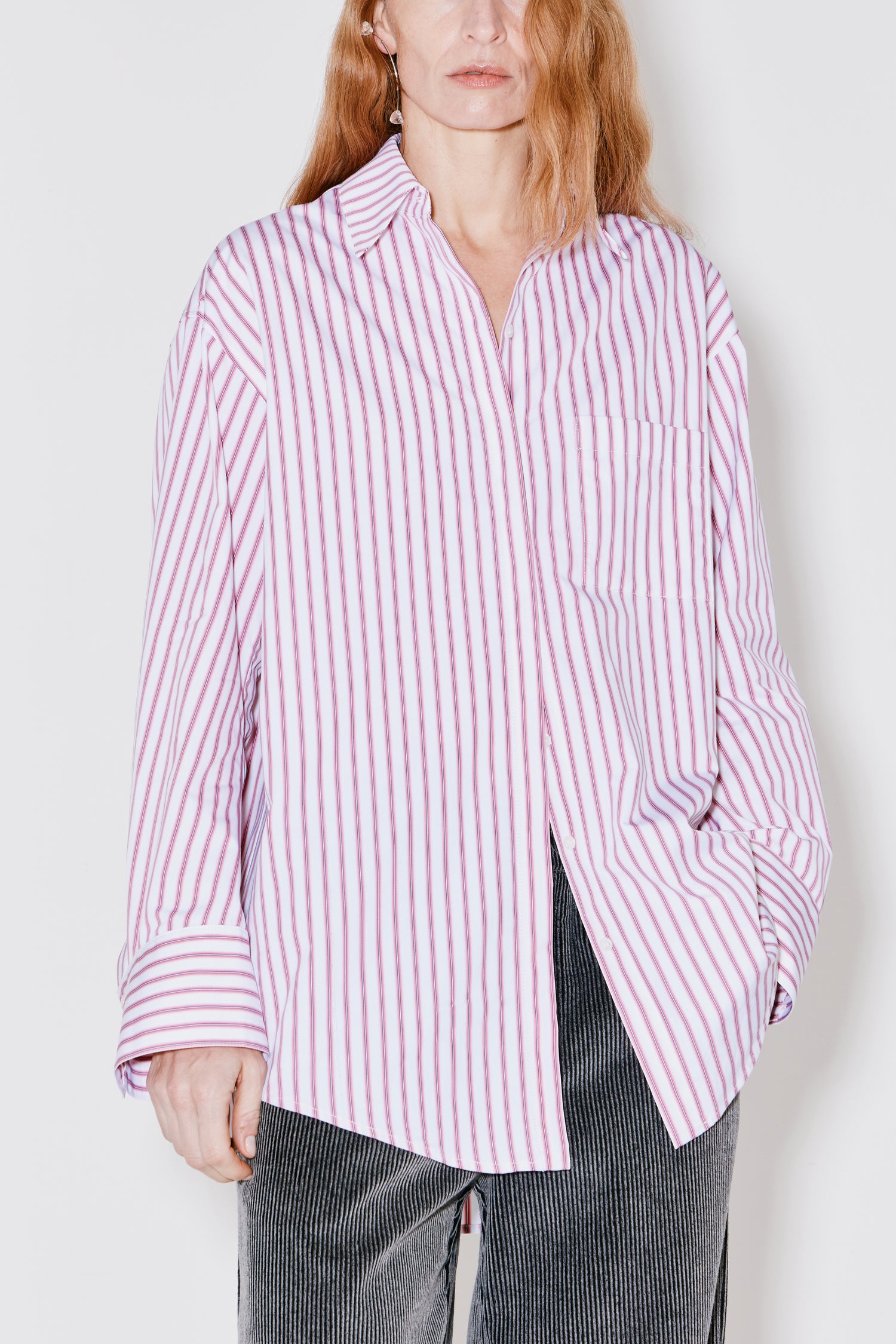 CAREL is a button-up shirt crafted from Italian poplin with pink stripes. Features a clean front closure, dropped shoulders, and wide buttoned cuffs. Designed with curved hem and minimal detailing. Cut to an oversized fit and hip length.