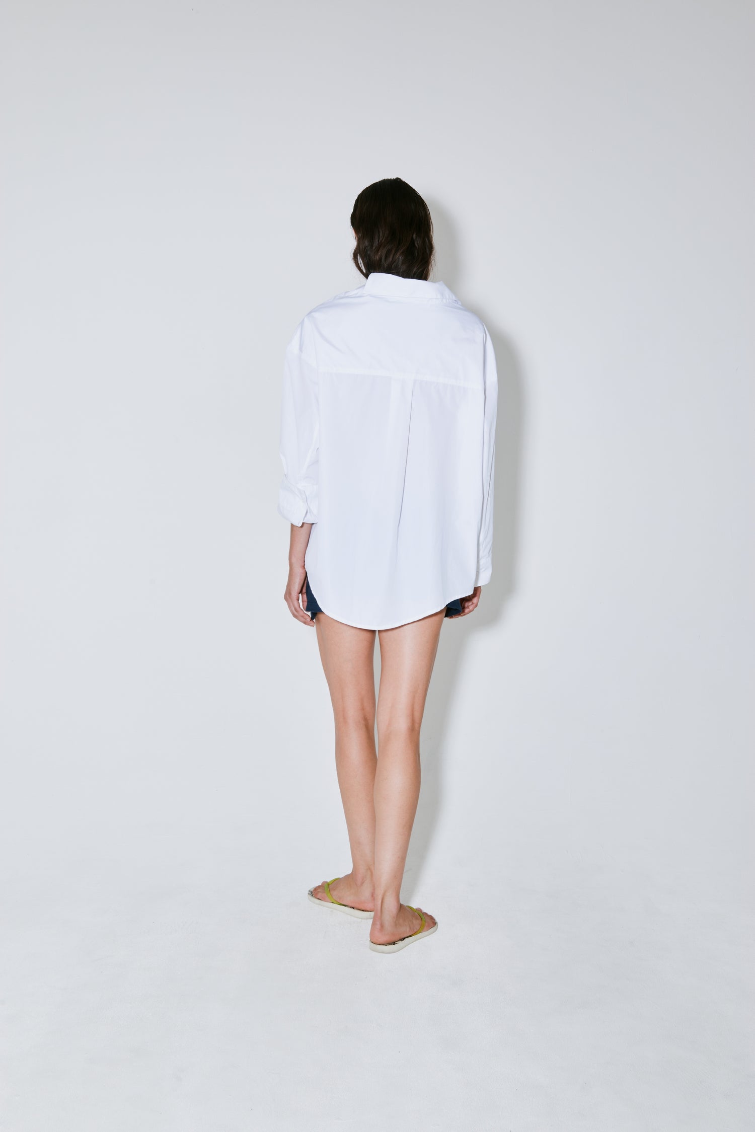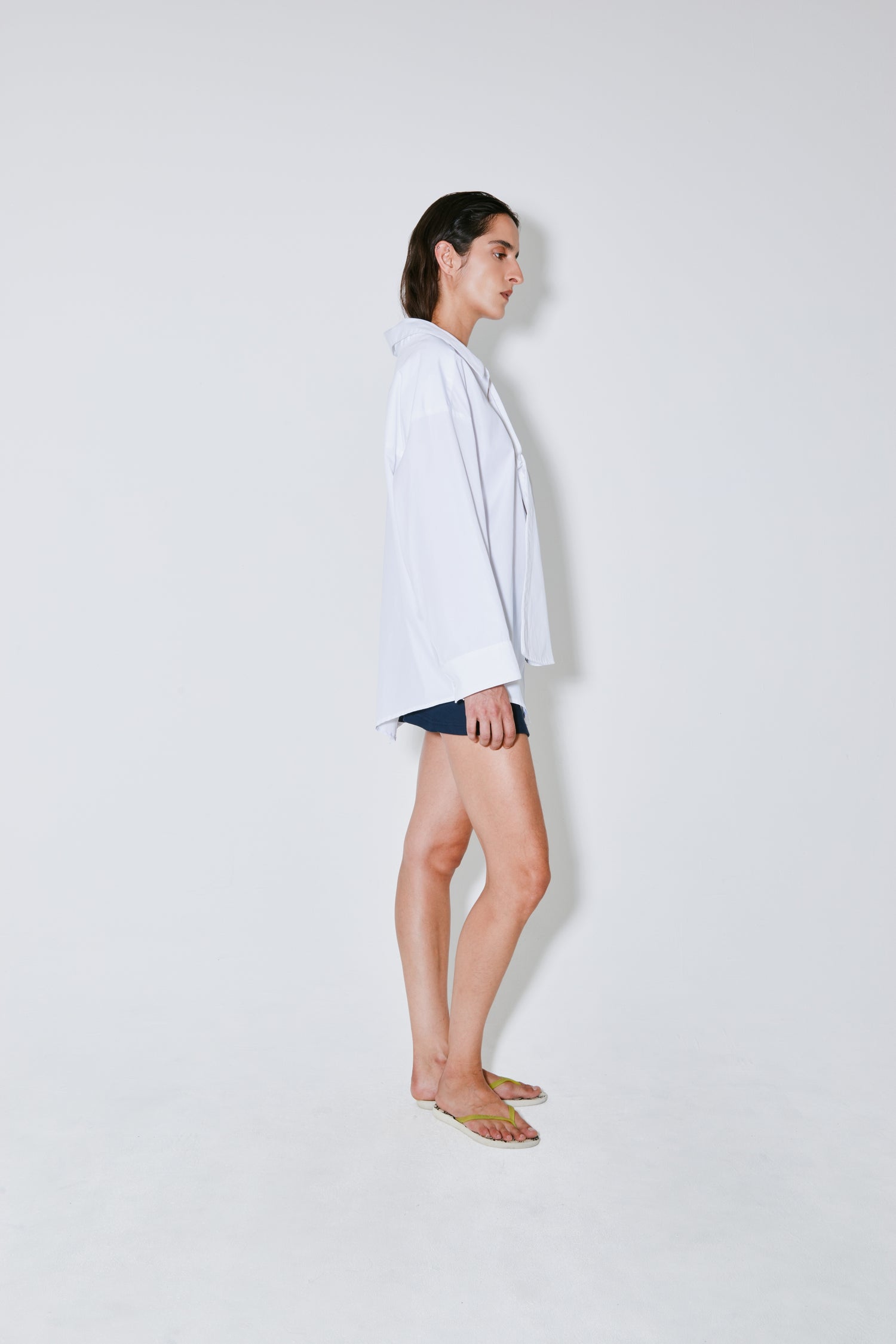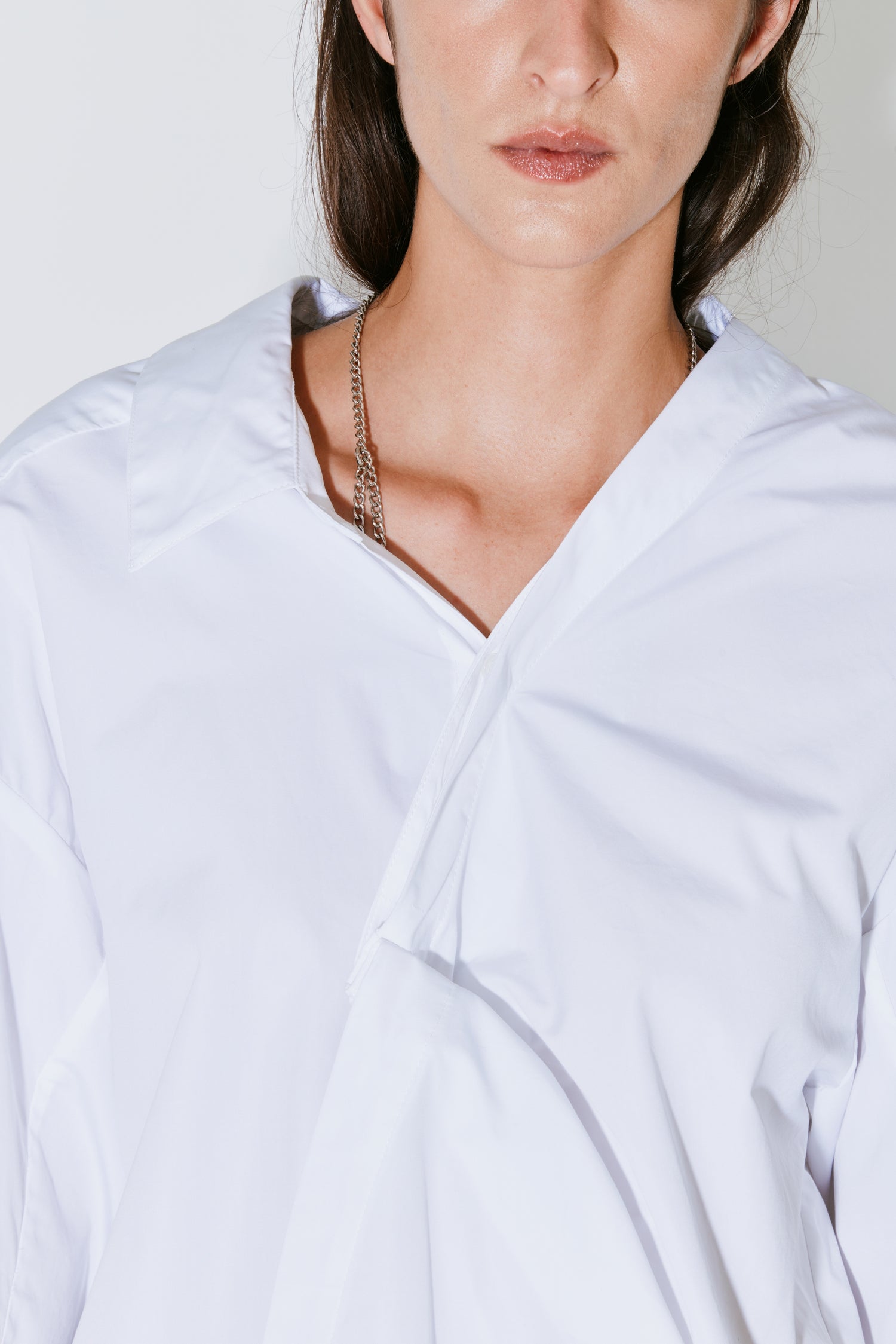 CHARLES is a deconstructed shirt crafted from white Italian popeline. Features deliberately misplaced buttons. Designed with an off-kilter tailoring approach. Cut to a relaxed silhouette.