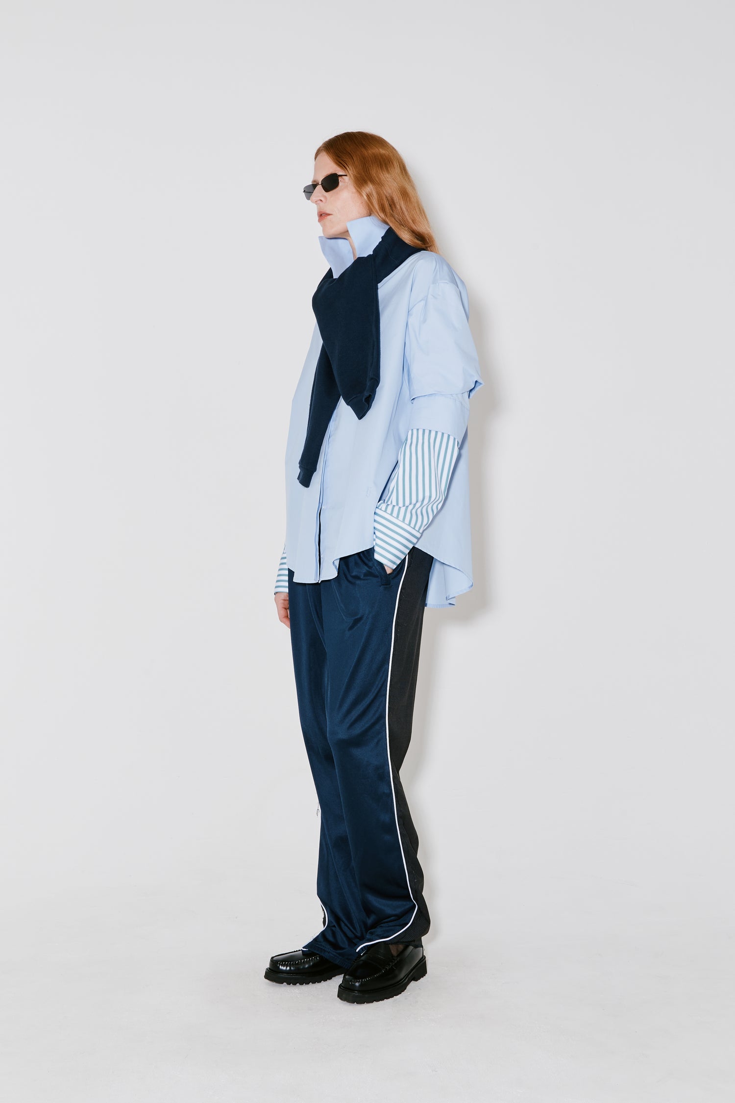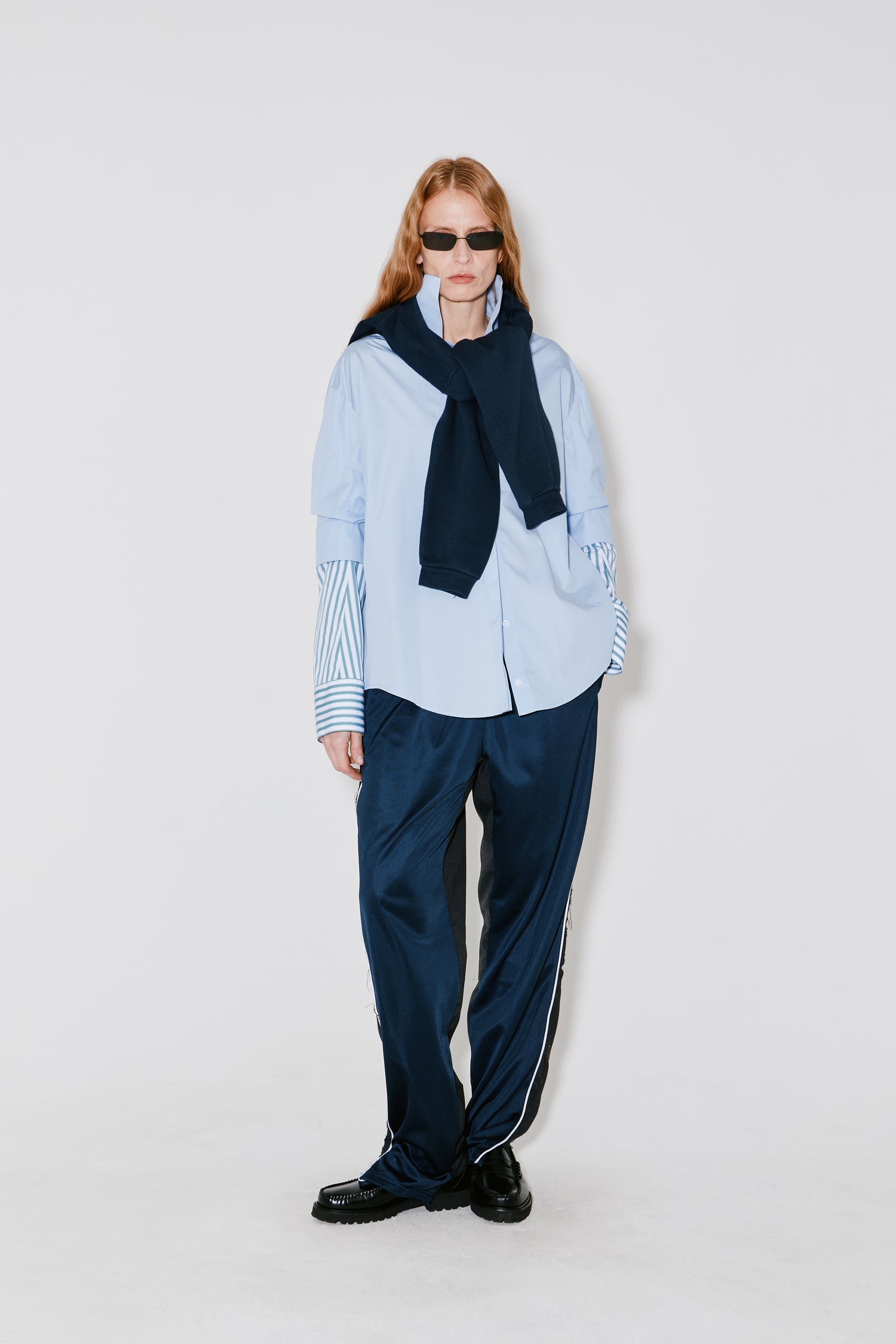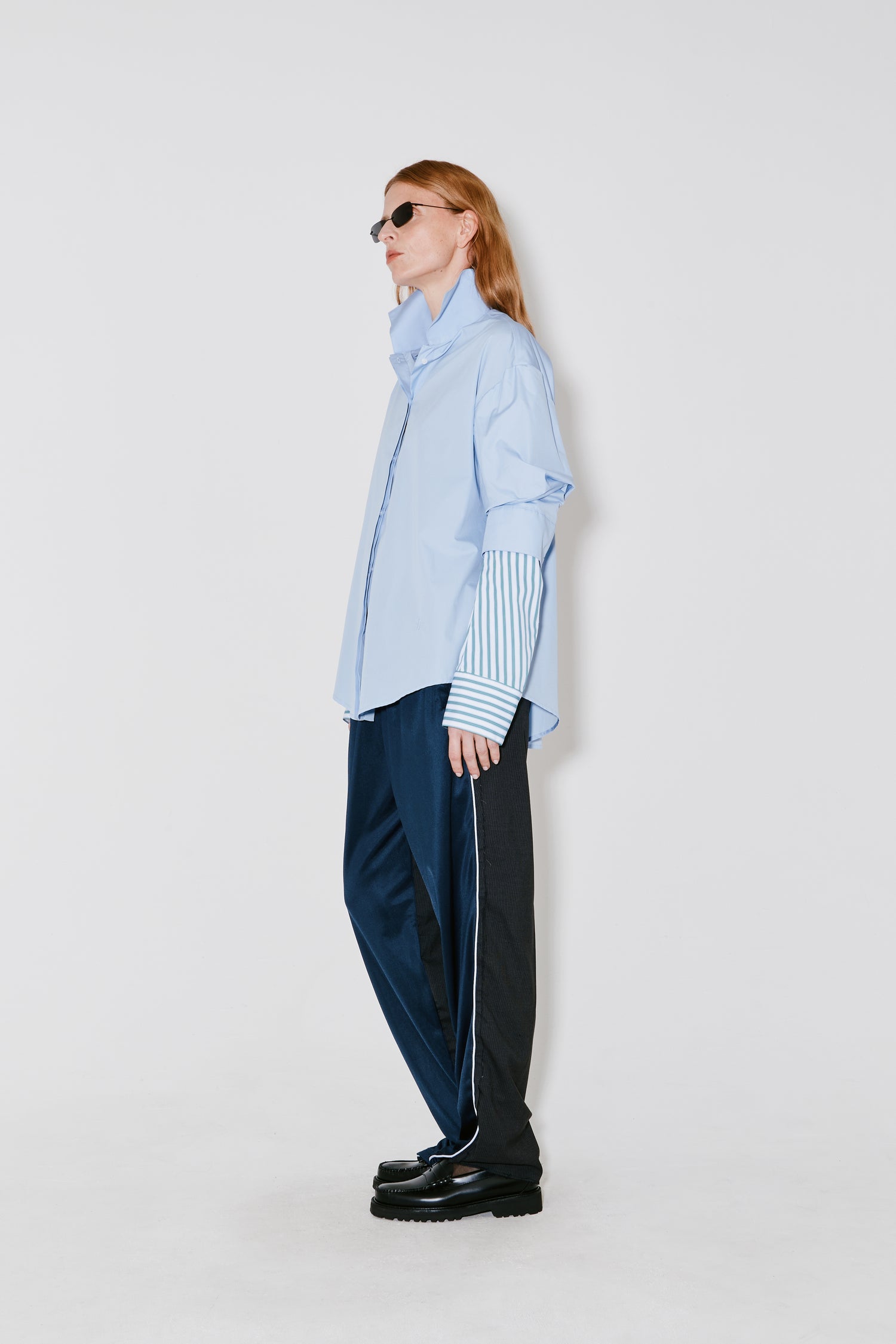 COSMO is a trompe-l’œil shirt in light blue Italian poplin with green striped inserts. Features a layered sleeve construction that creates the illusion of two shirts worn together. Designed with a sharp & high collar, button front closure, and a curved hem. Cut to a relaxed, oversized silhouette.