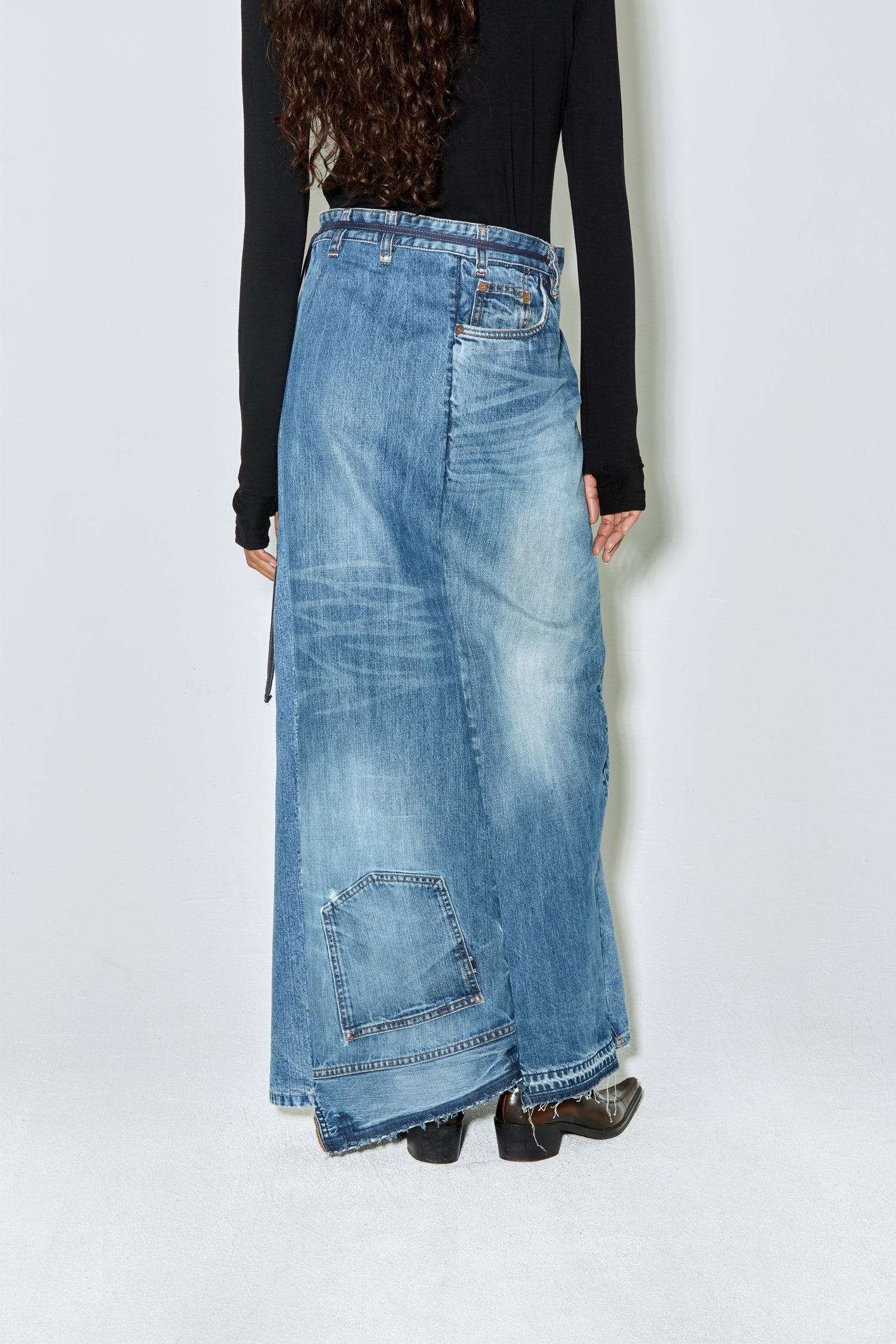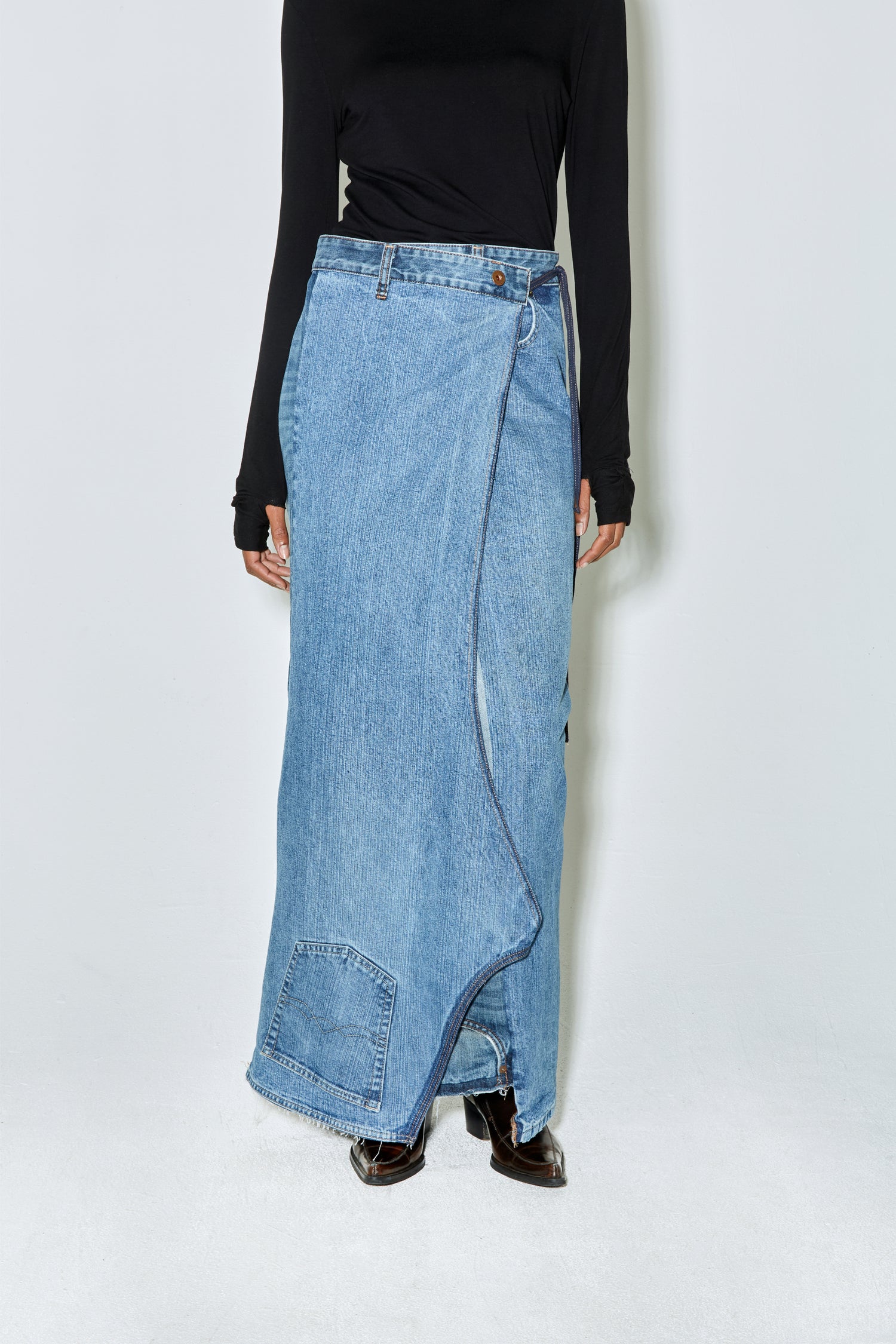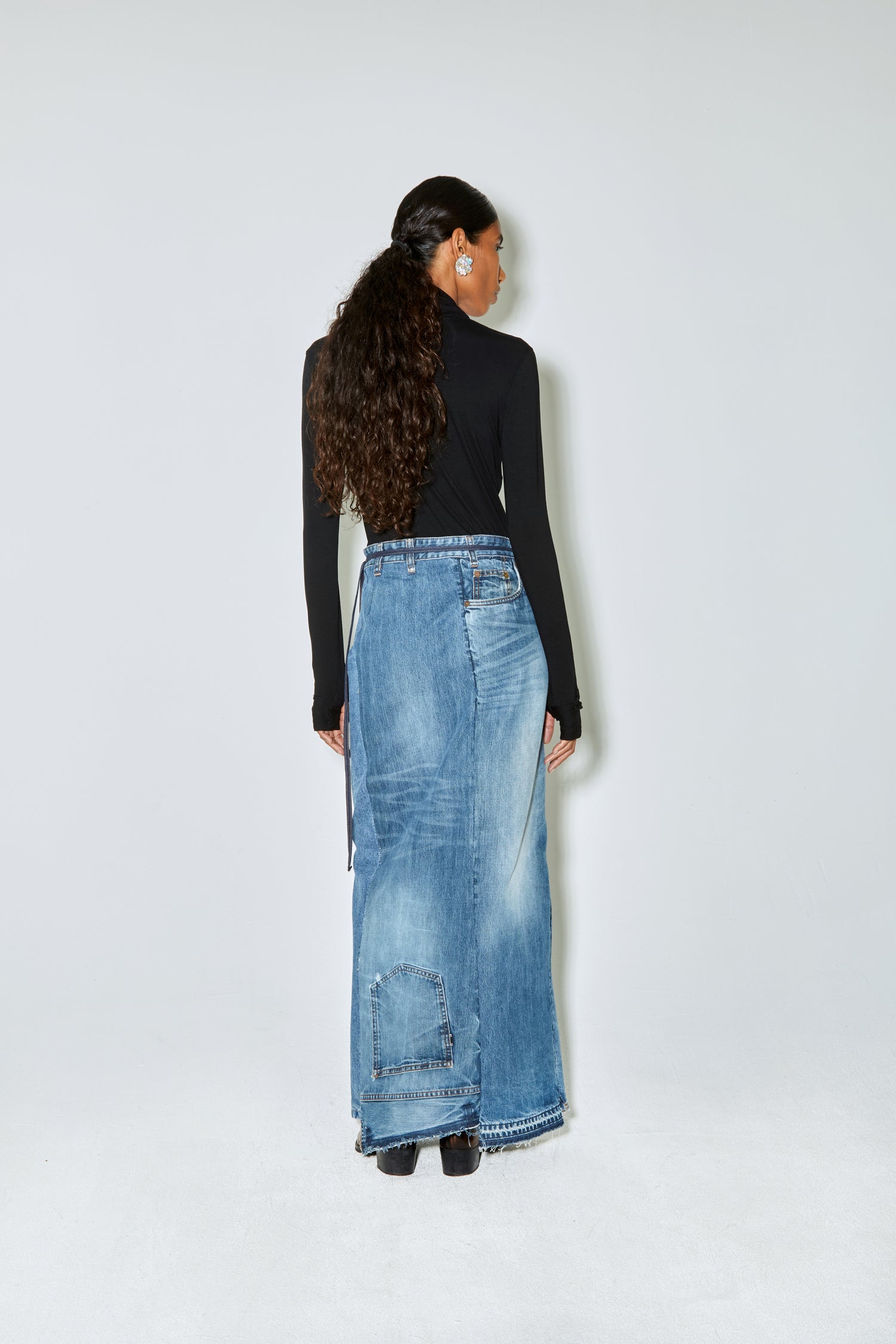 JELLIE is a reconstructed upcycled pareo skirt made with second hand blue jeans. Features an upside down design, complete with raw edge finishings at the bottom.