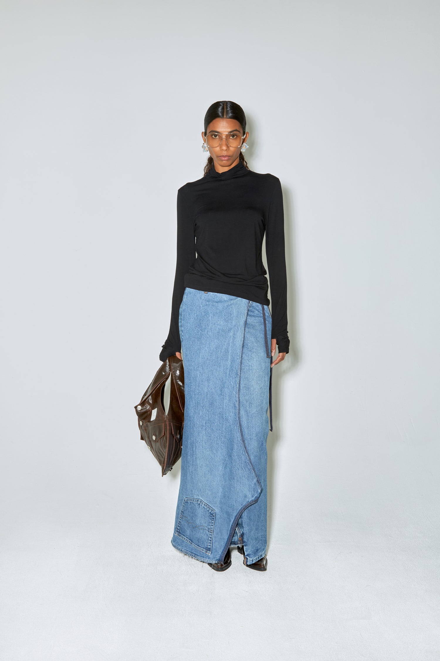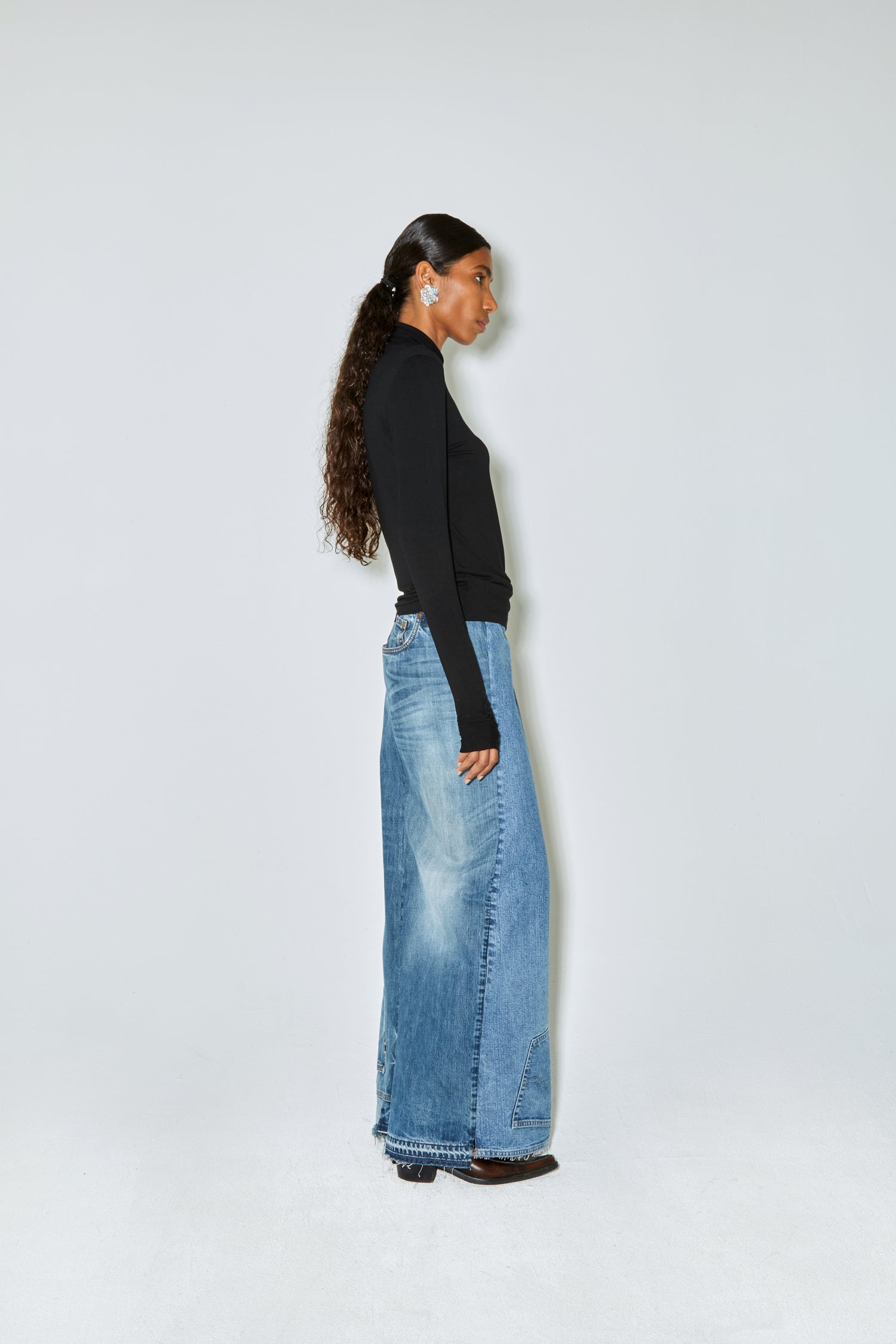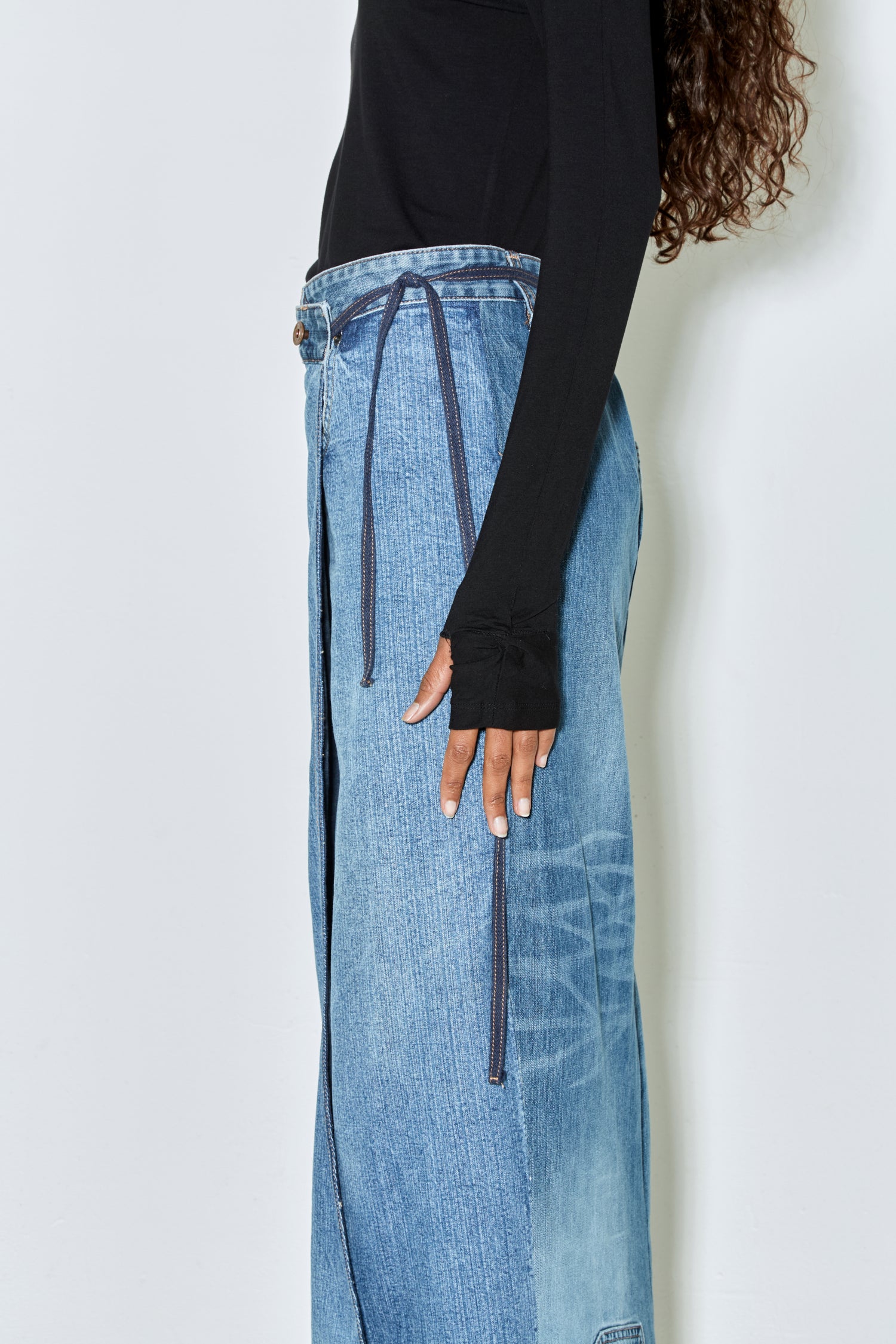 JELLIE is a reconstructed upcycled pareo skirt made with second hand blue jeans. Features an upside down design, complete with raw edge finishings at the bottom.