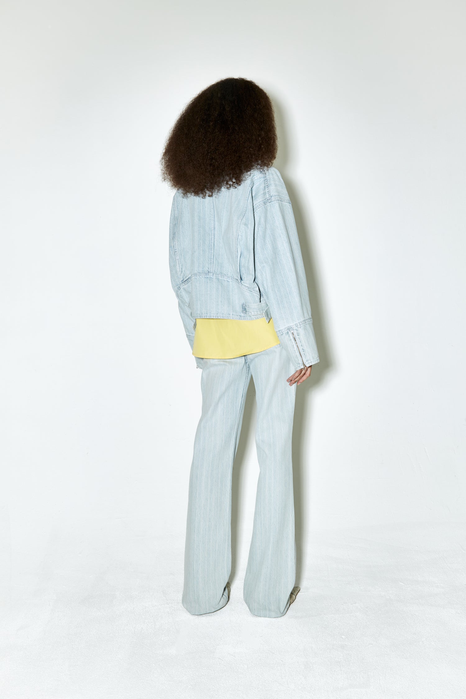 MACFLY is a wide jacket made with a light blue striped denim. Features a boxy relaxed fit complete with side seam pockets, front zipper closure & zips at the bottom sleeves. The perfect item to look put-together while still being comfortable.