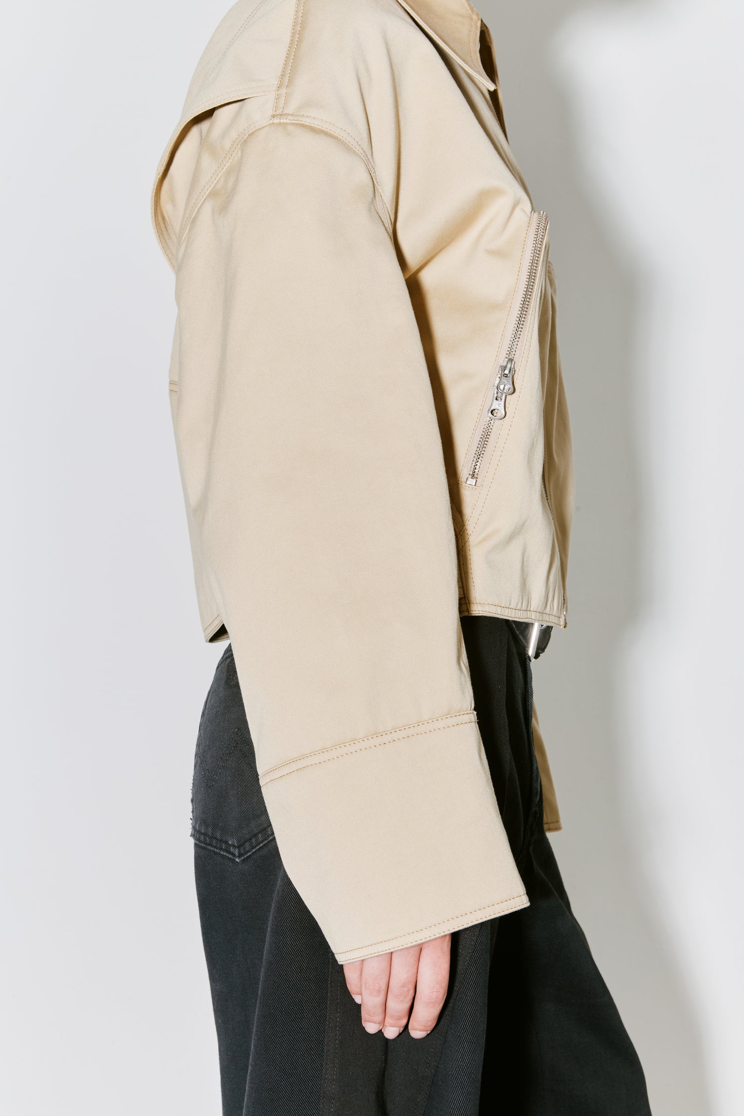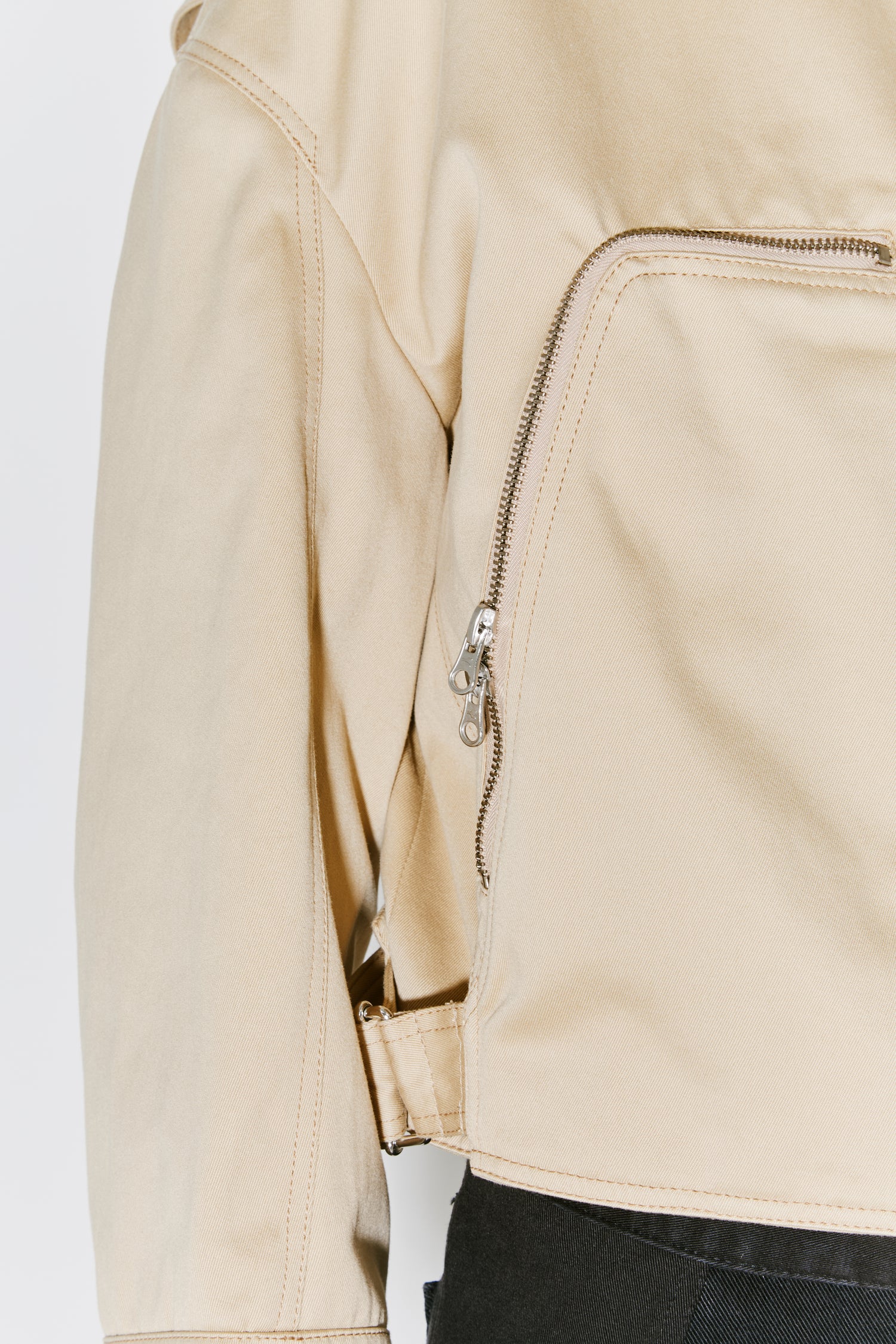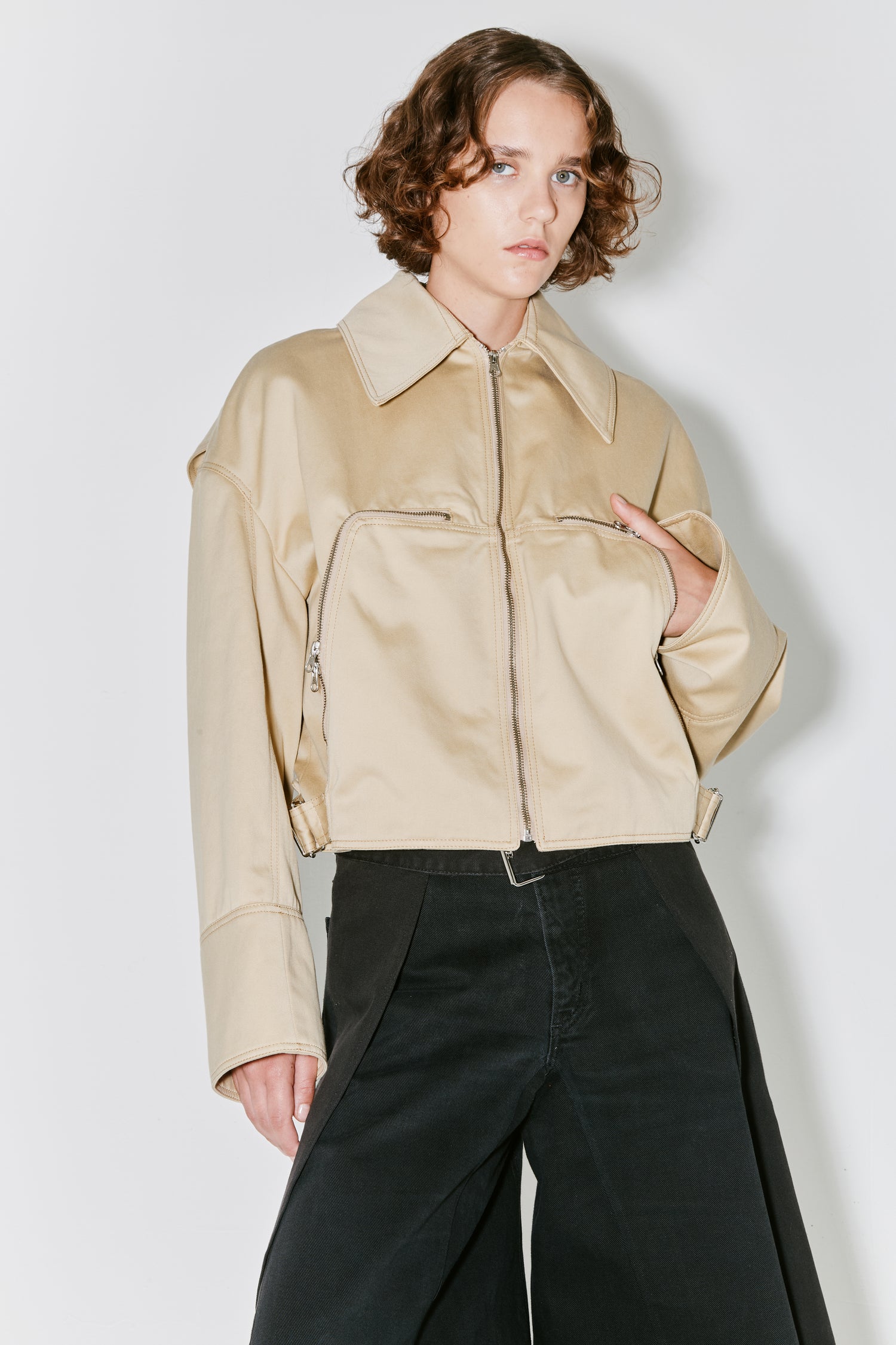 MARTY is the iconic boxy jacket made with Italian beige gabardine cotton. Features a relaxed fit, complete with external double slider zip pockets with a sleek zipper closure.