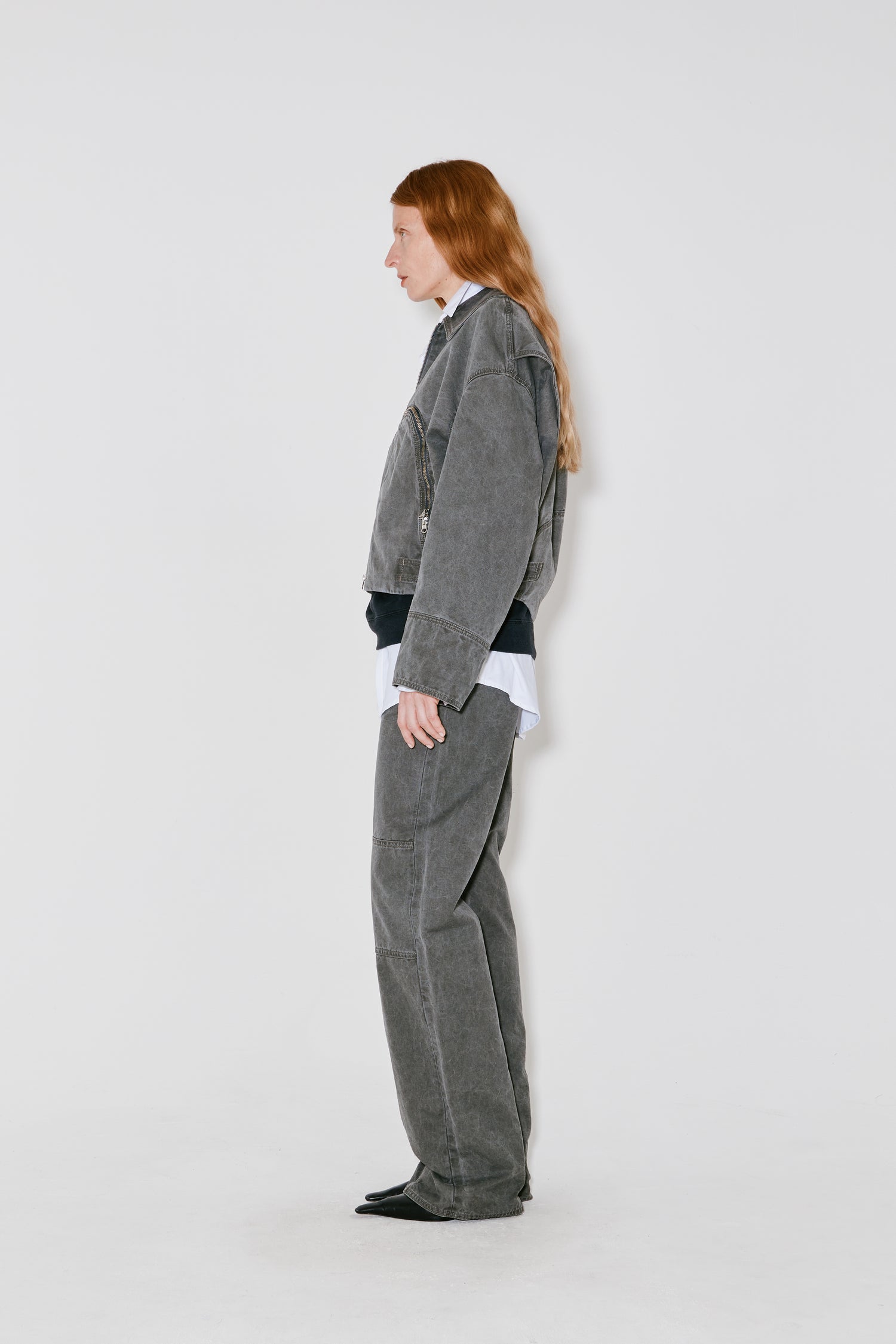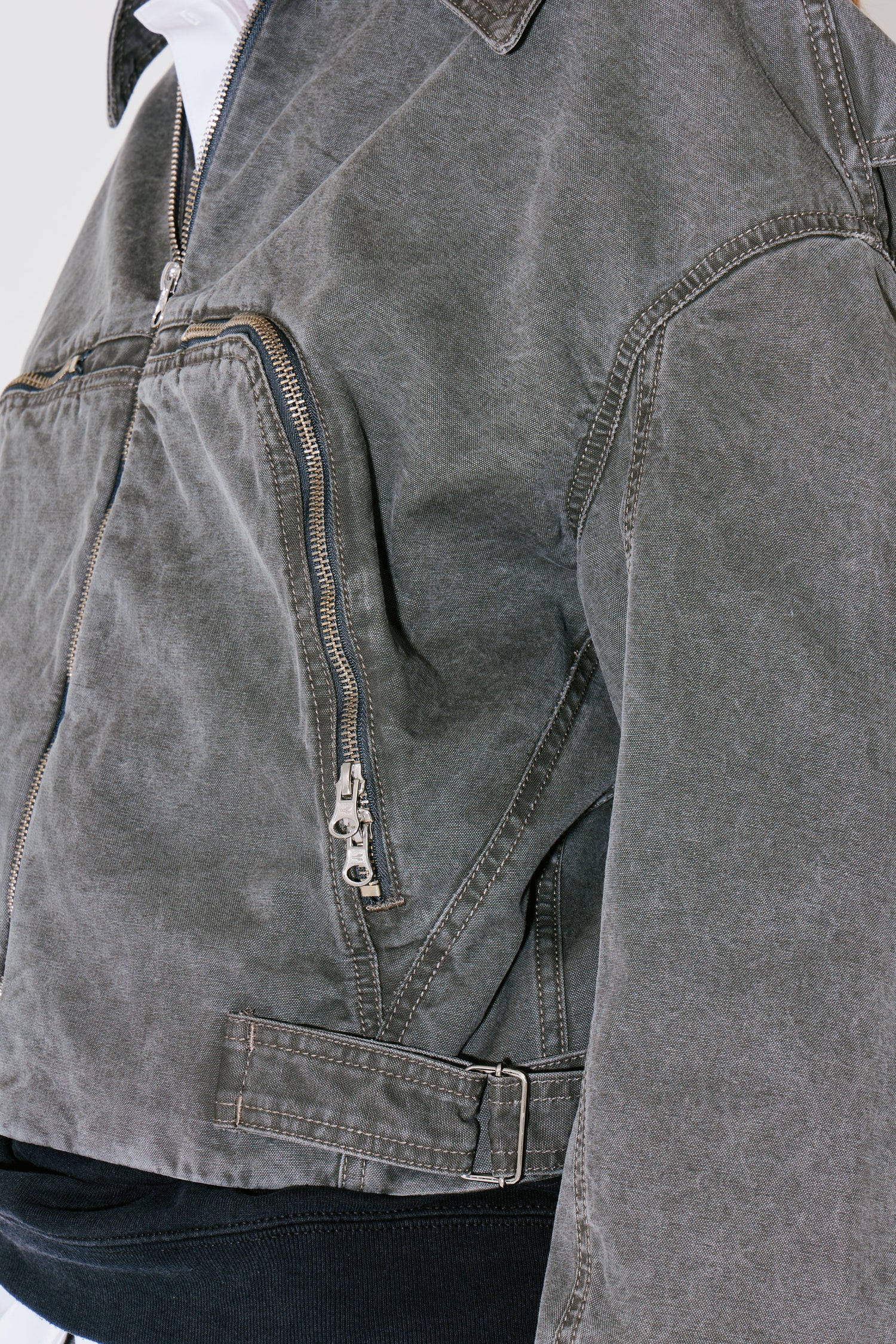 MARTY is the iconic boxy jacket in structured grey olive Italian cotton. Features a sharp collar, sleek two-way zip closure, and exposed zip pockets at the chest. Designed with dropped shoulders and raw-cut cuffs. Finished with a clean, straight hem. Cut to a cropped, wide silhouette.