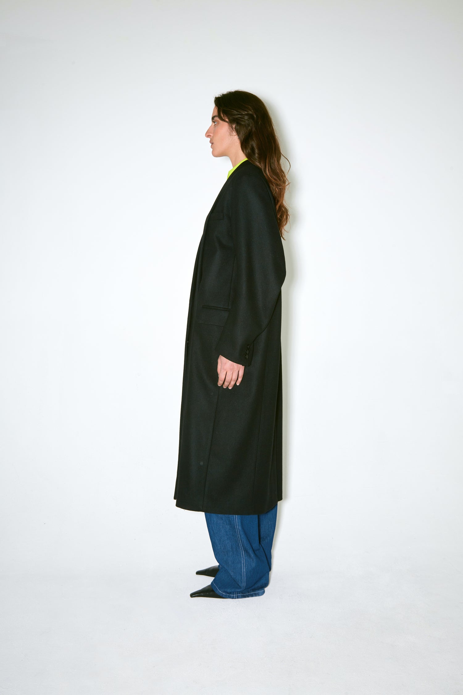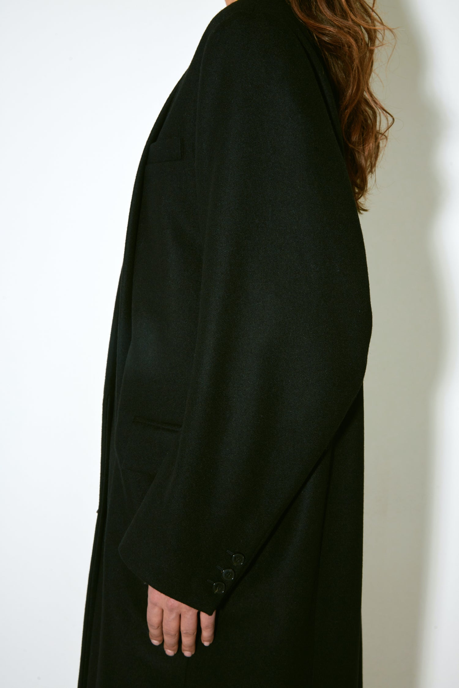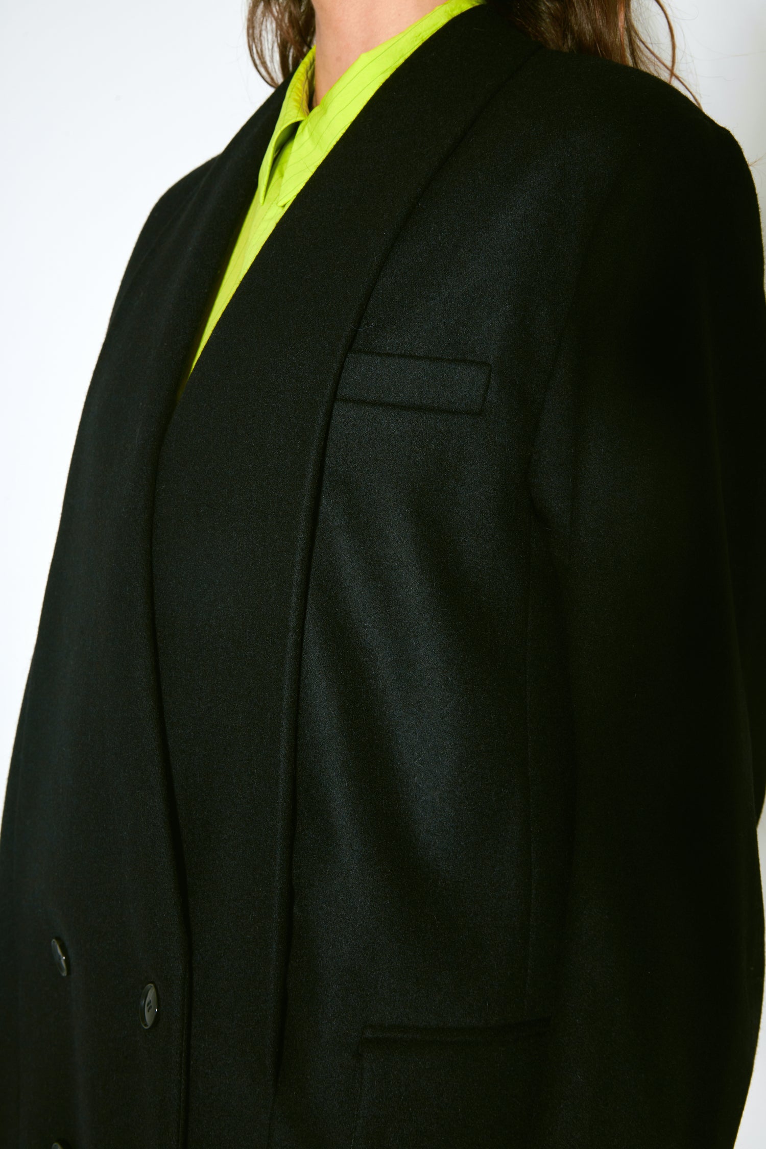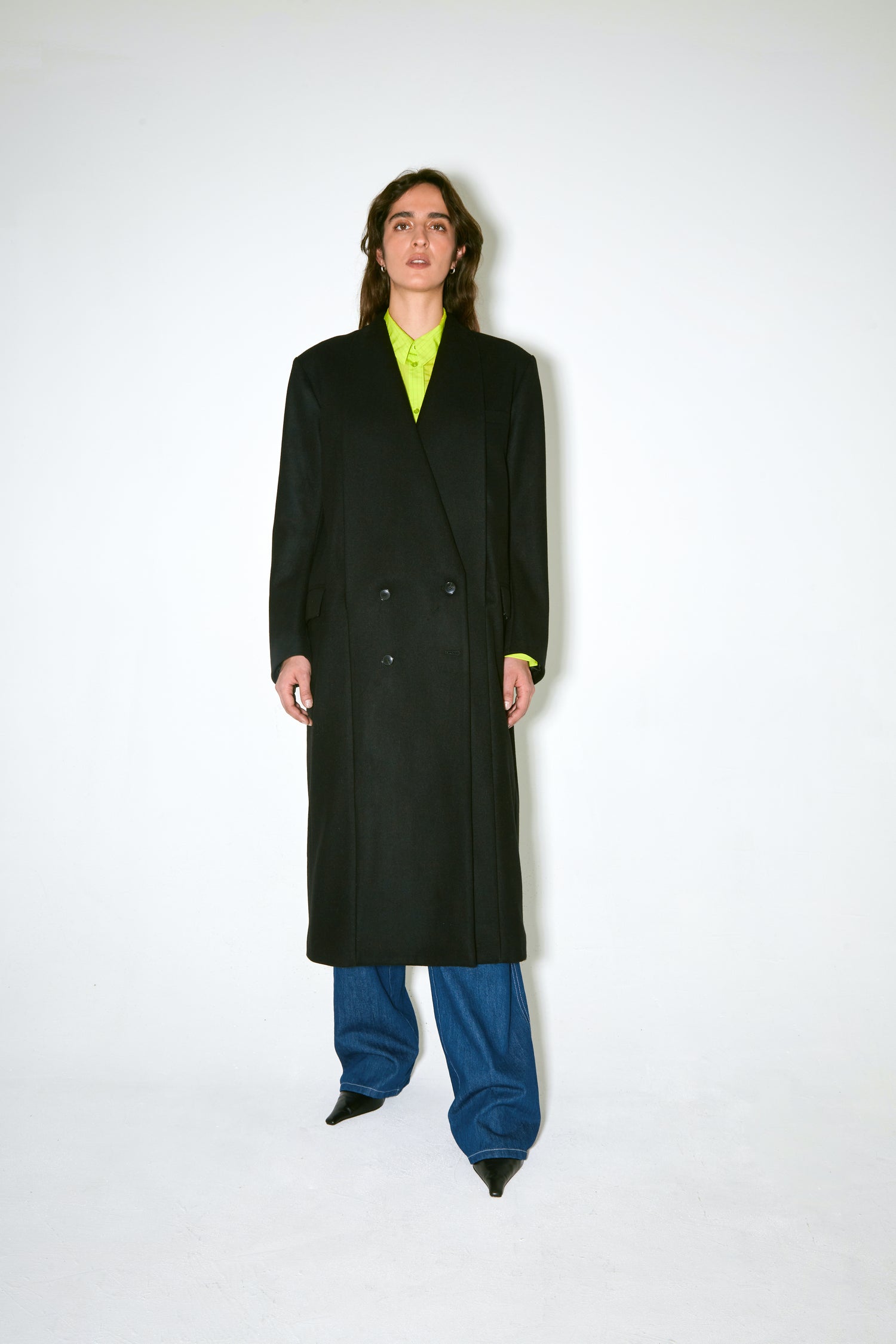 MEDEA is a black pleated coat made of high-quality Italian wool. The oversized fit with padded shoulders creates an elegant and stylish look.