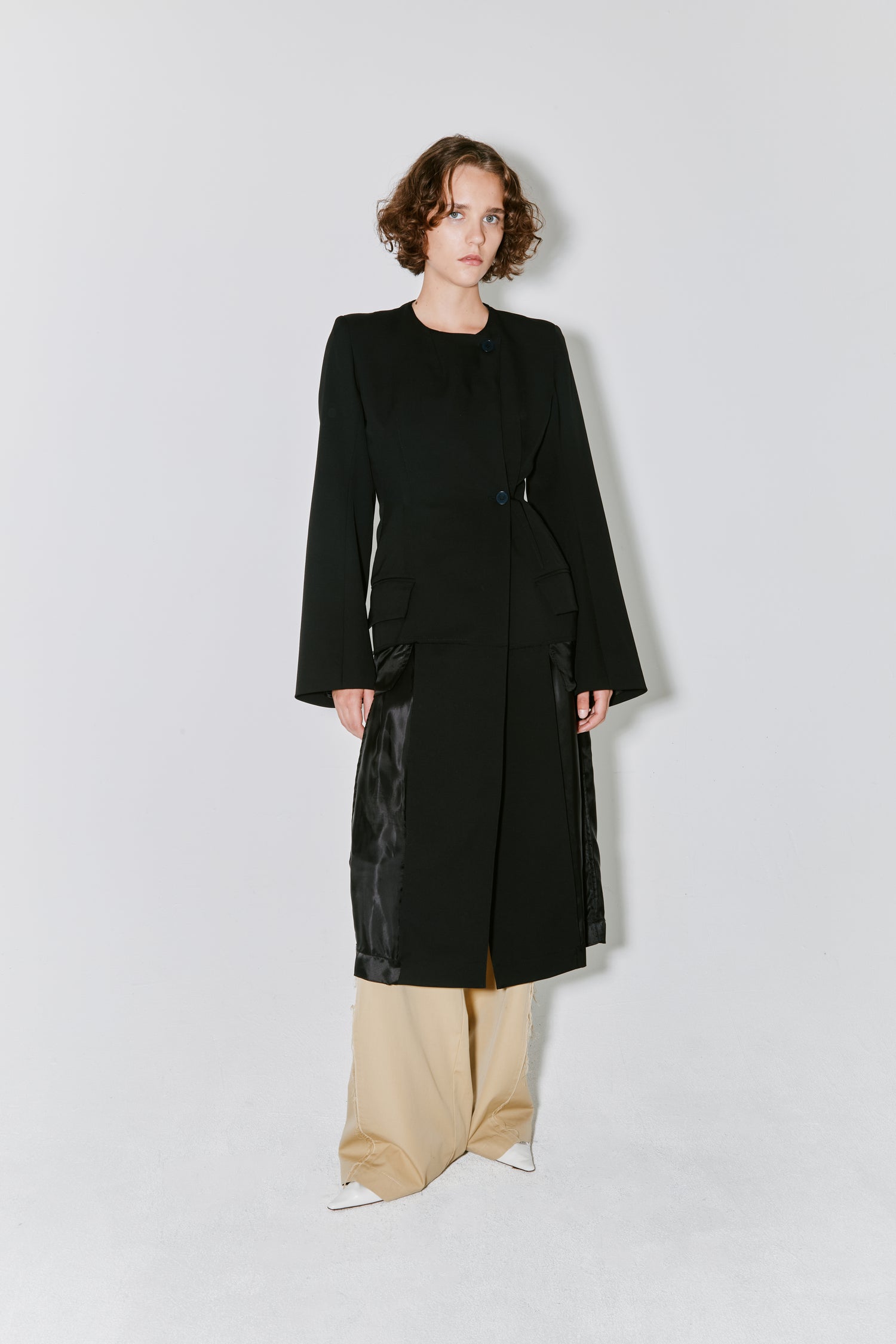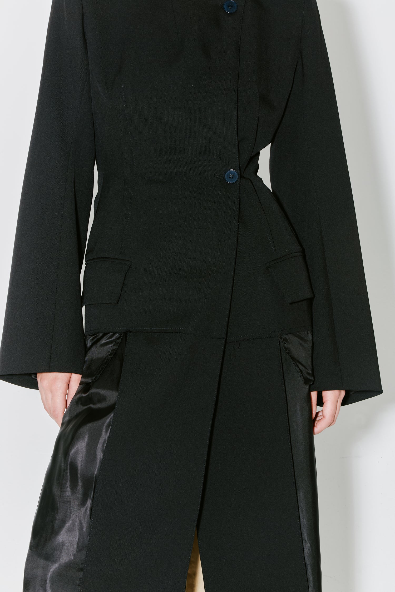MOA is a bi-fabric fitted coat in black Italian light twill wool featuring a button closure, fitted waist and trompe-l’œil. Illusion that the bottom of the coat was cutted to reveal the lining and to make it lighter for spring season.