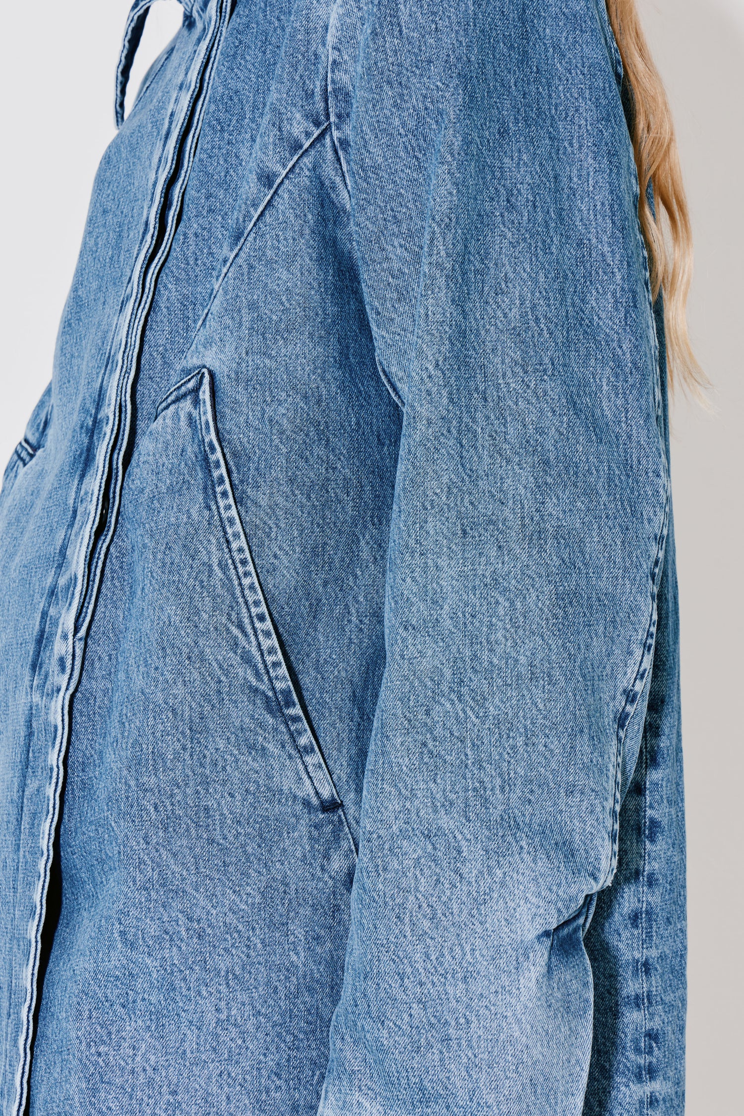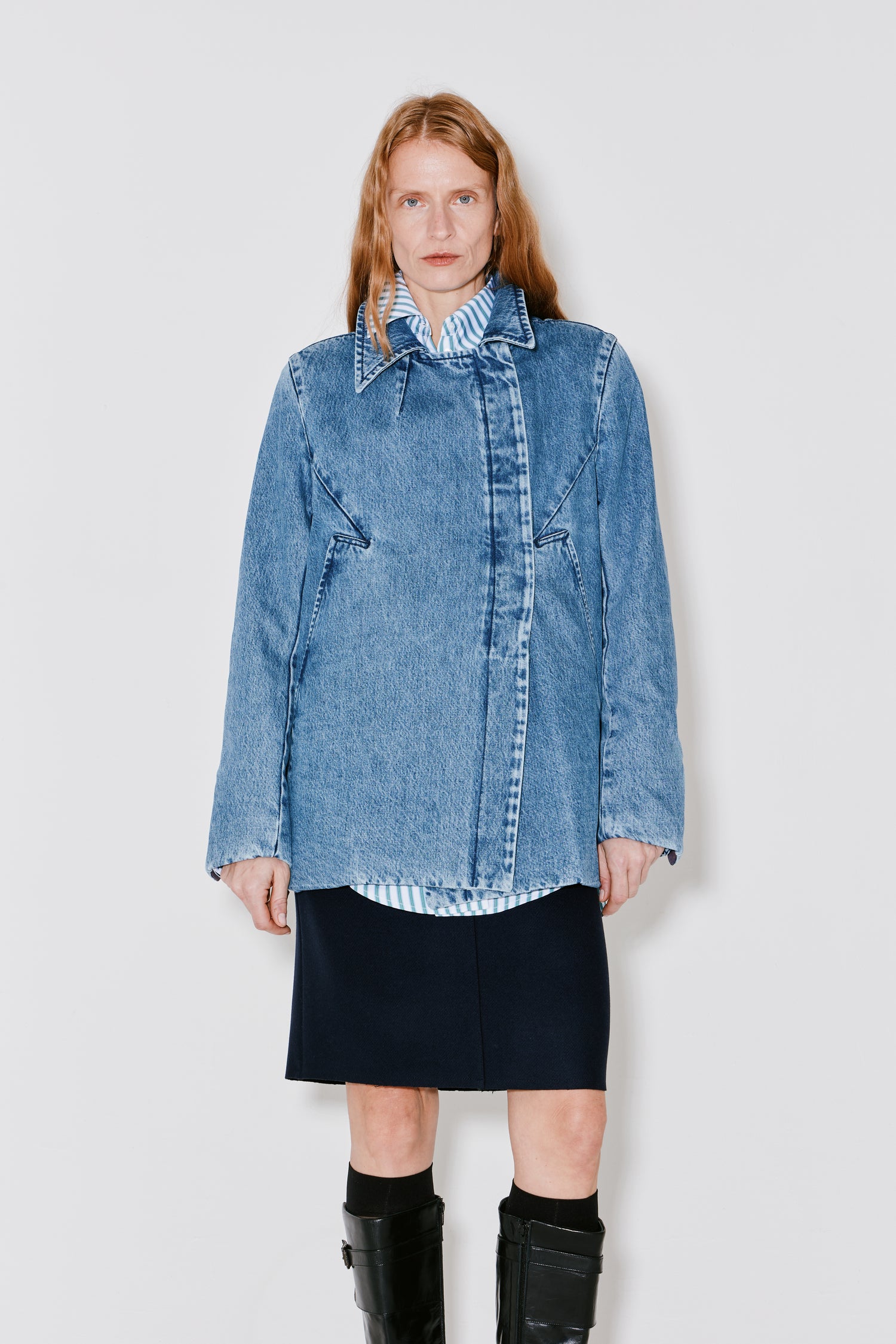 MYSSONY is a peacoat cut from light blue Italian cotton denim with a structured, mid-weight feel. Features a classic button front closure, side seam pockets, and a clean back. Cut to a regular/oversized fit and hip-length silhouette.