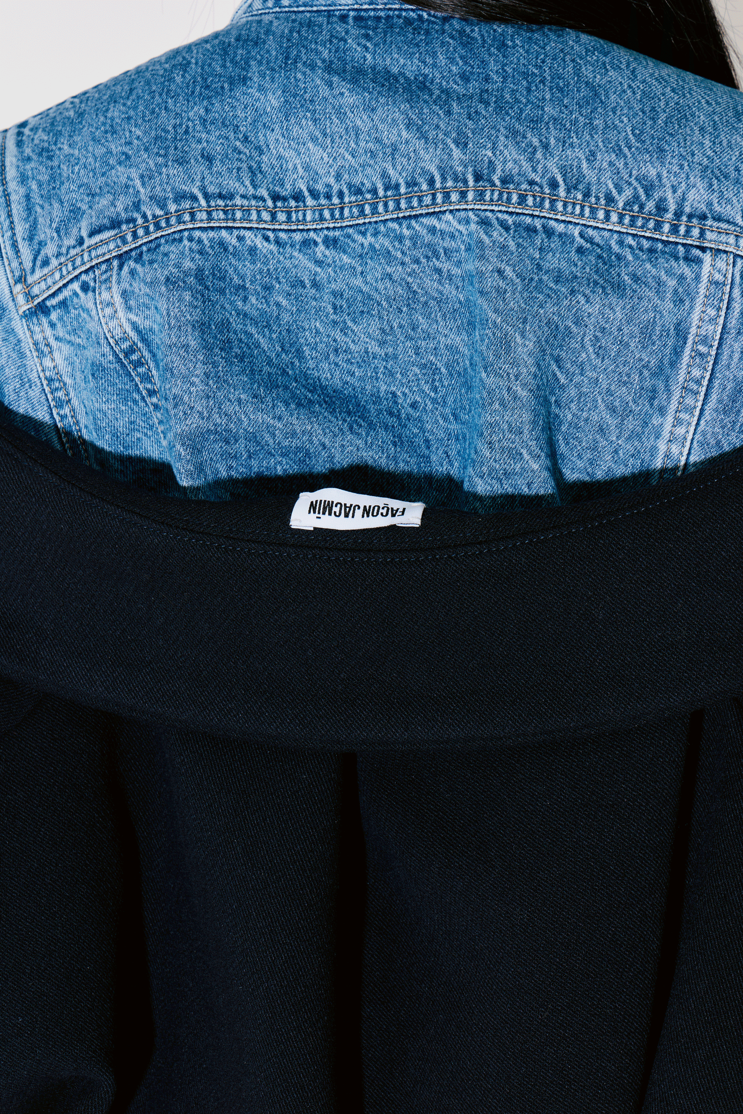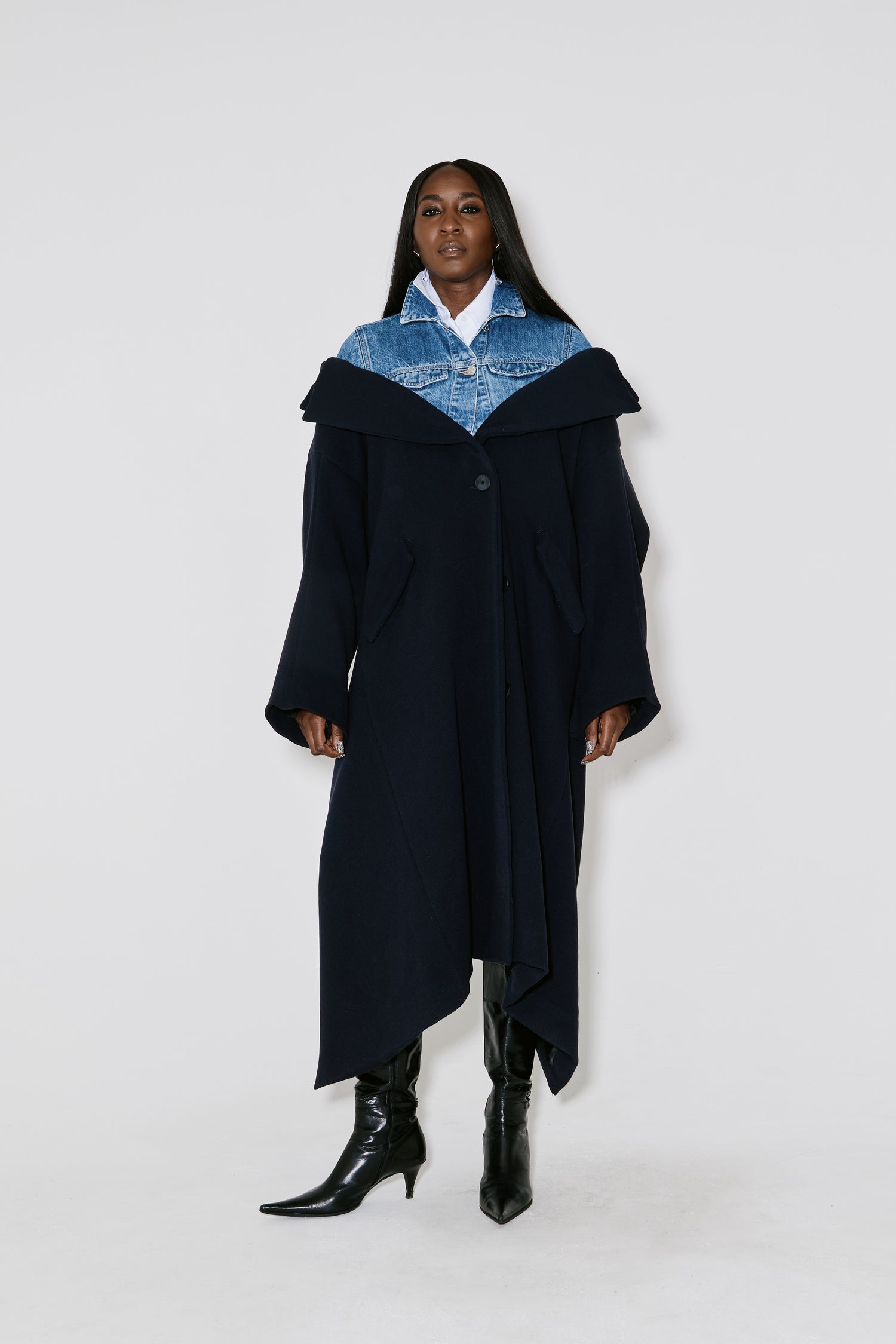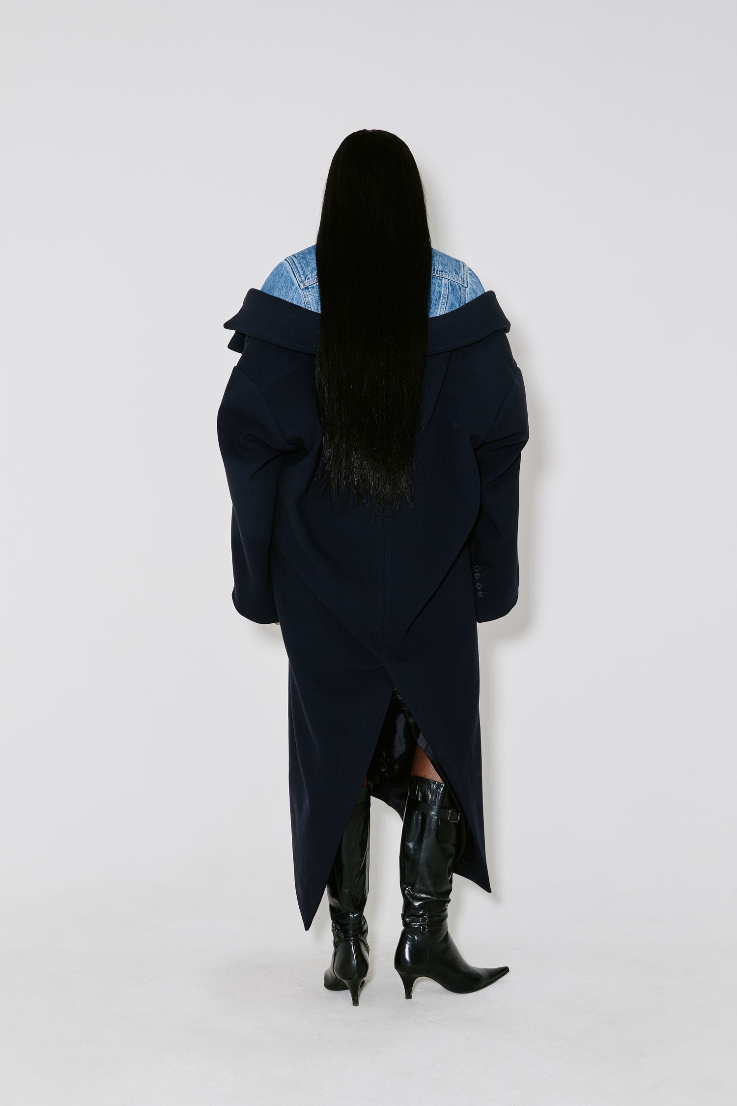 MILADY is a 2-in-1 long coat in dark blue Italian wool with a built-in mid-blue denim jacket detail. Features a wide off-shoulder collar revealing the layered denim element for a trompe-l’œil effect. Designed with a front button closure, side pockets, and a split back hem. Cut to an oversized, ankle-length silhouette.
