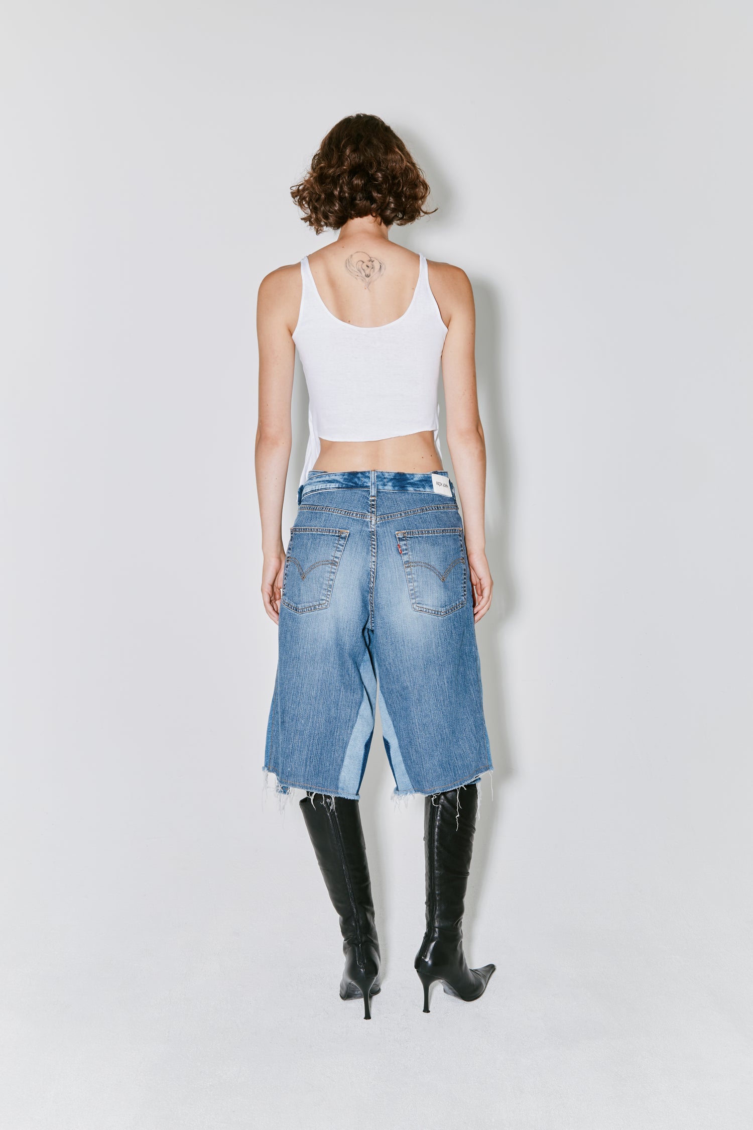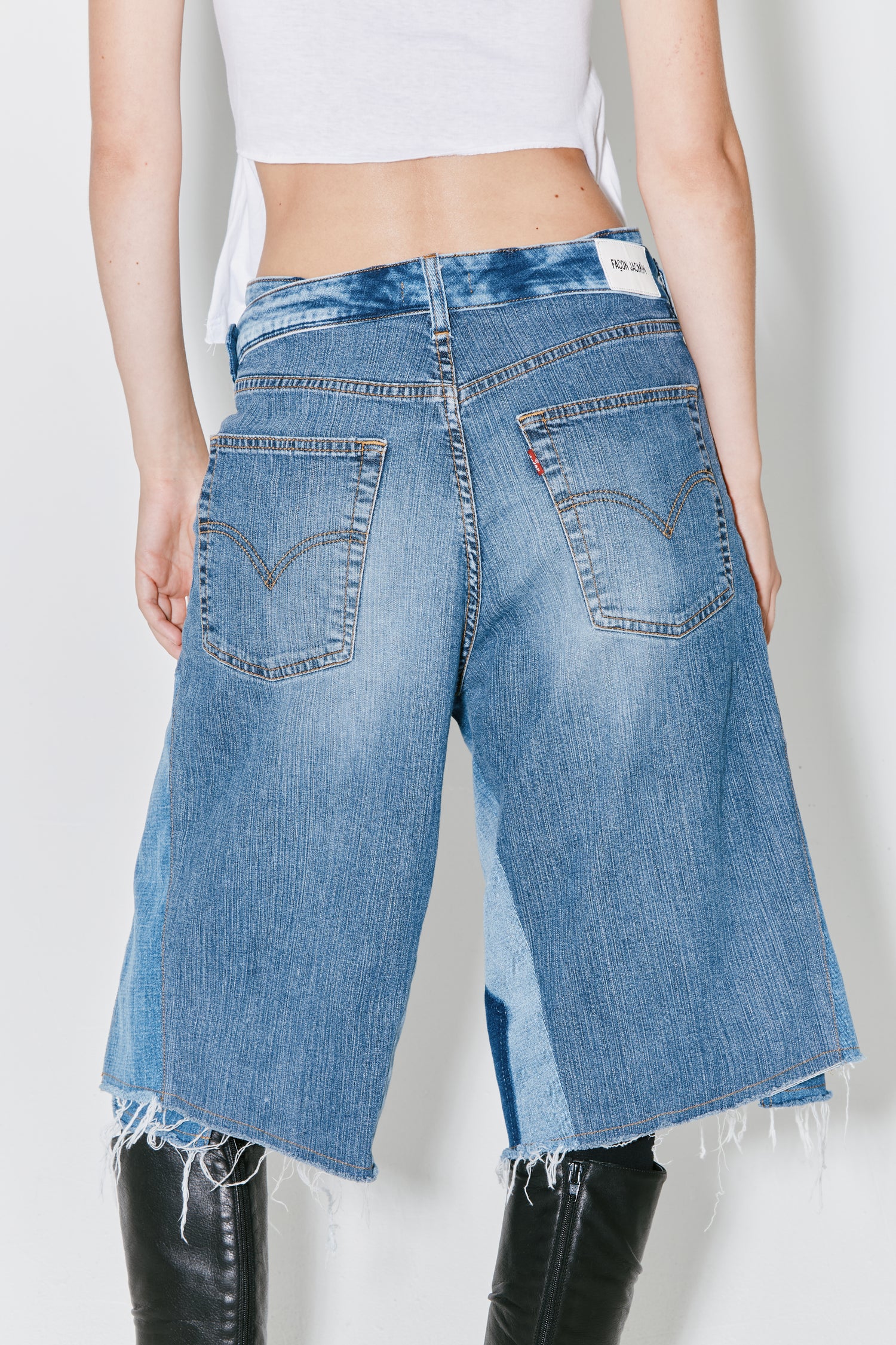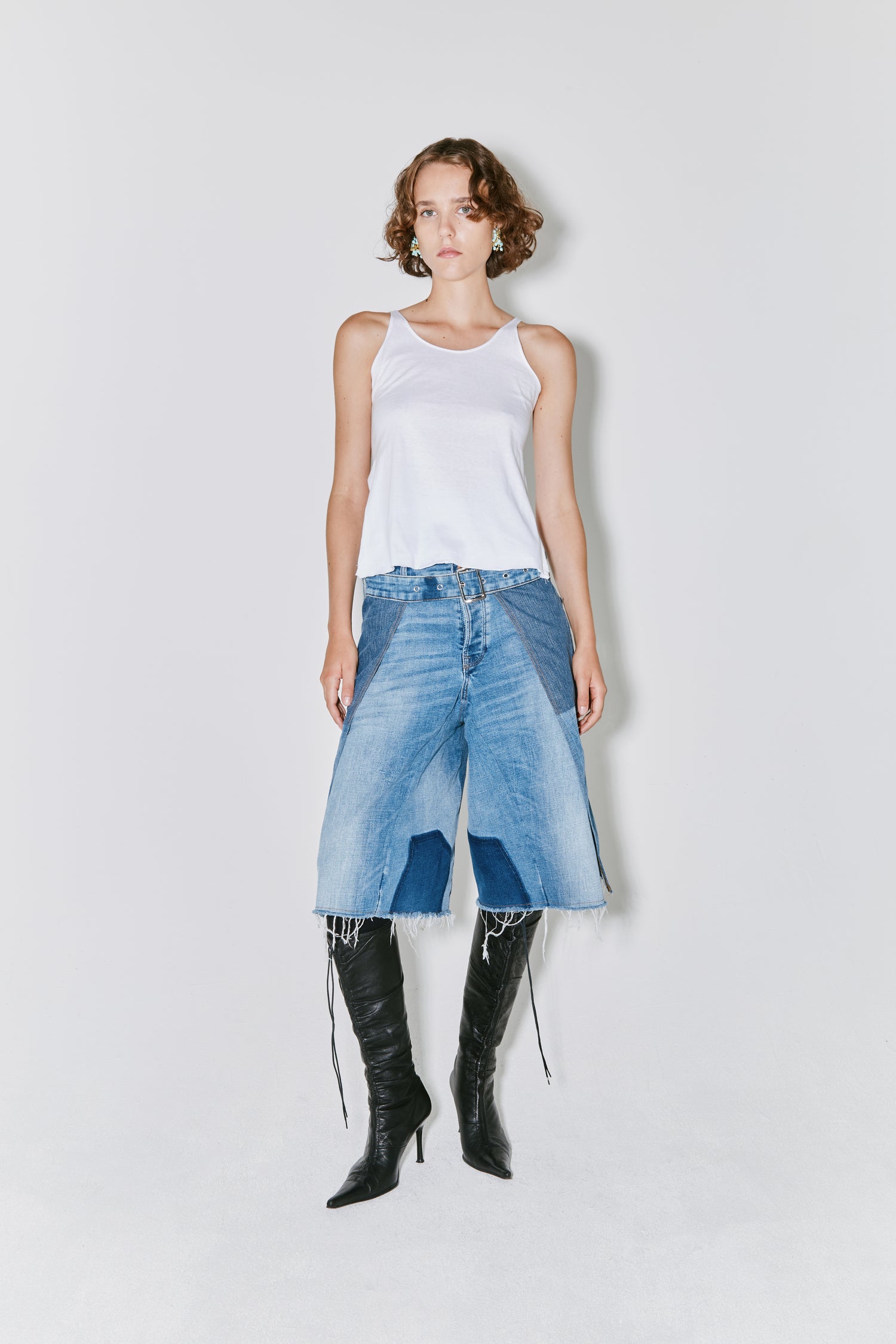 PACI are reimagined upcycled shorts crafted from secondhand denim trousers. With an apron-inspired design, they offer exceptional versatility, allowing for multiple styling options with raw edge finishing at the bottom. These unisex shorts feature a relaxed fit, a tie closure at the back, and an overlapping belt closure at the front for a unique and adjustable look.