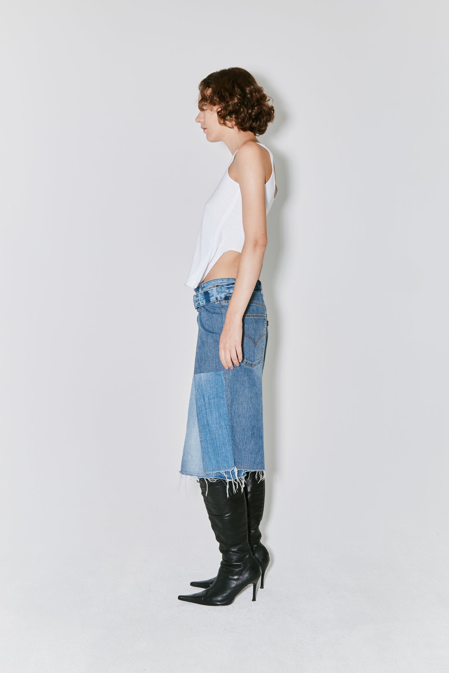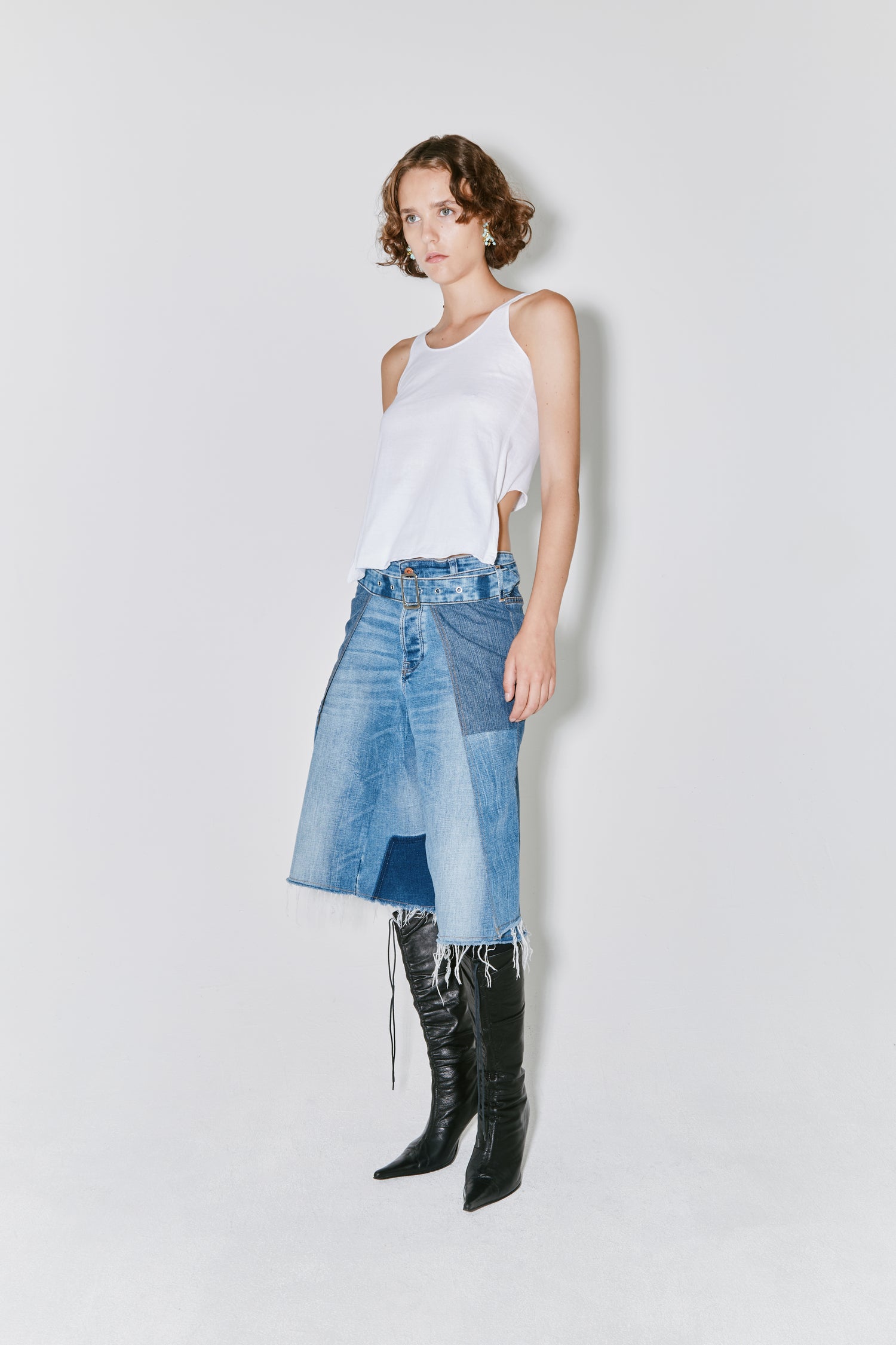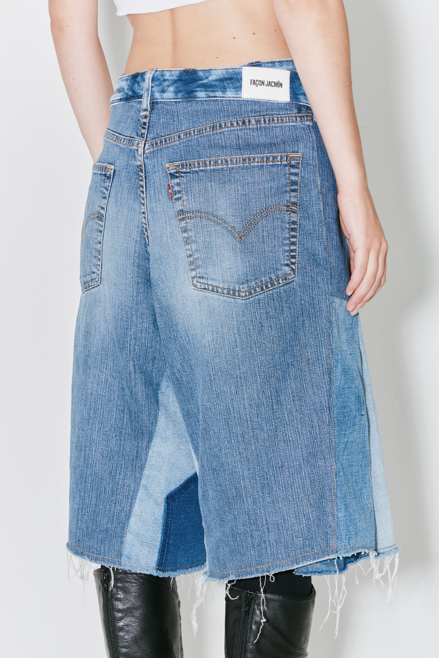 PACI are reimagined upcycled shorts crafted from secondhand denim trousers. With an apron-inspired design, they offer exceptional versatility, allowing for multiple styling options with raw edge finishing at the bottom. These unisex shorts feature a relaxed fit, a tie closure at the back, and an overlapping belt closure at the front for a unique and adjustable look.