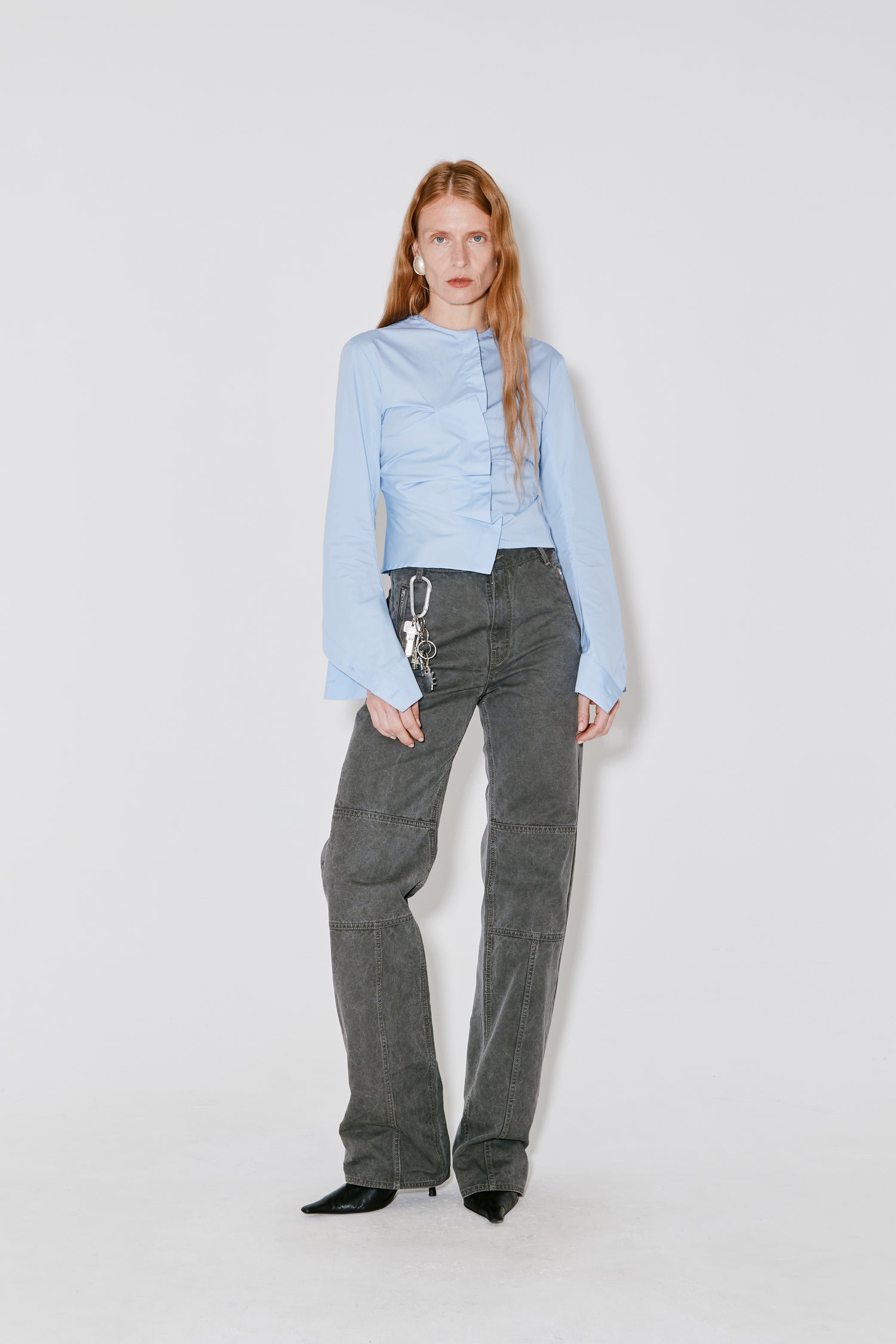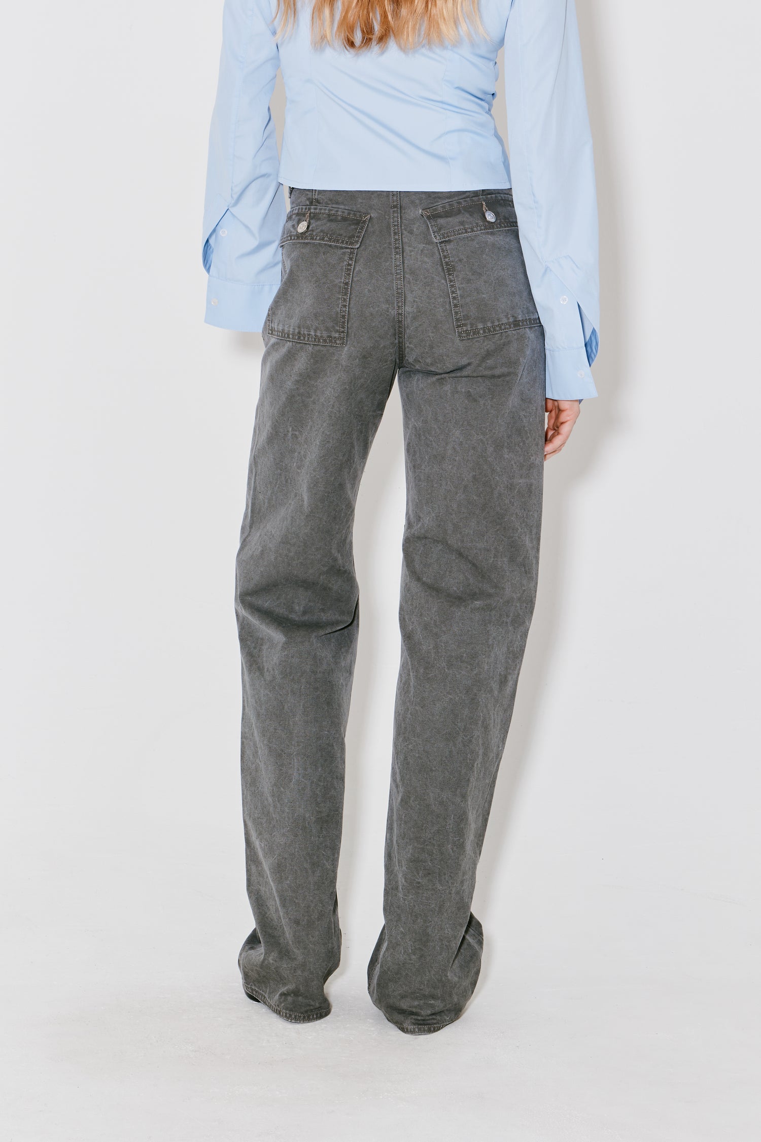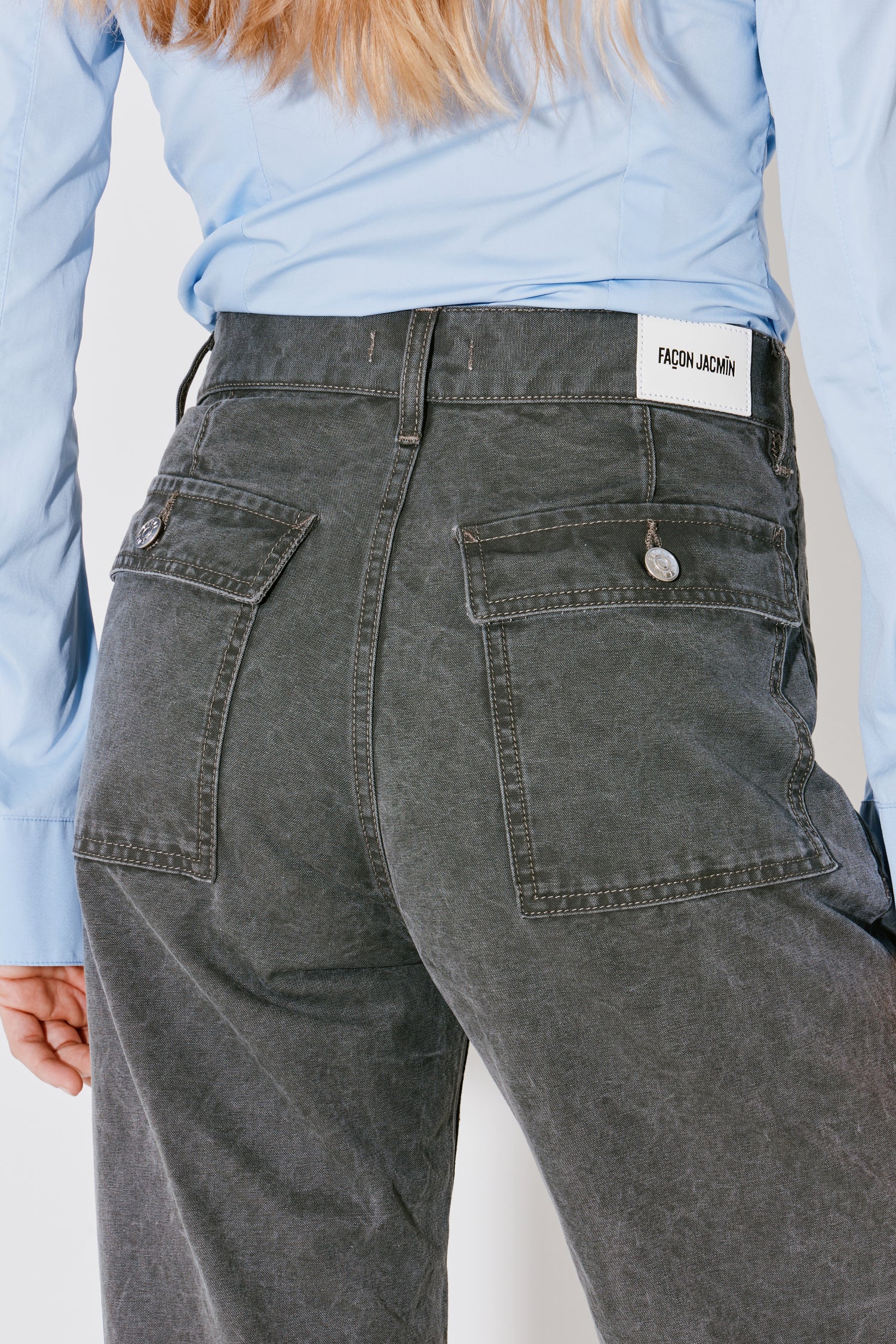PALERMA is a pair of biker-inspired pants in grey olive Italian cotton. Features articulated knee paneling, front and back zip pockets, and a high-rise waist. Finished with a straight leg and tonal stitching for a clean, utilitarian look.