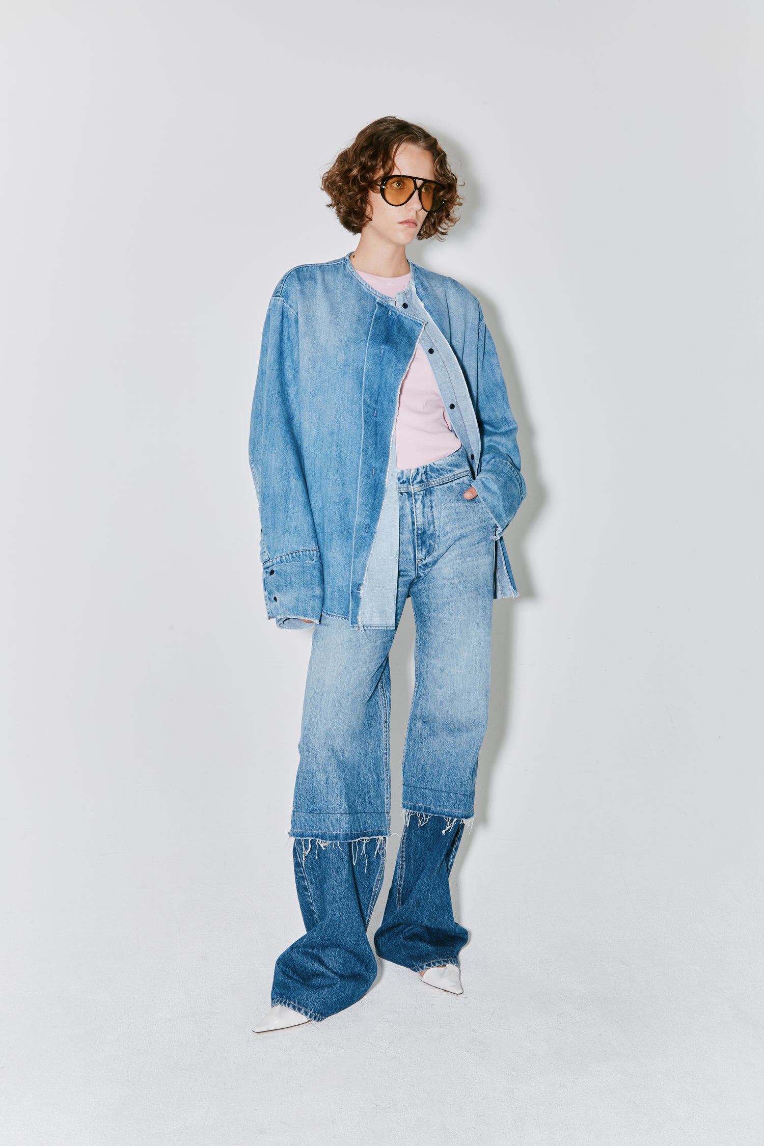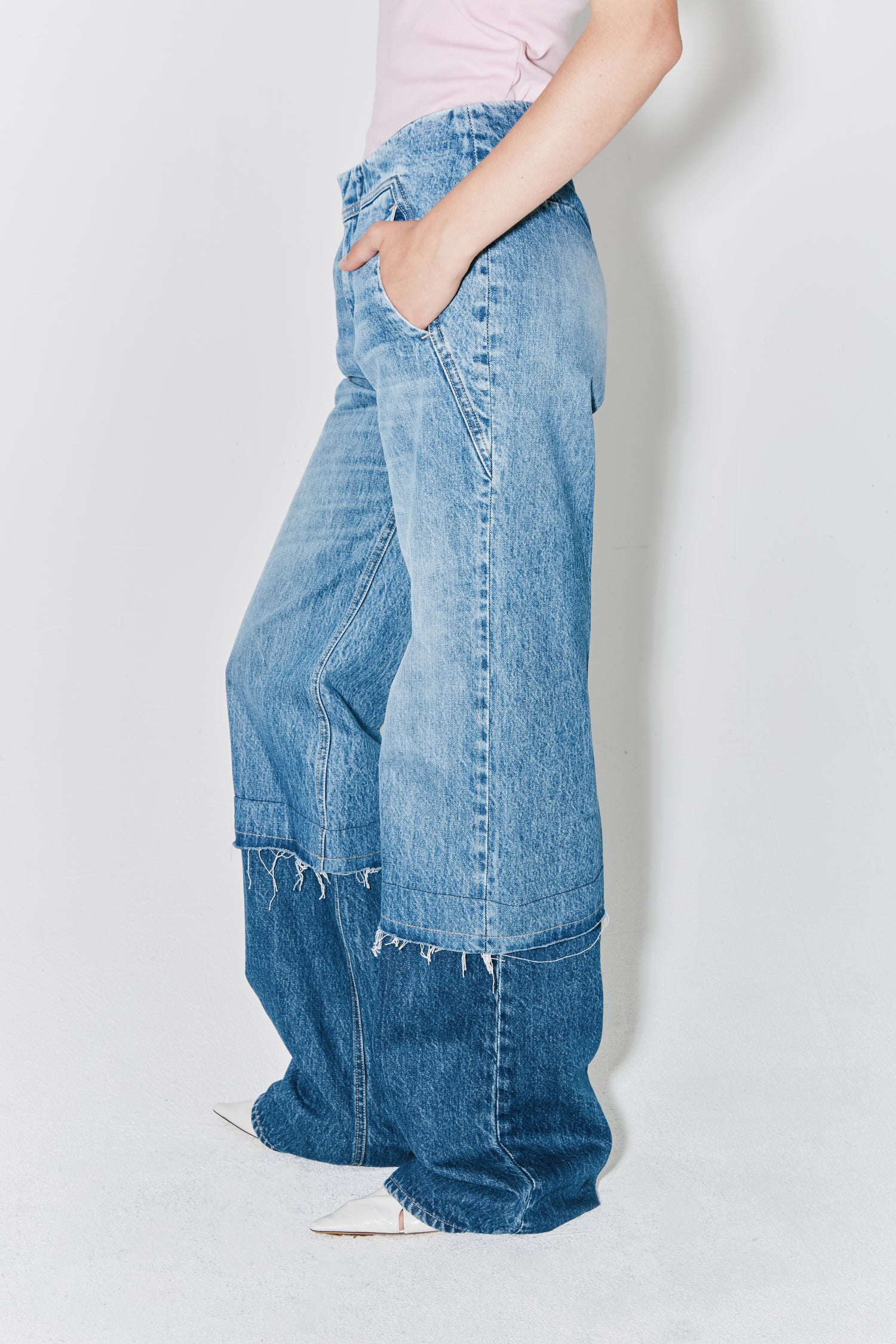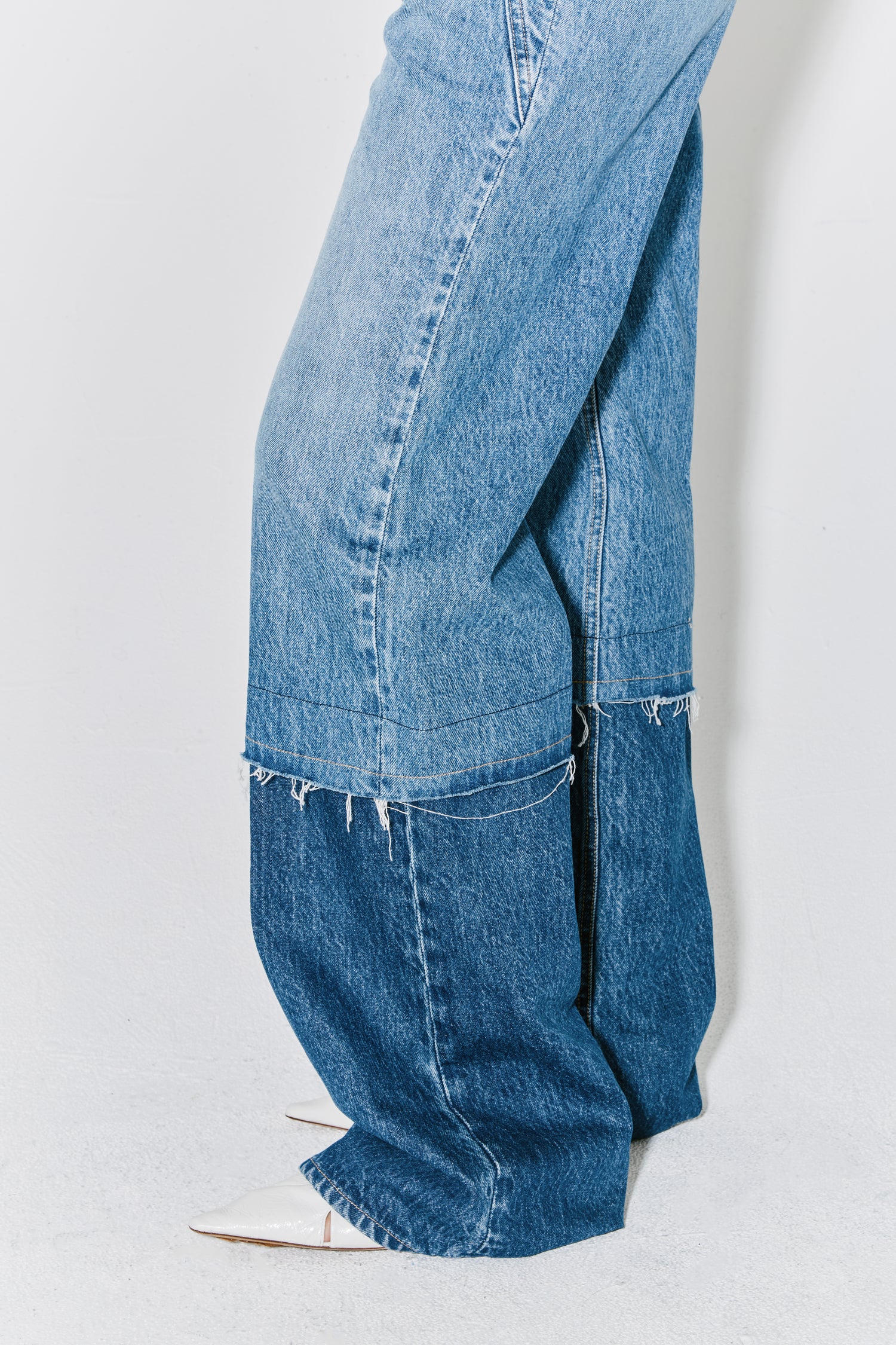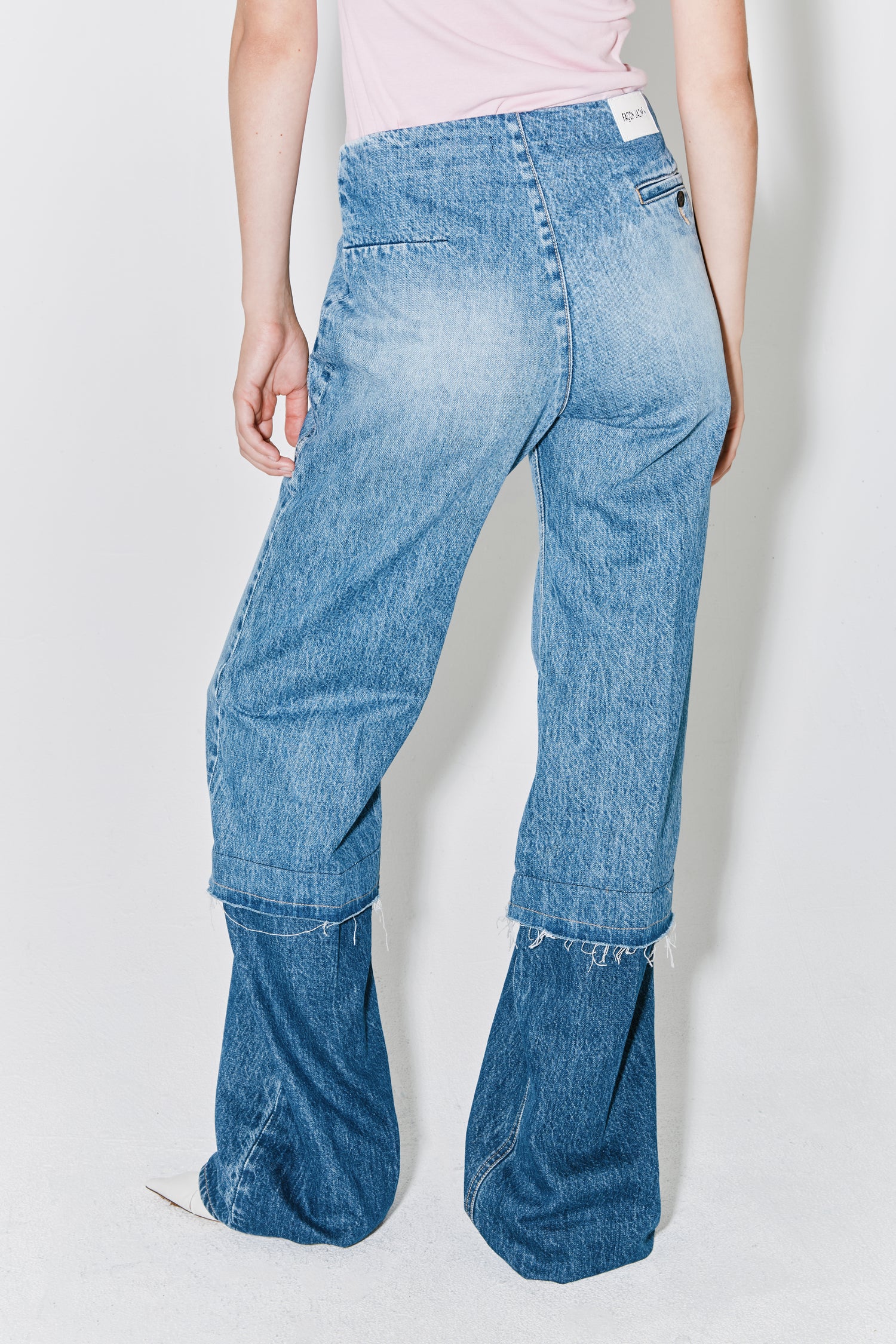 PASSI are Italian blue denim pants. It features a trompe-l’œil effect at the bottom with raw edges, a mid-rise waist, and a relaxed fit.