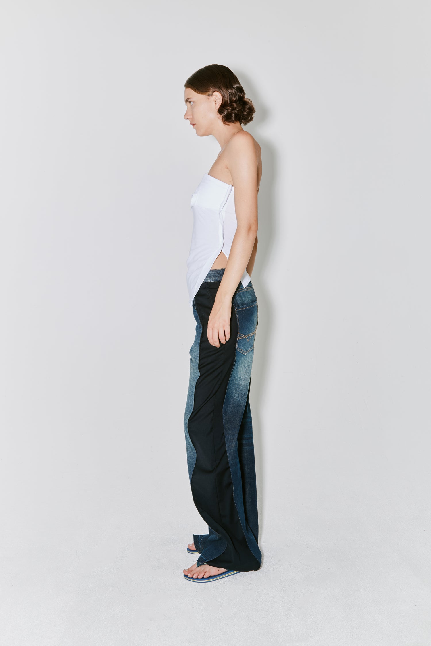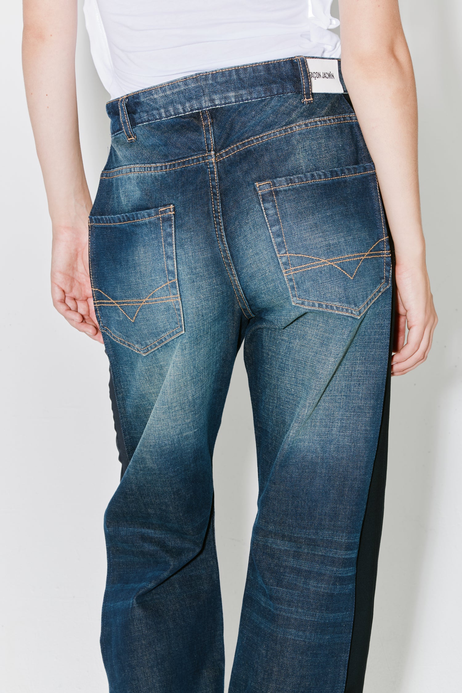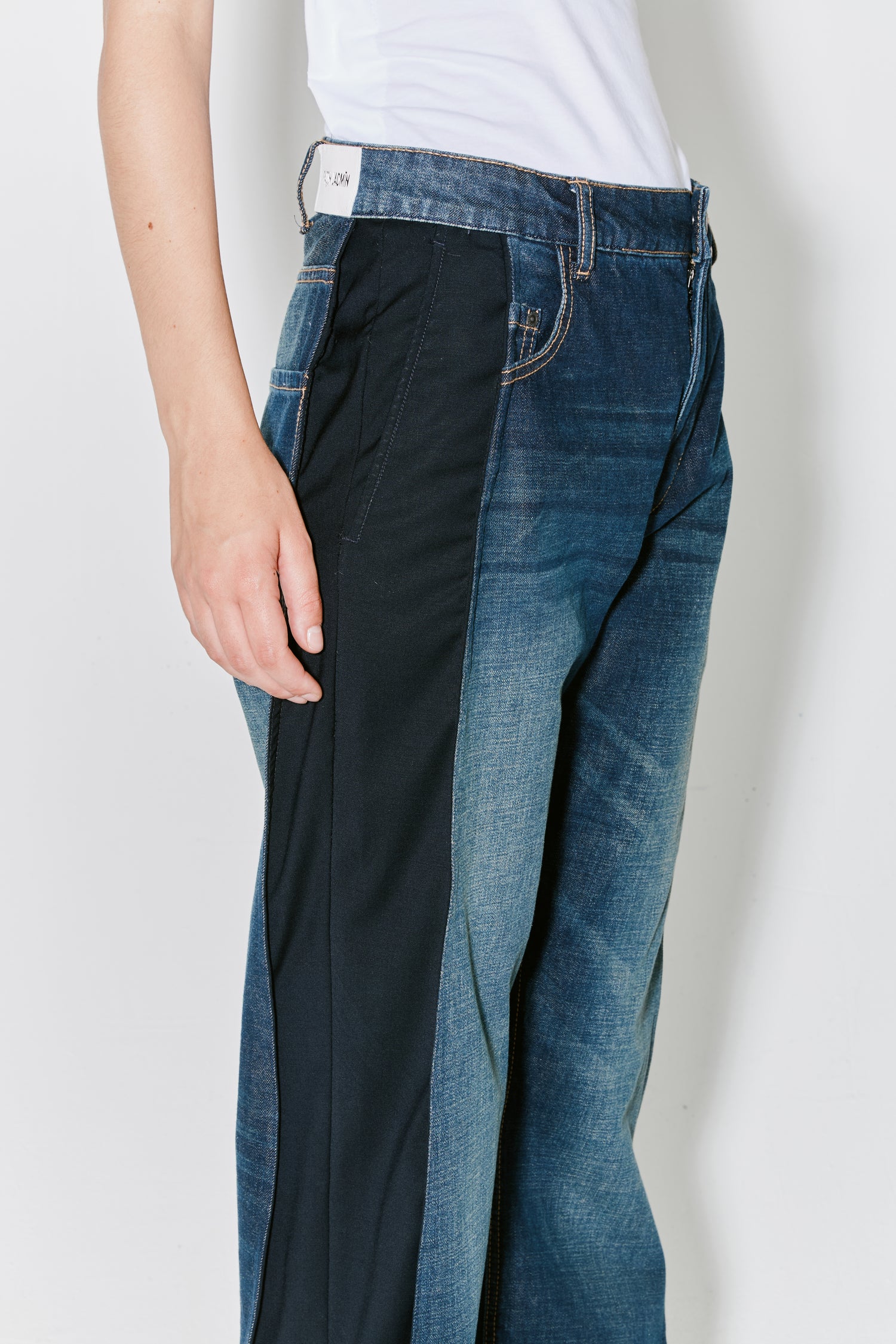A 2-in-1 design pants crafted from upcycled second-hand blue jeans and dark grey-black suits pants, featuring a mid-rise waist , a loose fit and raw edge finishing at the seams . Each piece is unique and one of a kind.