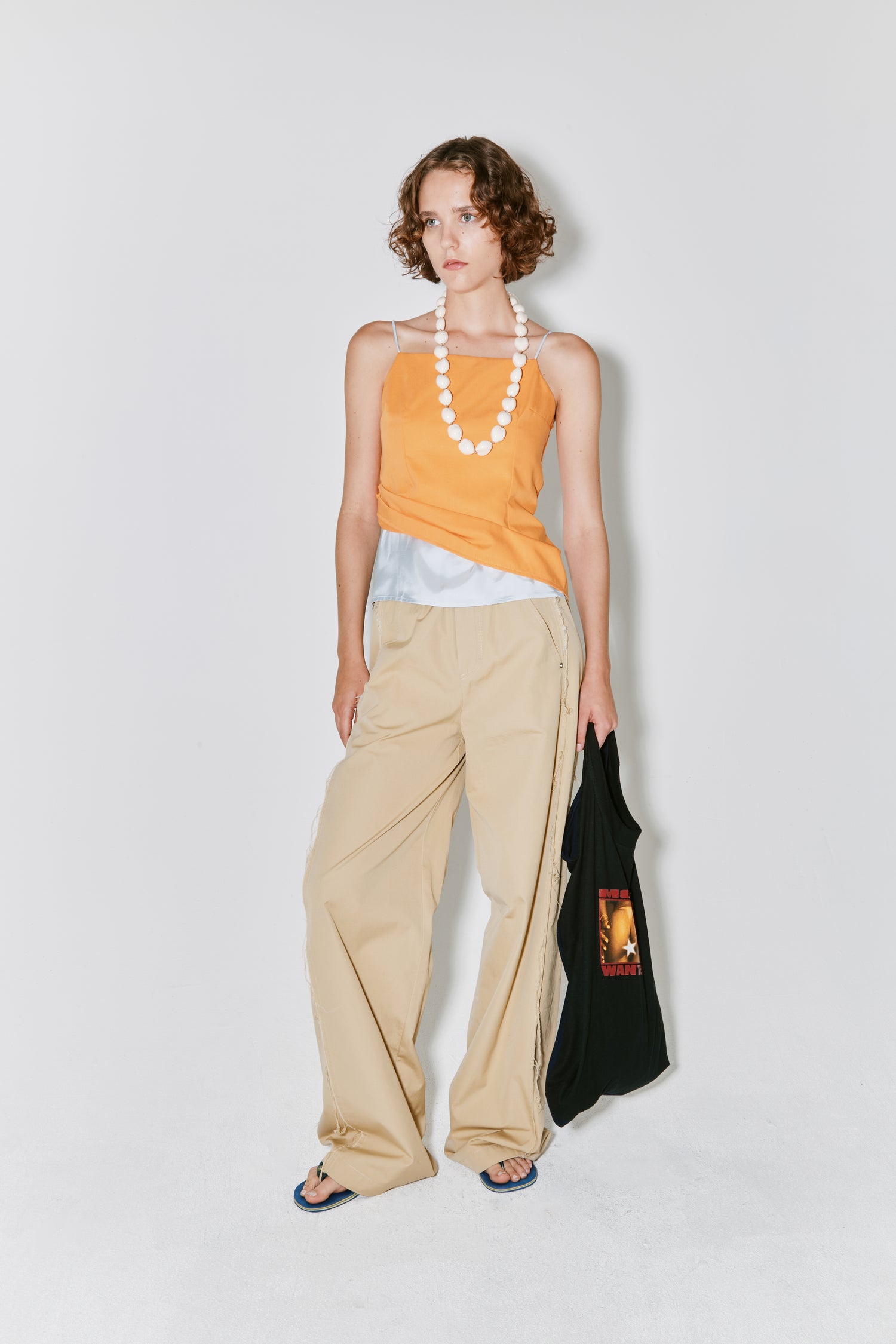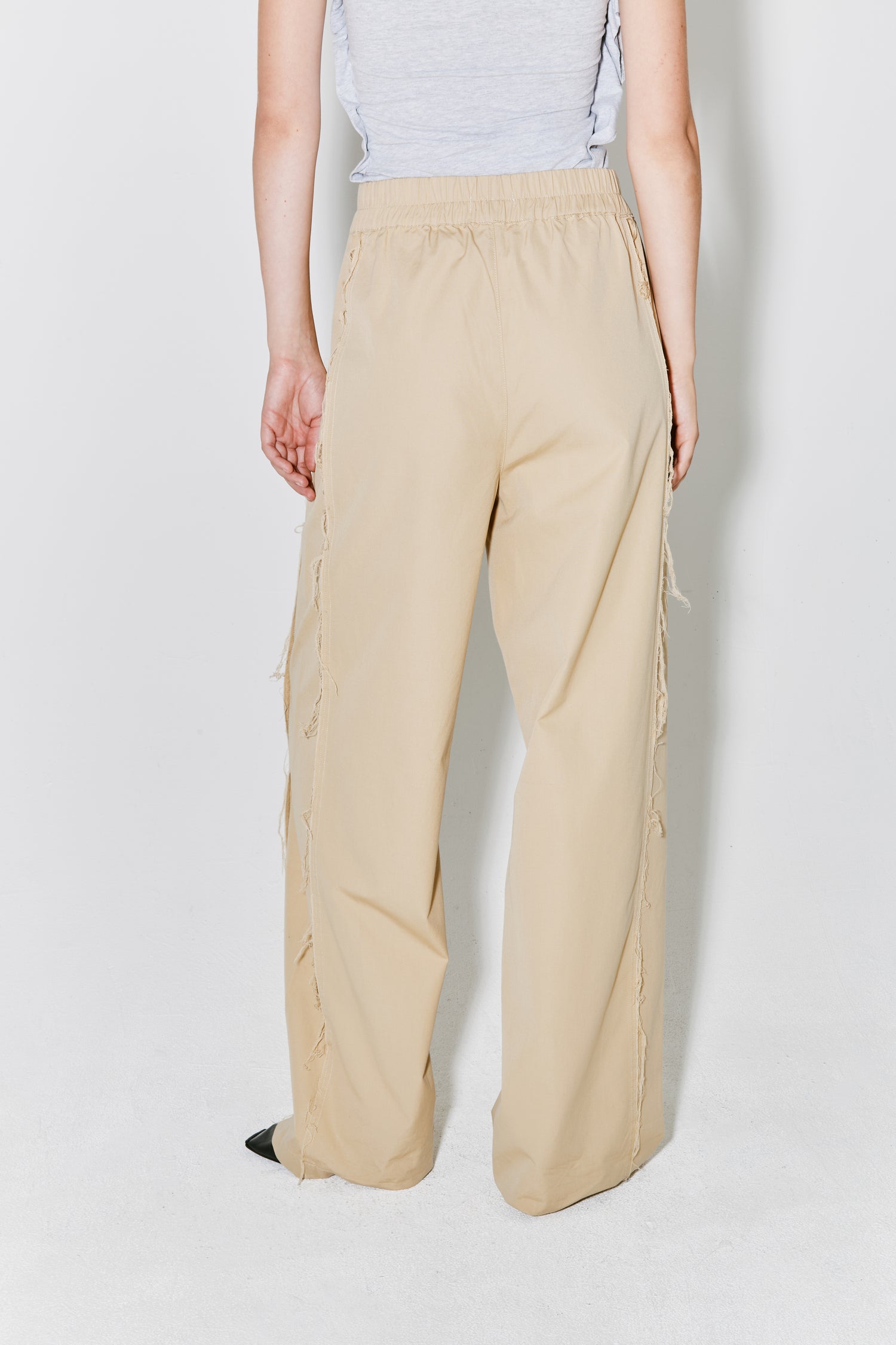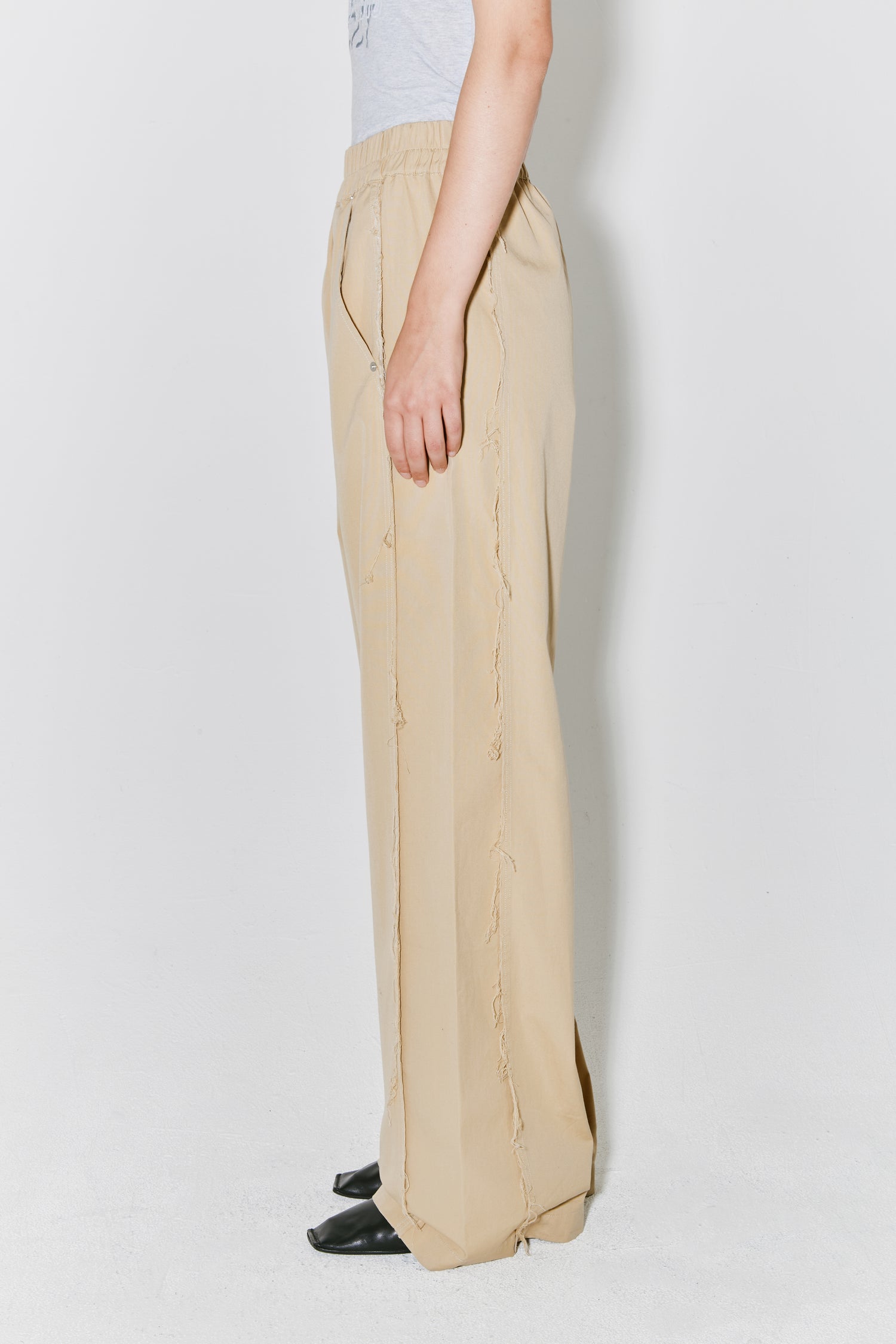 POLLY are wide pants crafted from Italian beige cotton, featuring raw-edge finishing and an elastic waistband for maximum comfort.
