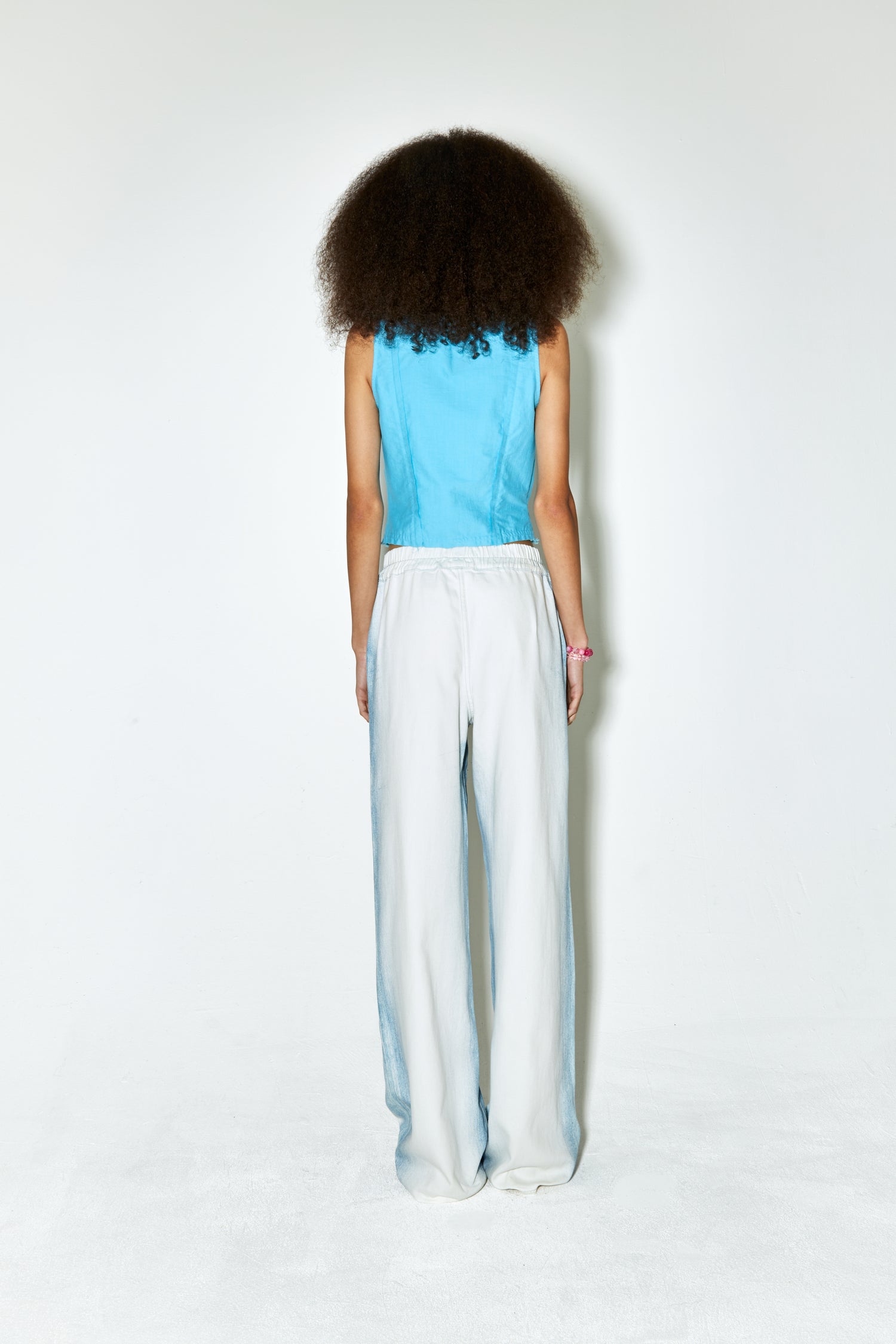 POLLY are wide pants made of white denim with a blue dyed detail at the side seams. Features a wide leg fit and elastic waistband to provide the most comfort.