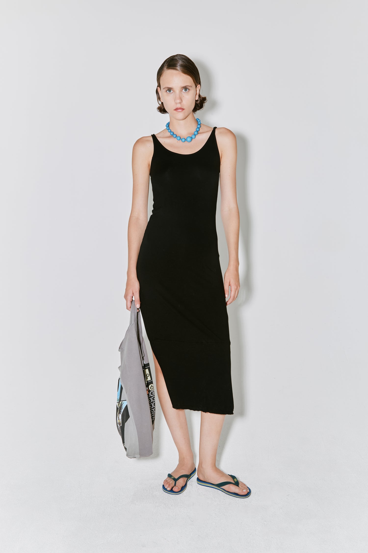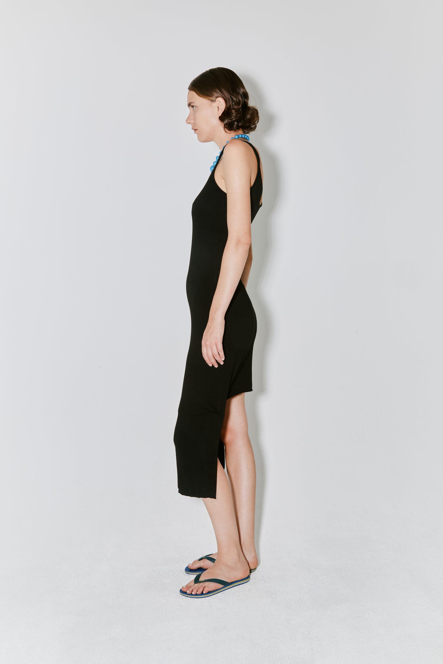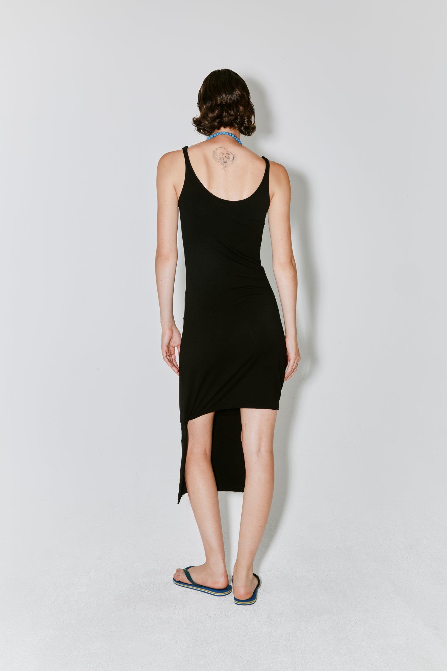 RACHEL is a jersey cut dress, crafted from Portuguese black jersey. It features a knee-length design in front and a shorter design in the back.