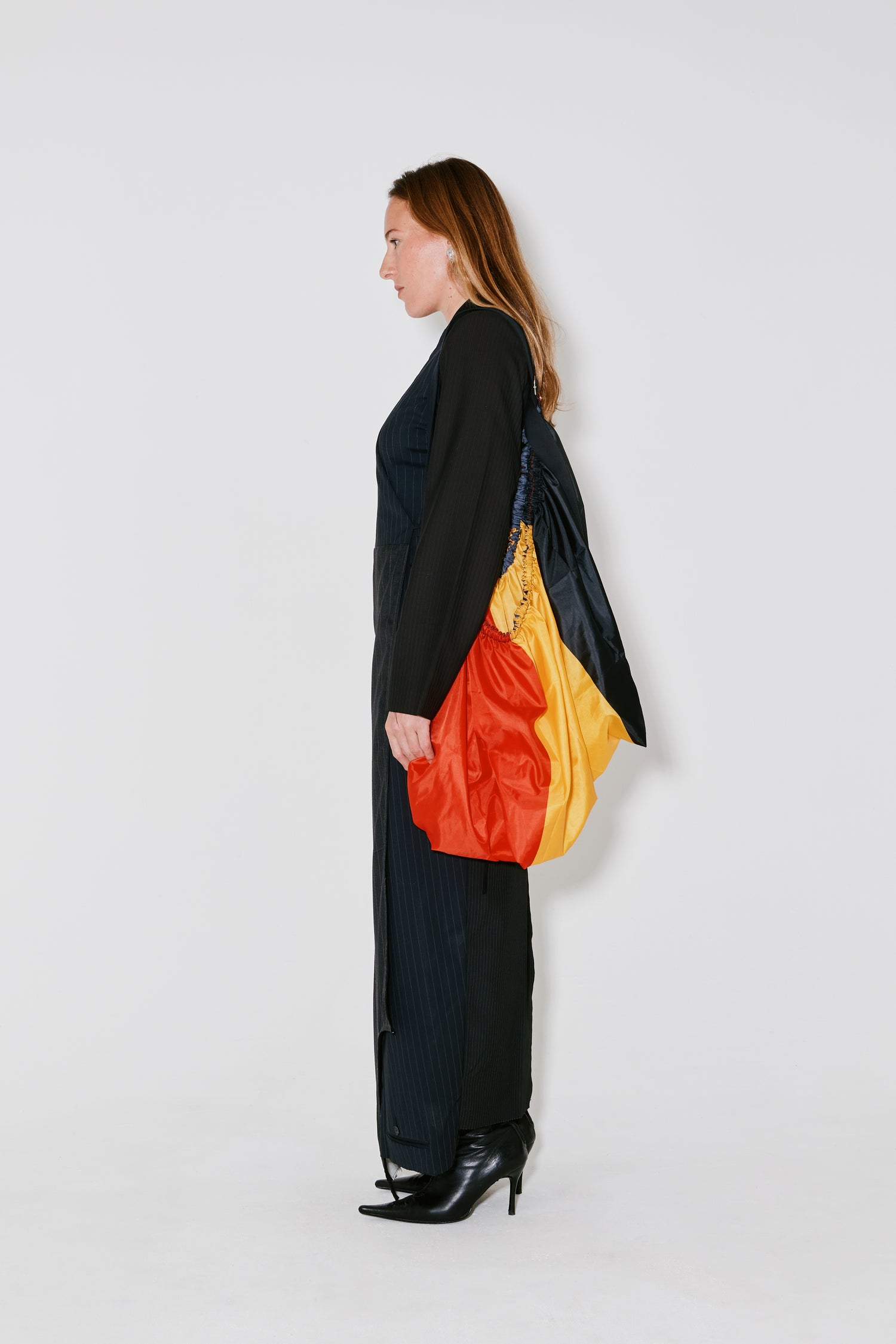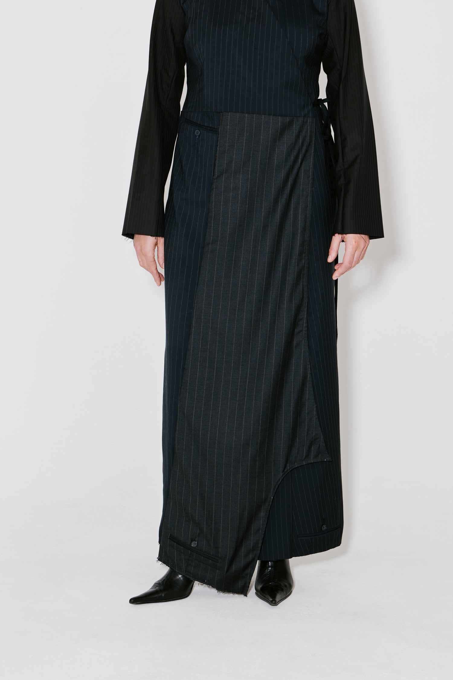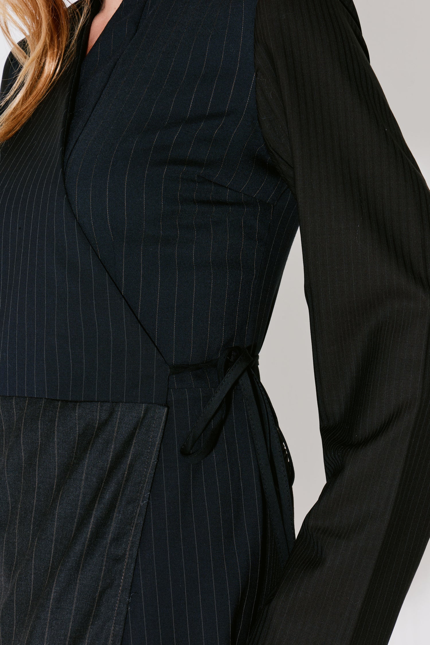 RAINE is a long wrap dress crafted from upcycled dark blue, dark grey and black suiting trousers. Features asymmetric paneling, visible tailoring details, and adjustable ties at the side. Designed with long tailored sleeves and a split back hem. Cut to a fitted top and straight ankle-length skirt.