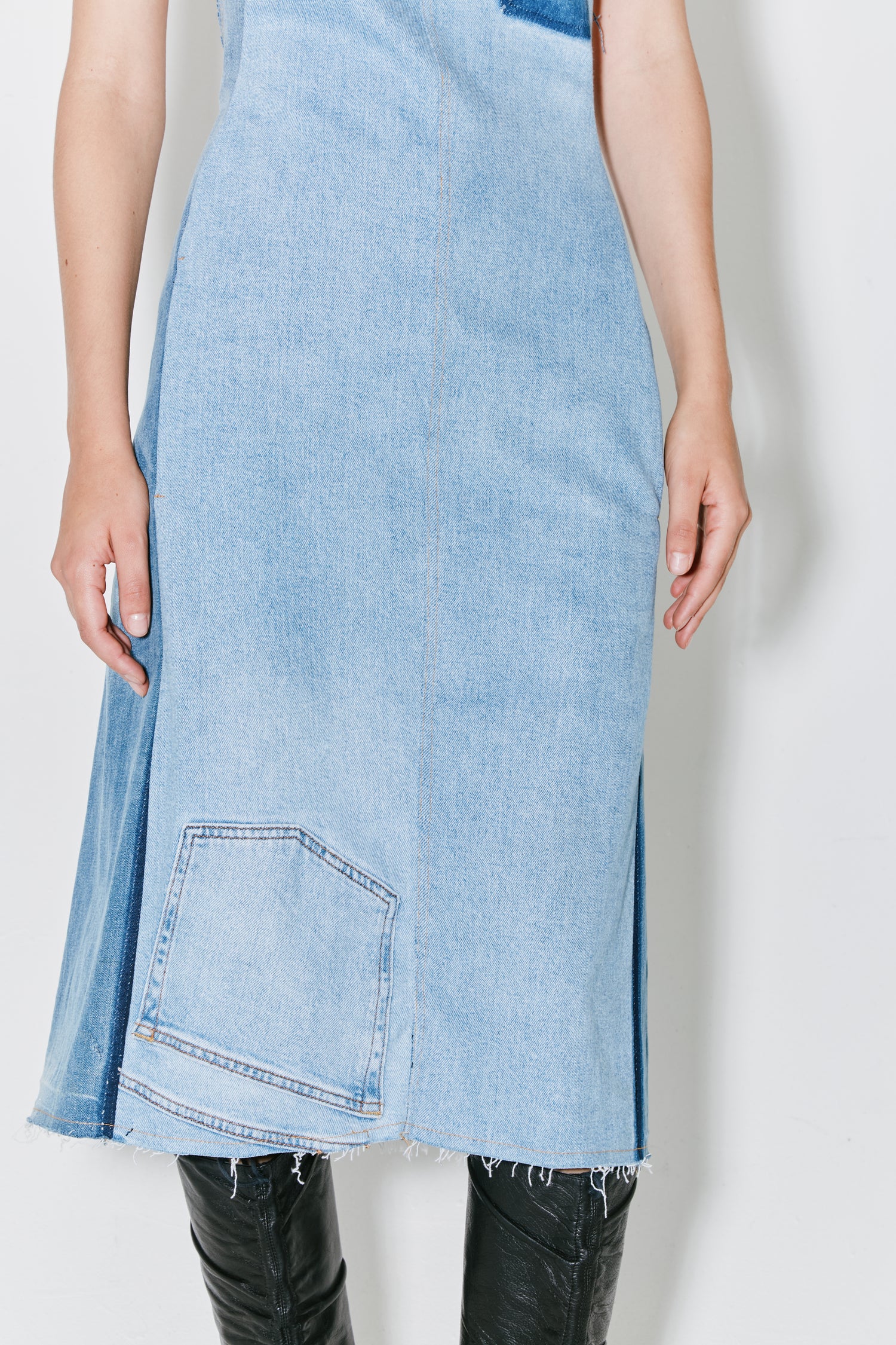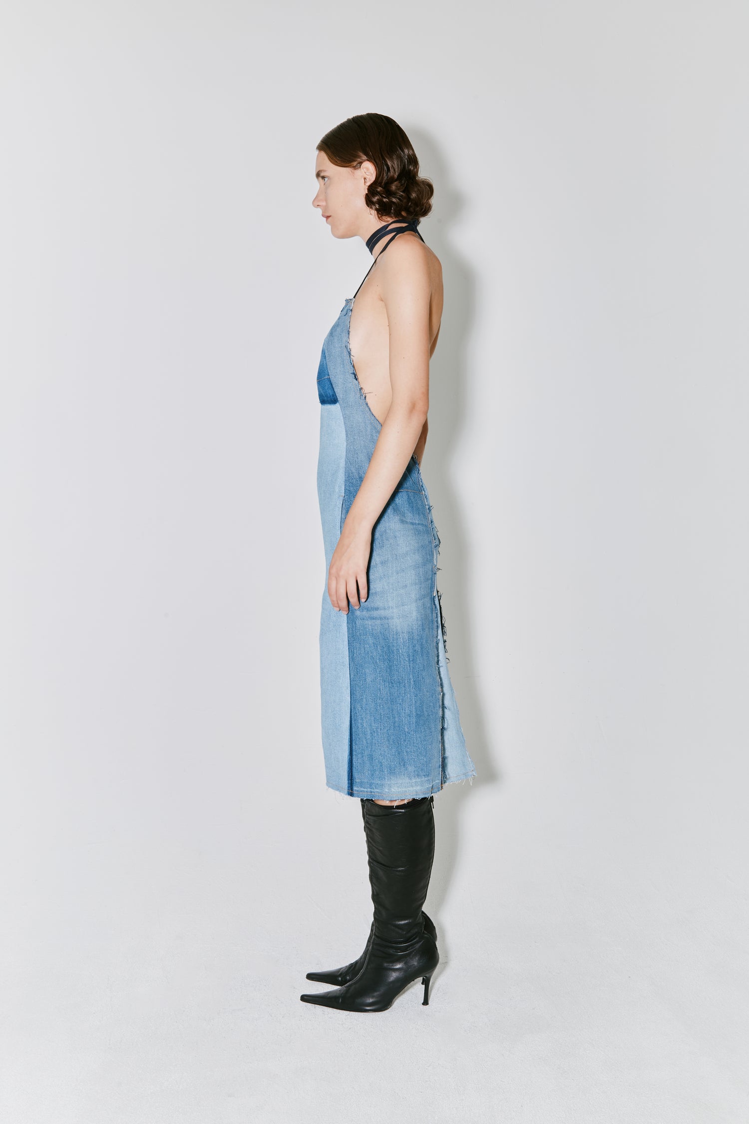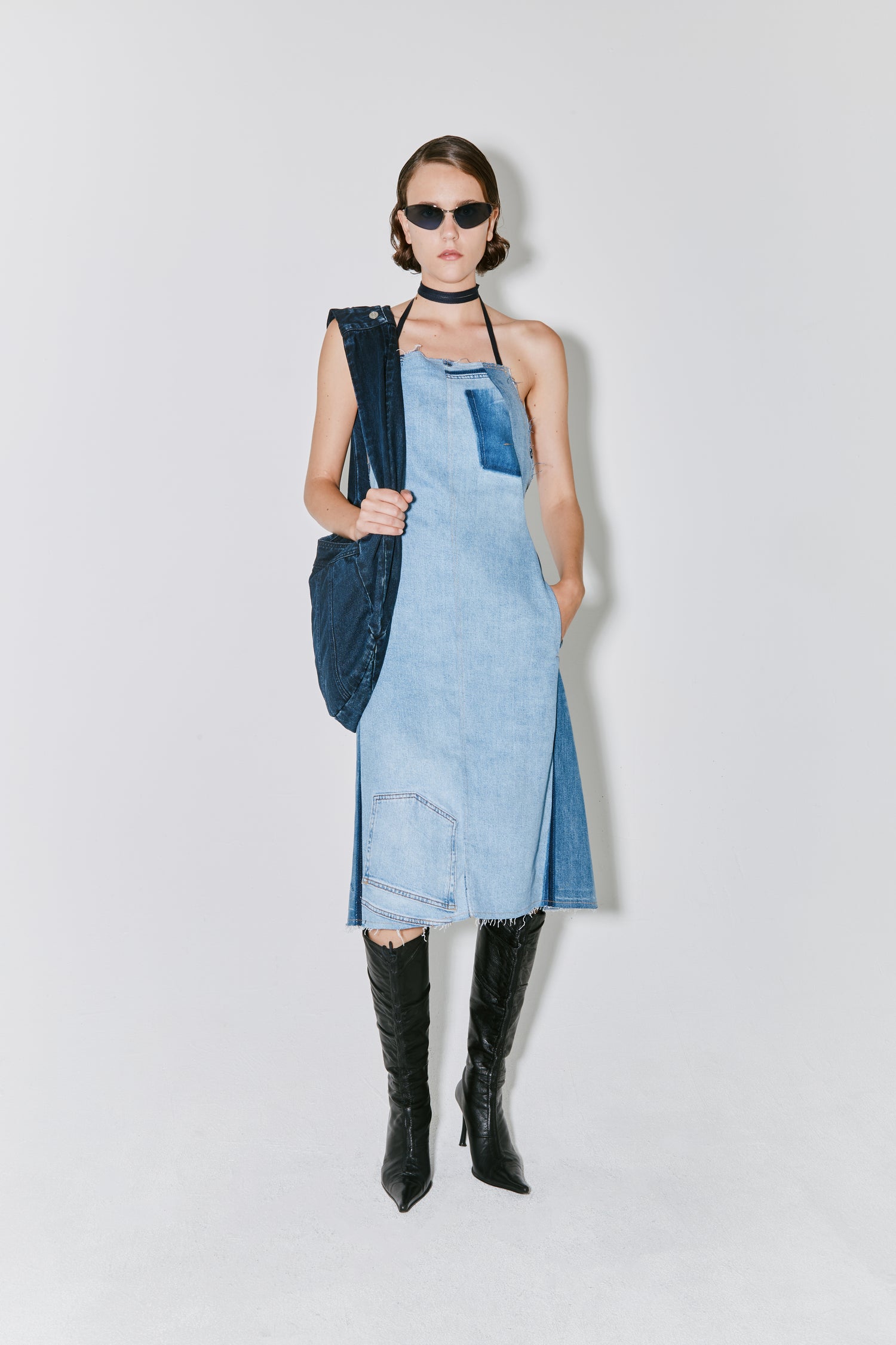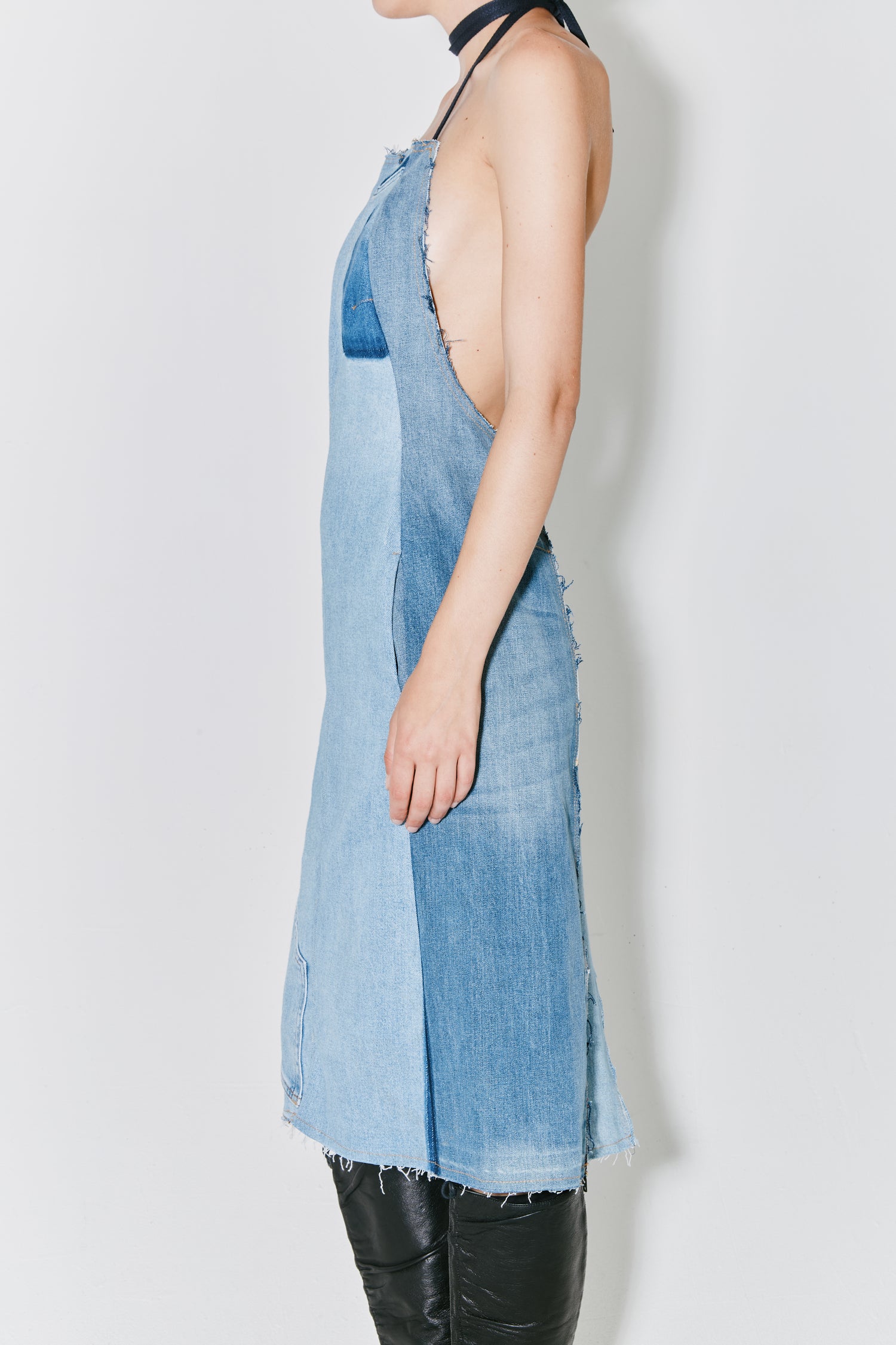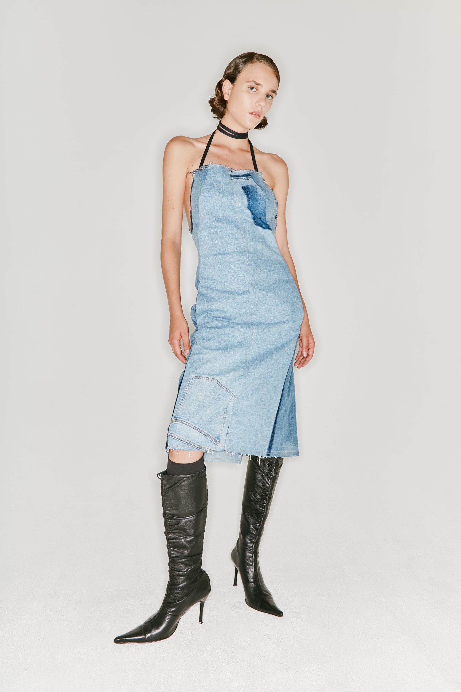 RORA is an apron-style dress crafted from secondhand denim trousers, featuring raw edges, a knee-length design and naked back . Each piece is unique and one of a kind.
