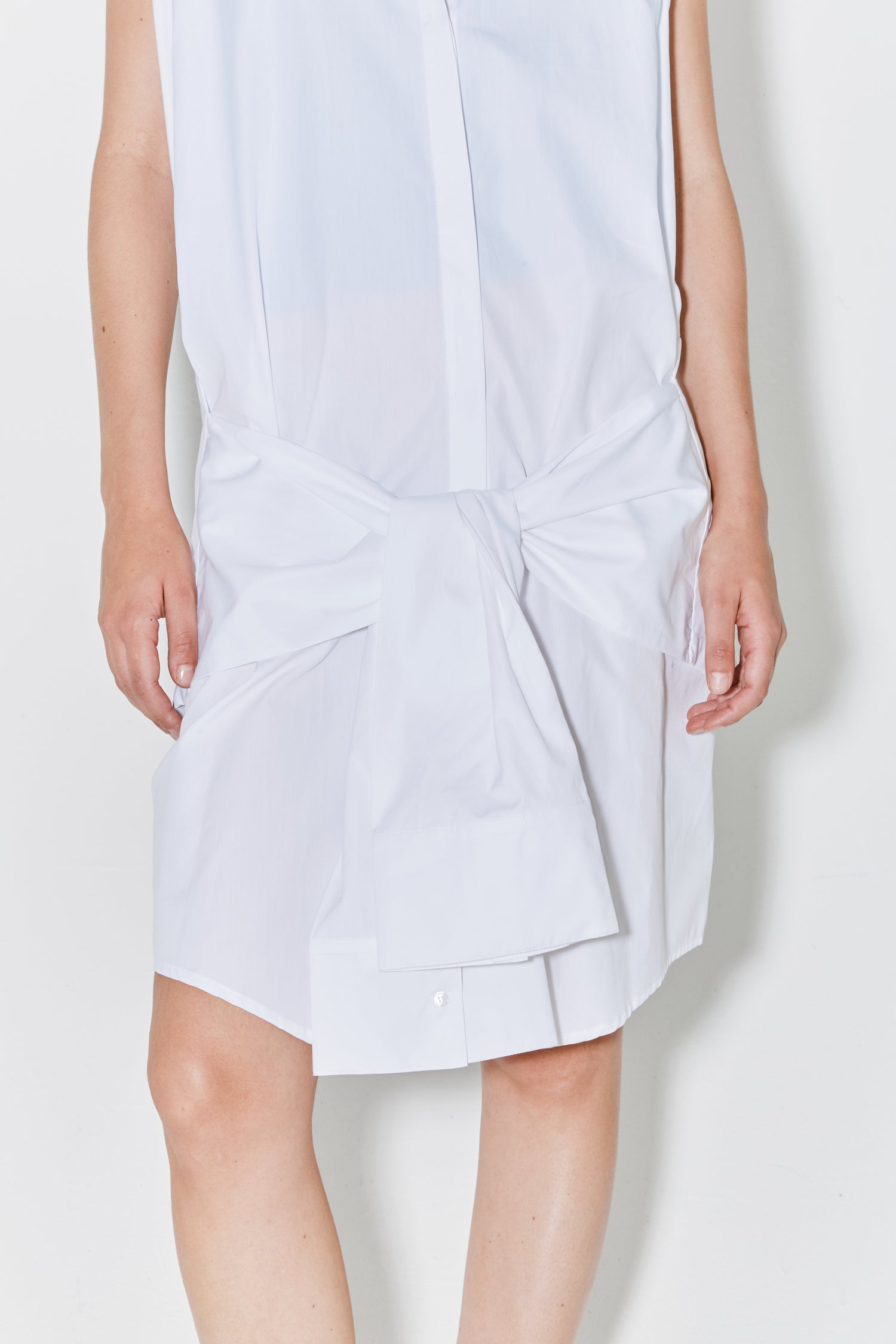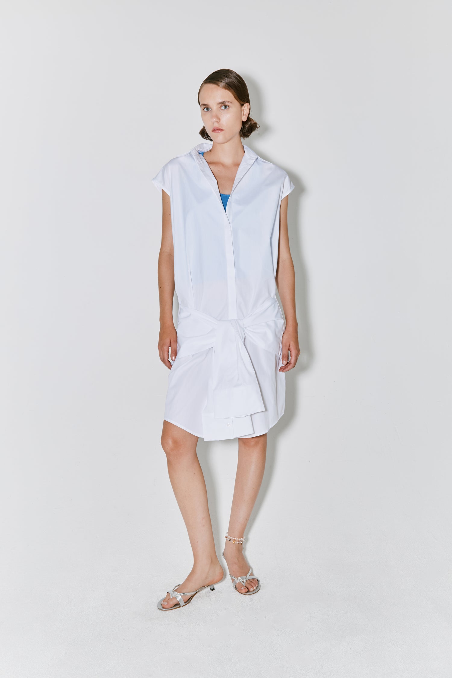 RUIZ is a knee-length shirt dress crafted from Italian popeline, featuring knotted sleeves from the shirt at the back hips that create a striking trompe l’oeil effect.