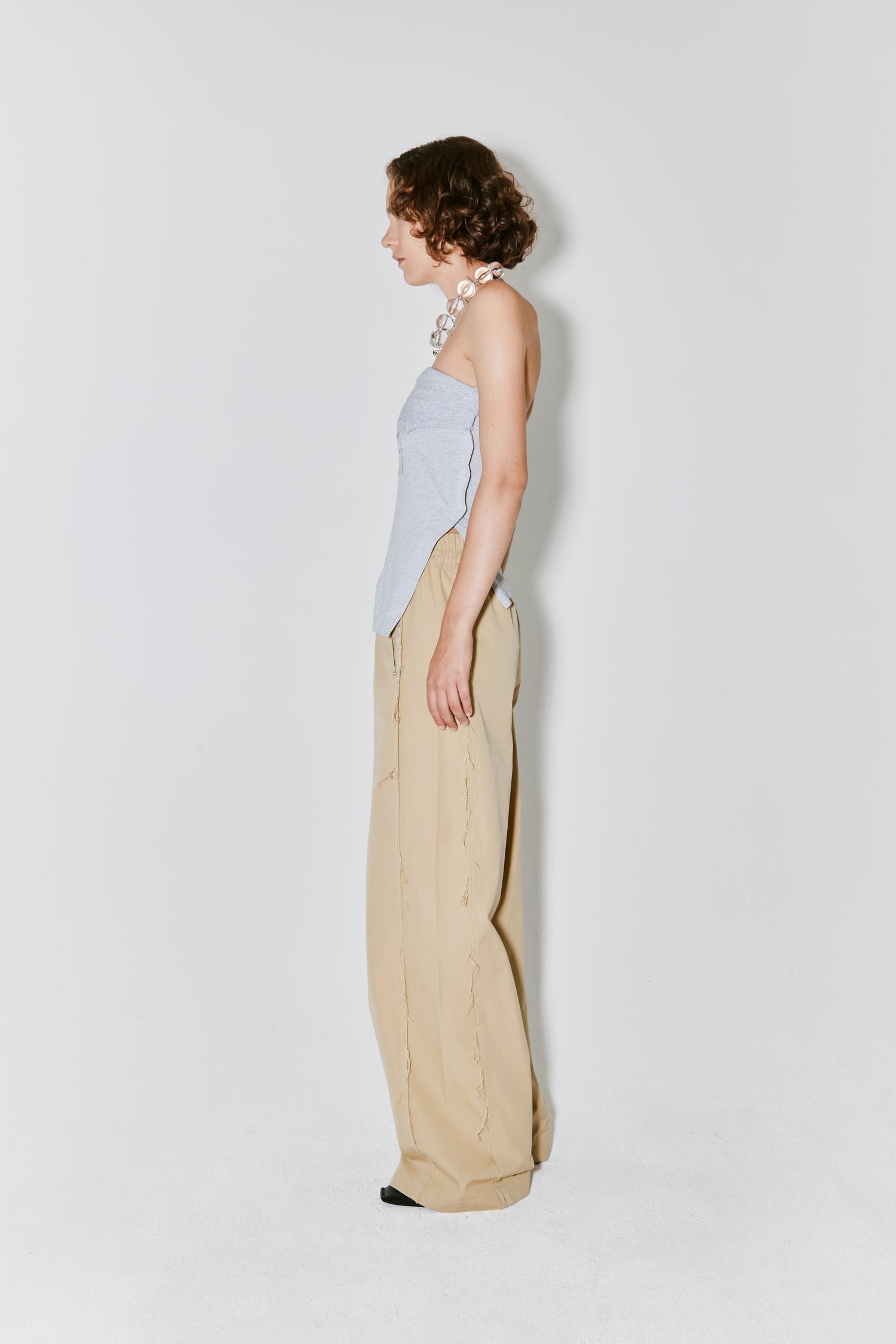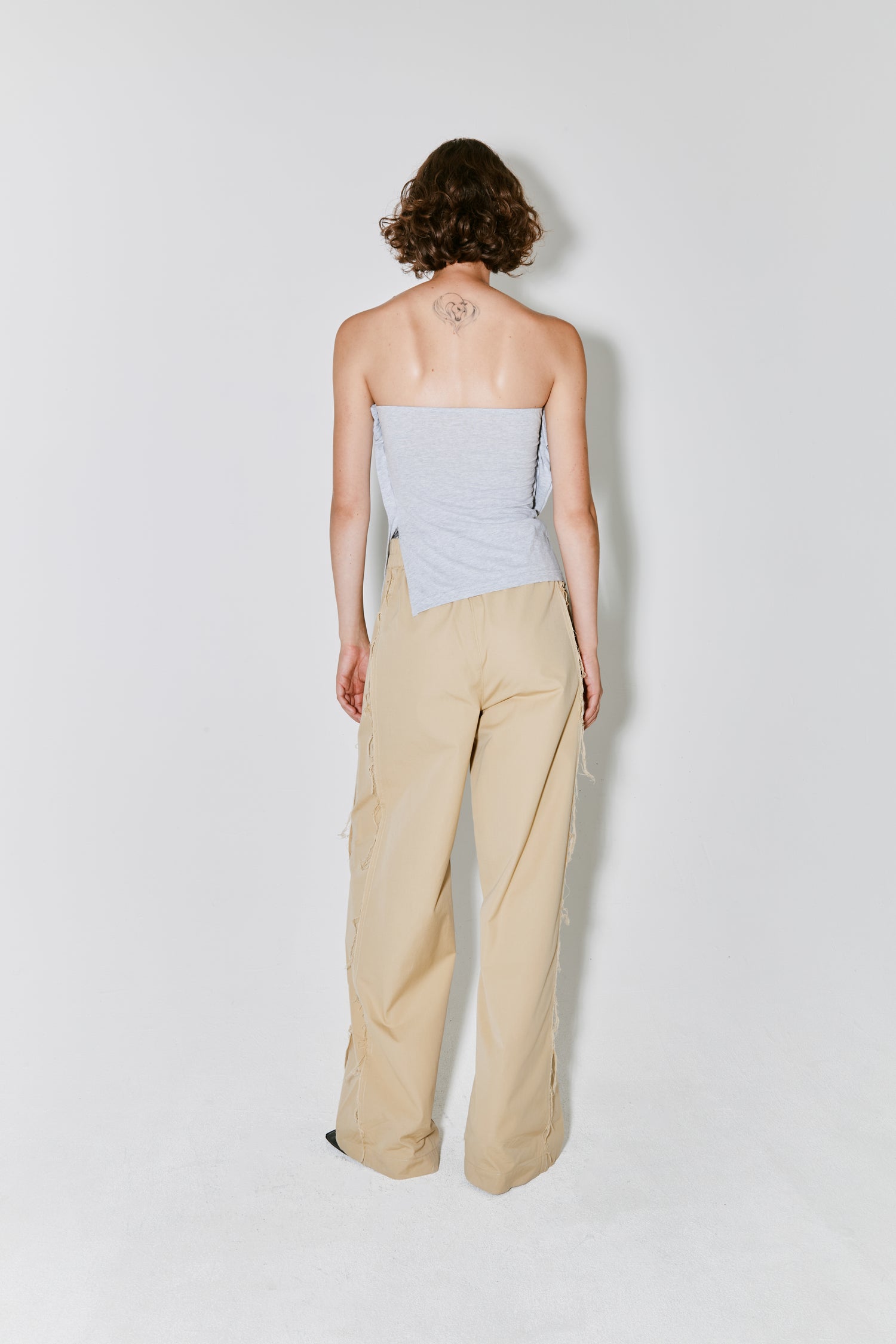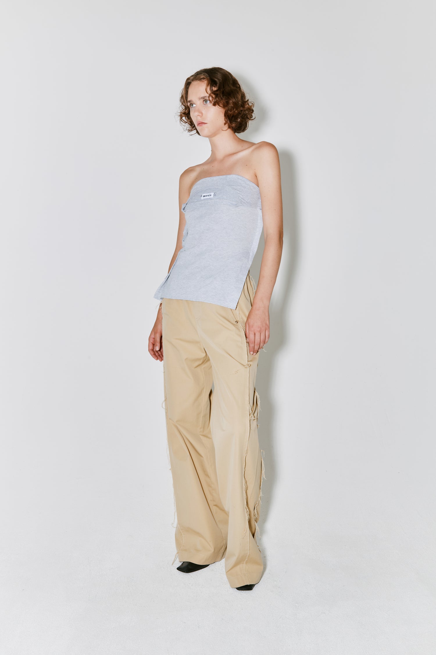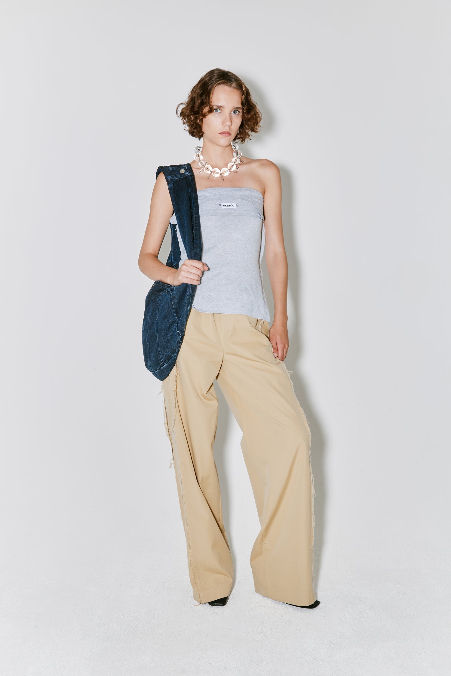 TEXAS is a grey sleeveless top crafted from upcycled second-hand T-shirts, featuring a front brand label.
