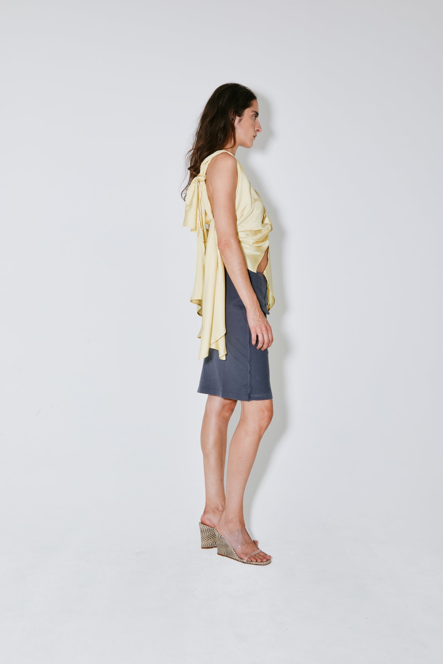THEODORA is a wrap top crafted from Italian yellow viscose. It features a knot construction that can be tied around the body, creating soft, fluid drapes that move and shape with the silhouette.