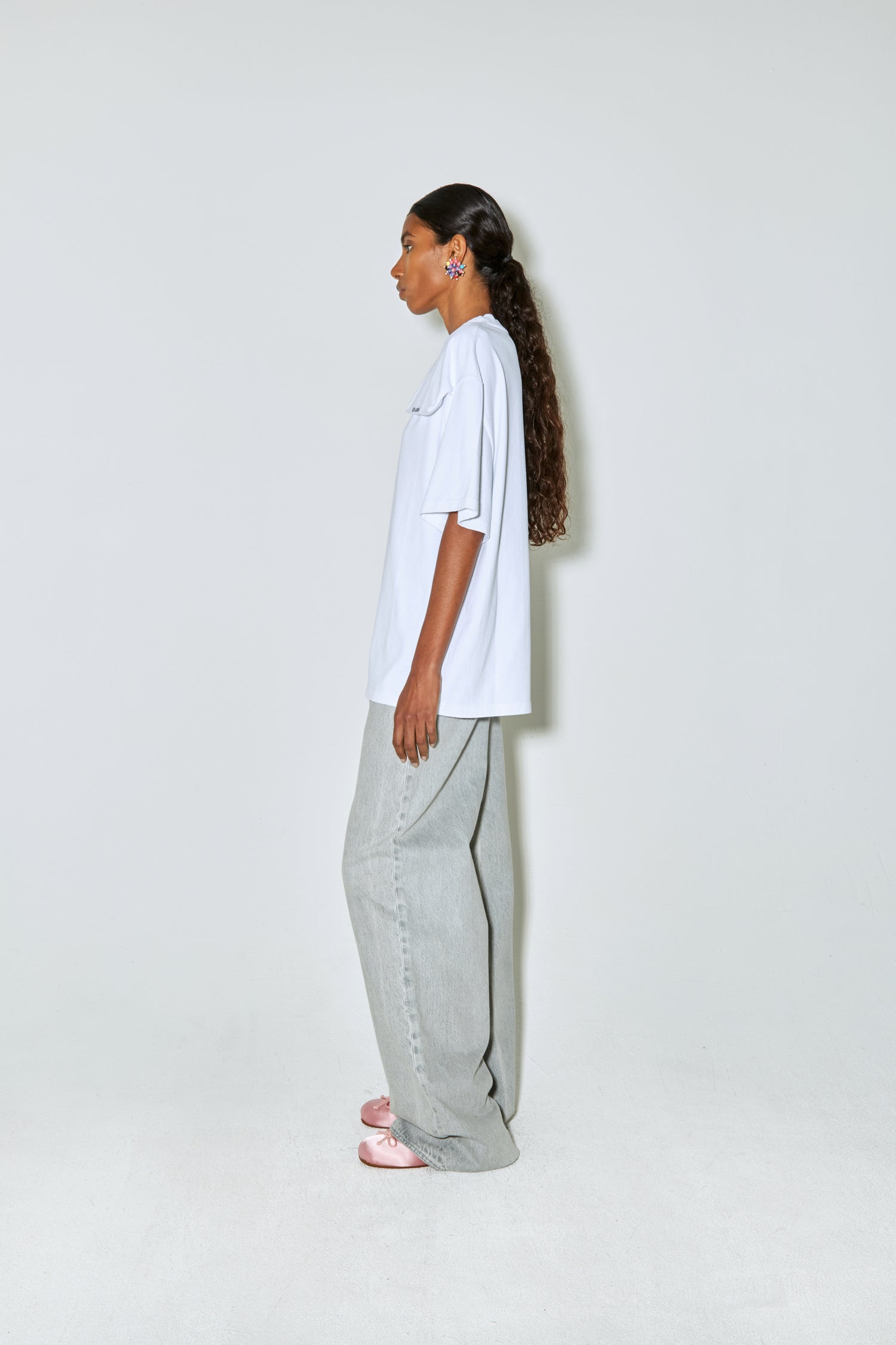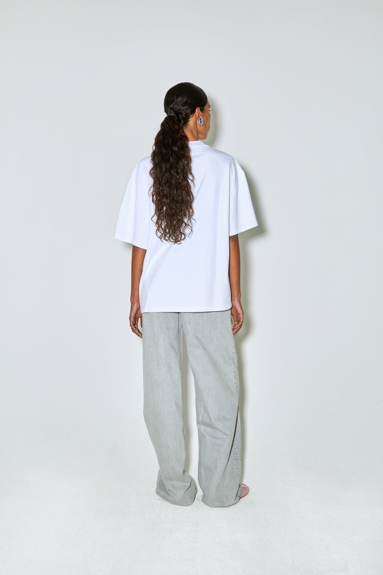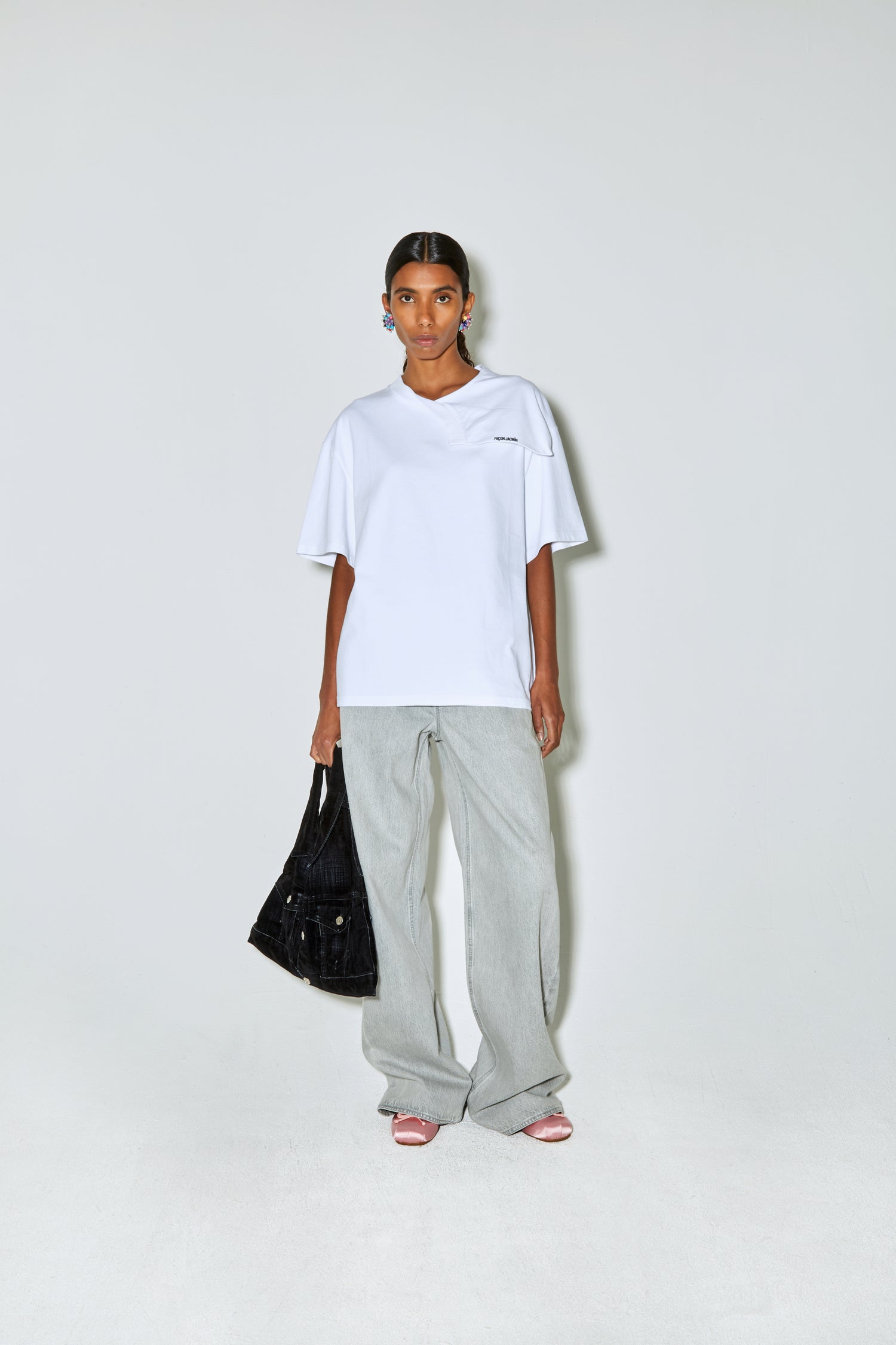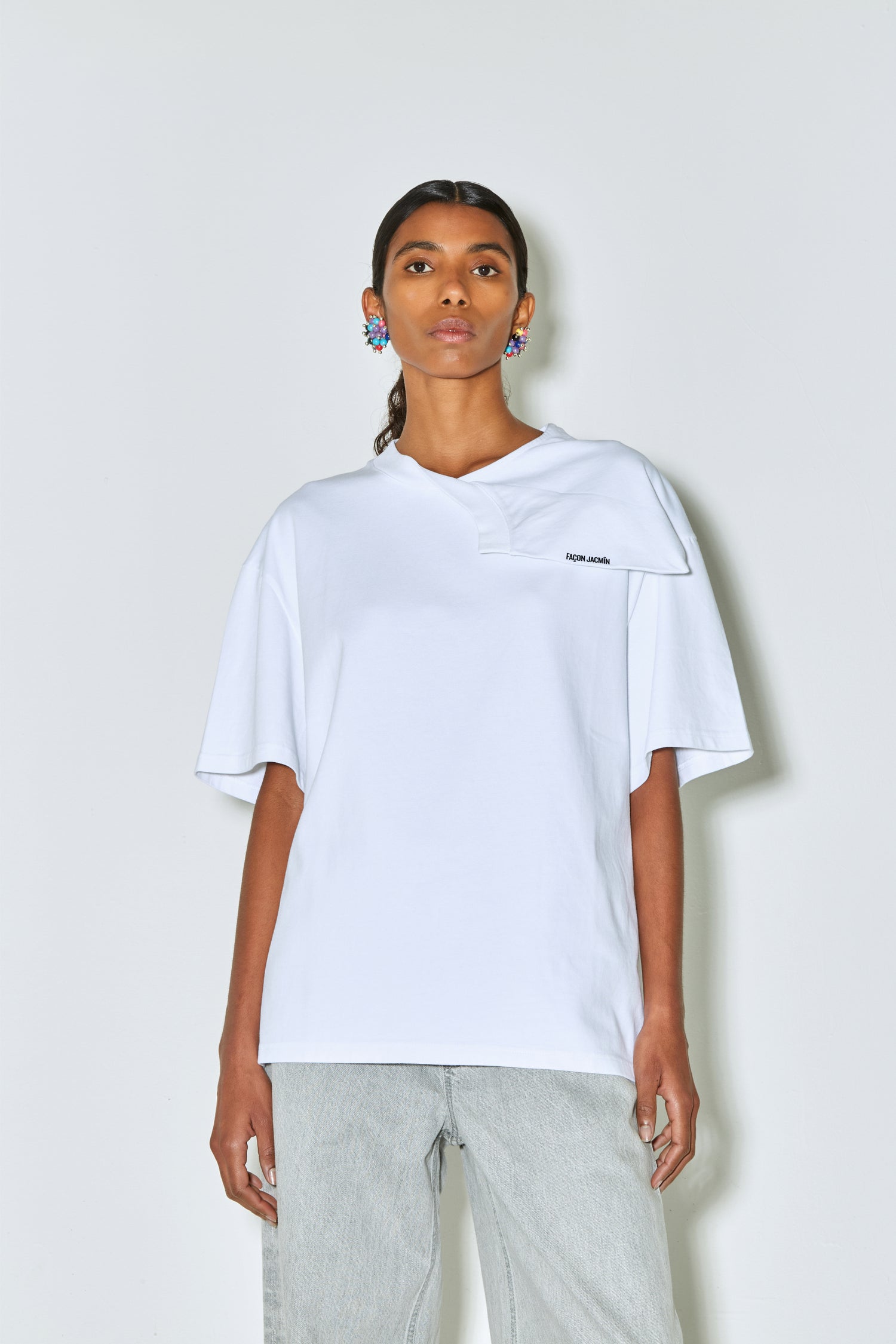 TIAGO is a trompe-l’oeil t-shirt made with a soft italian white cotton jersey. Features a relaxed fit, complete with an asymmetrical neckline and our signature Façon Jacmin logo.