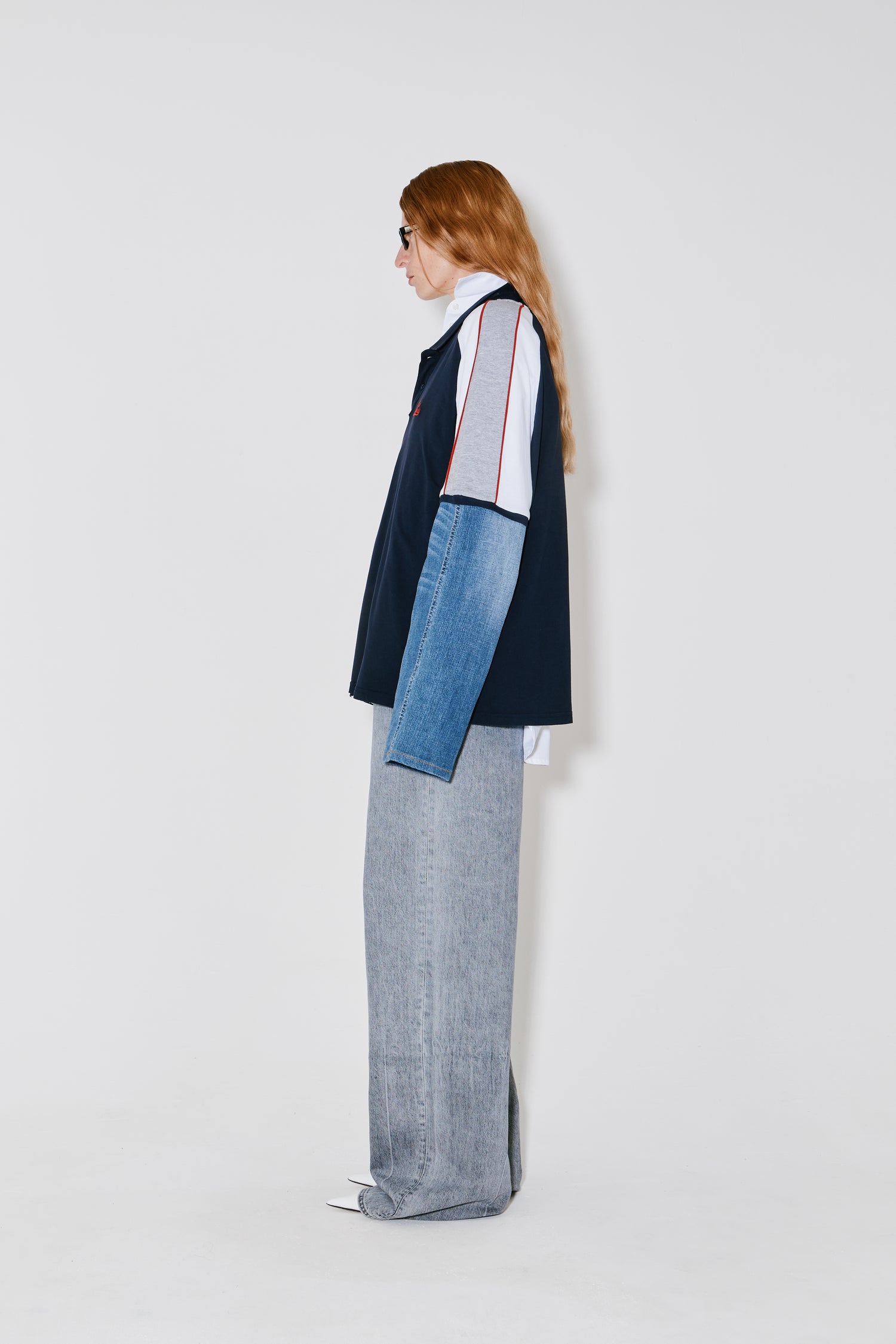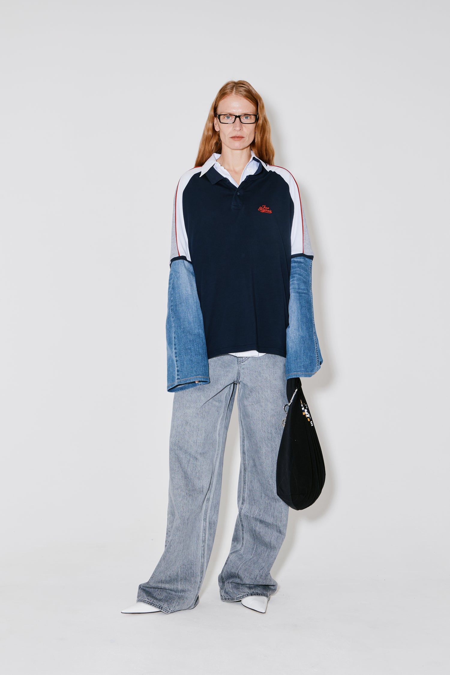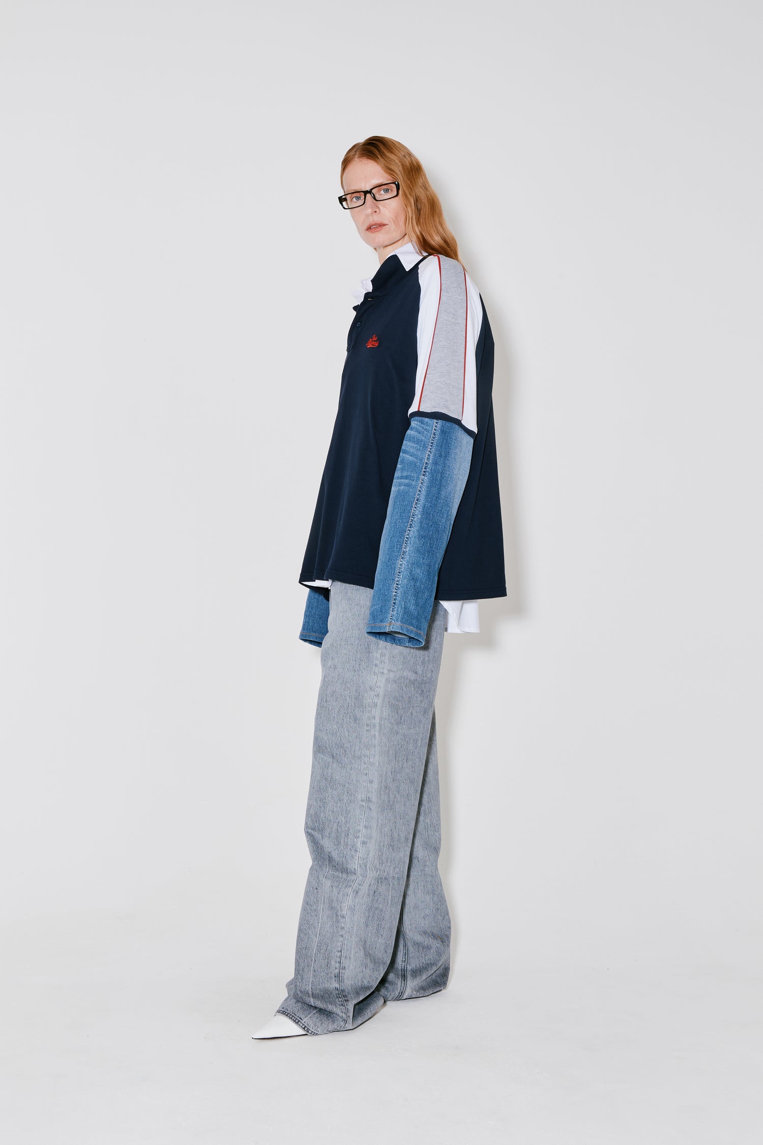 TOM is a long sleeve polo made from upcycled materials. It features contrast sleeves made from upcycled jersey at top and upcycled blue jeans at bottom. Designed with a classic collar, partial button placket, and dropped shoulders. Cut to a relaxed fit with extended sleeves and a hip-length silhouette