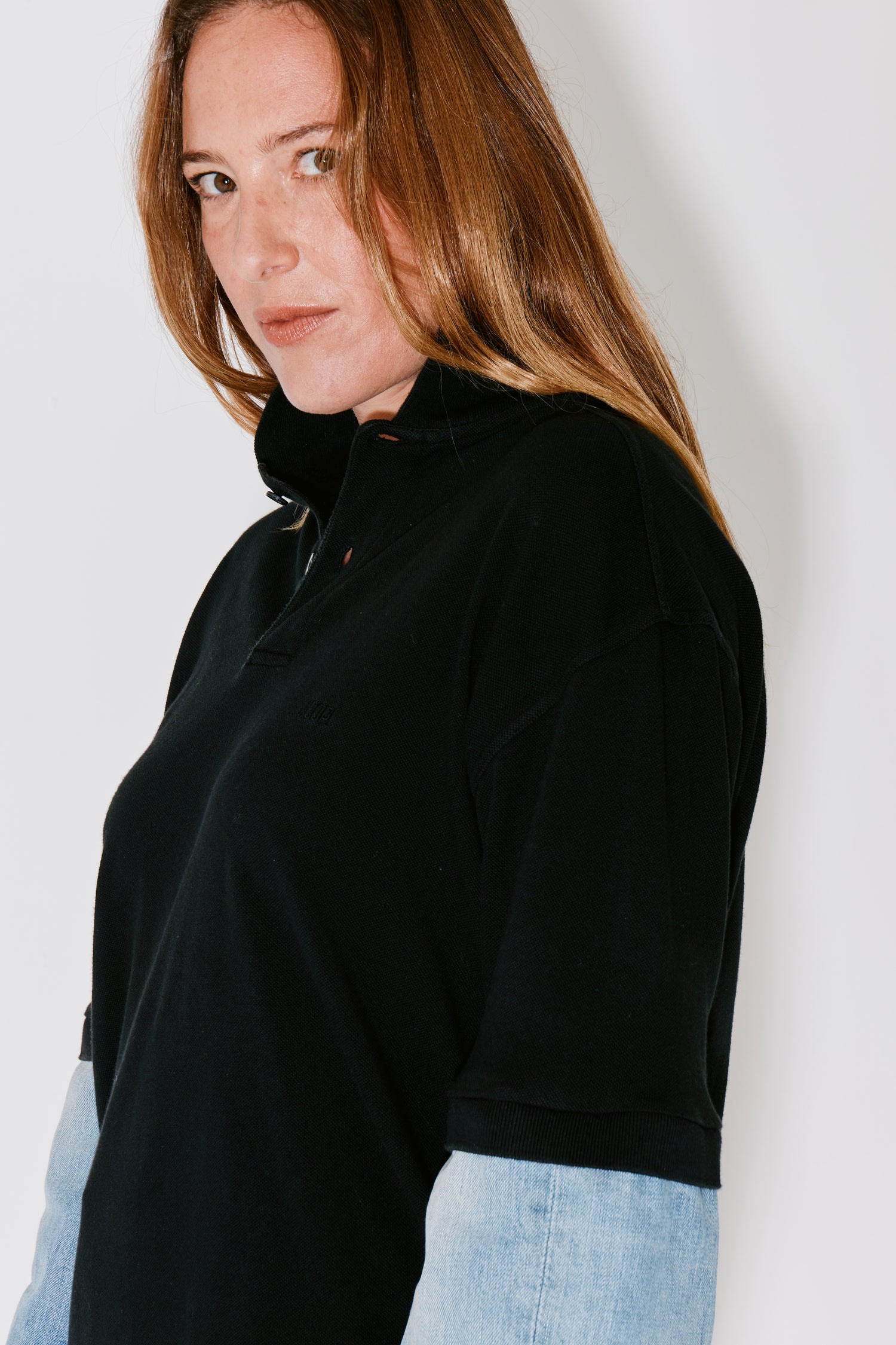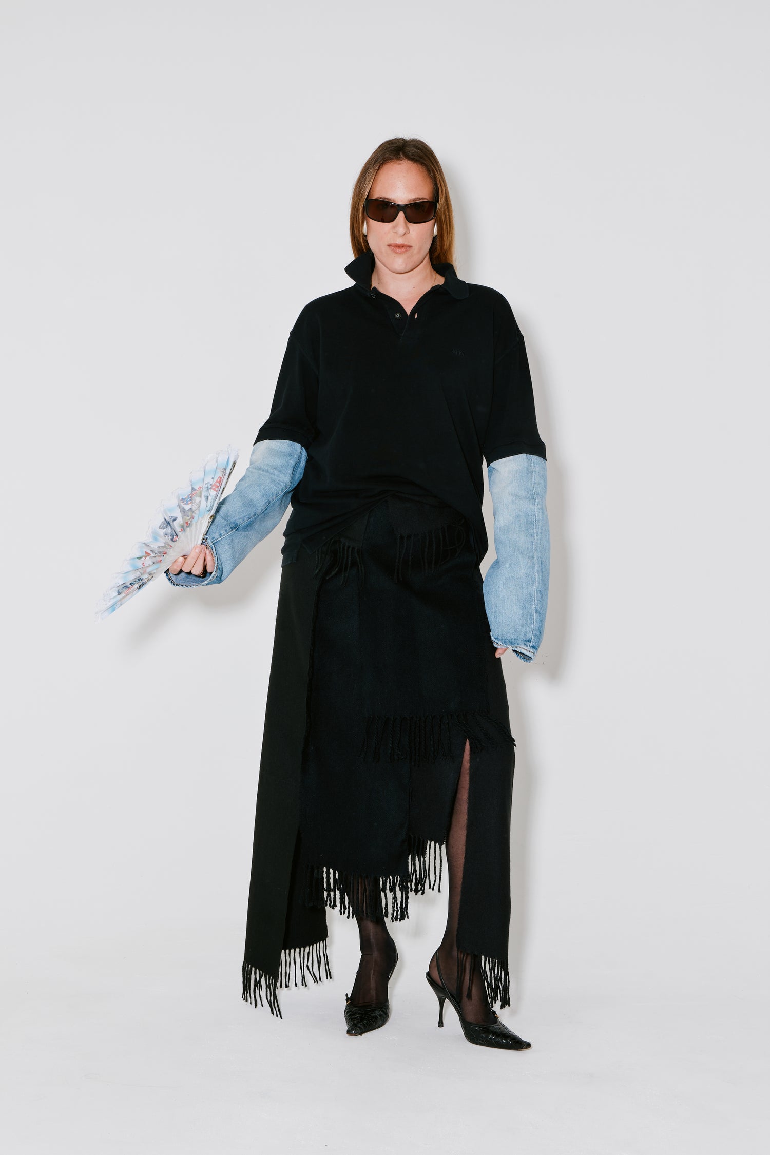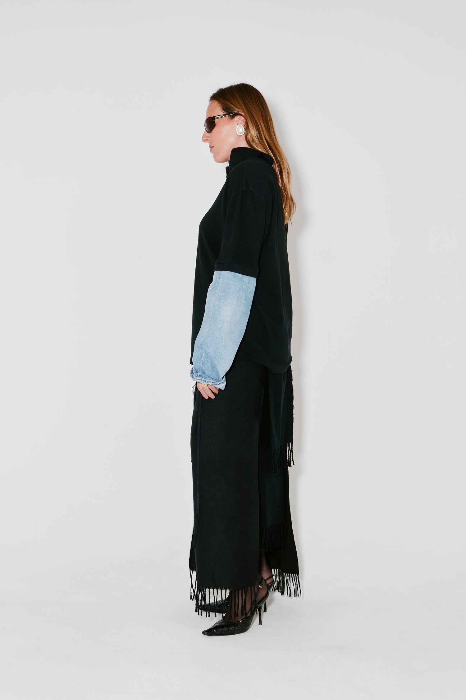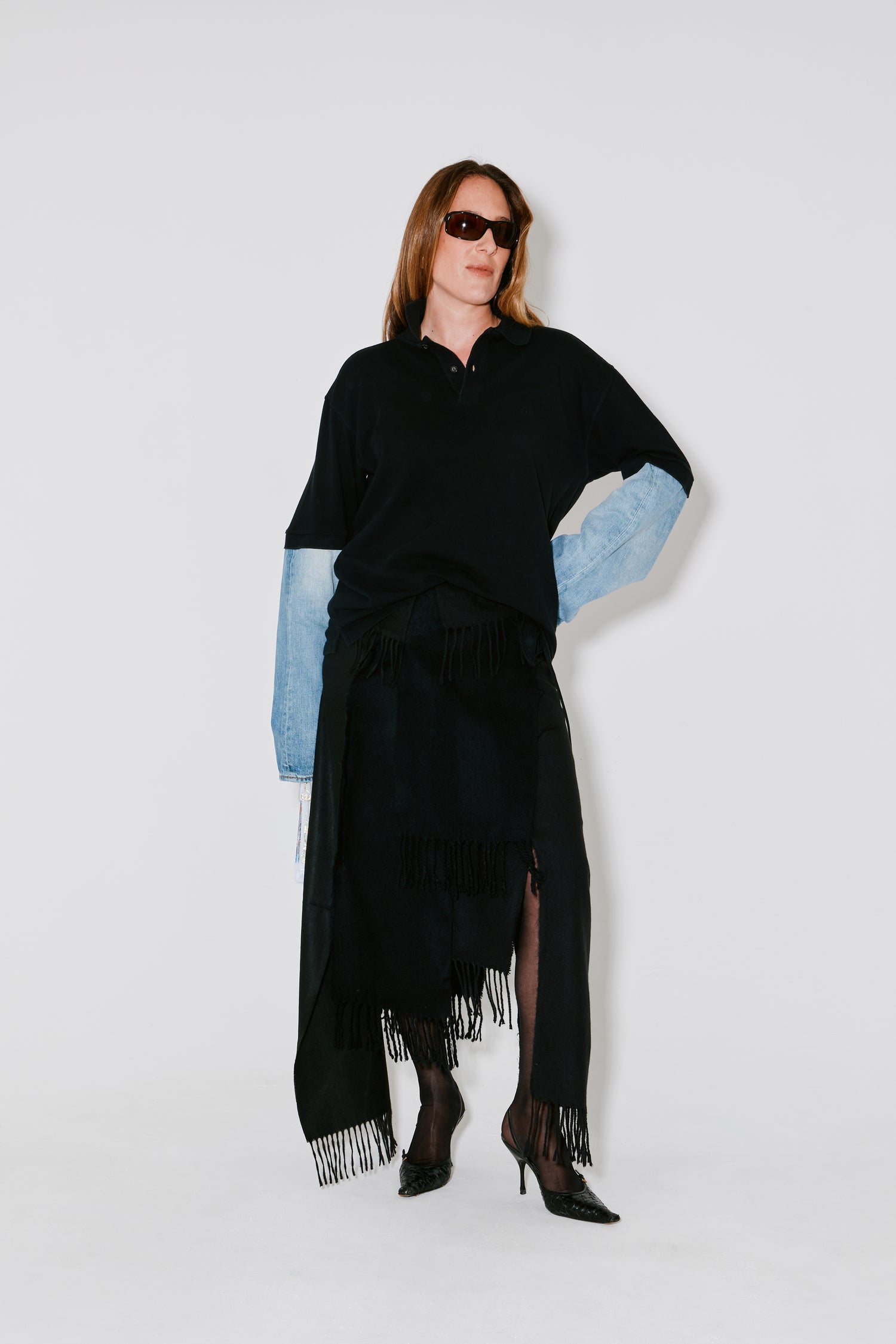 TOM is a long sleeve polo made from upcycled cotton, featuring contrast denim shirt sleeves. Designed with a classic collar, partial button placket, and dropped shoulders. Cut to a relaxed fit with extended sleeves and a hip-length silhouette.