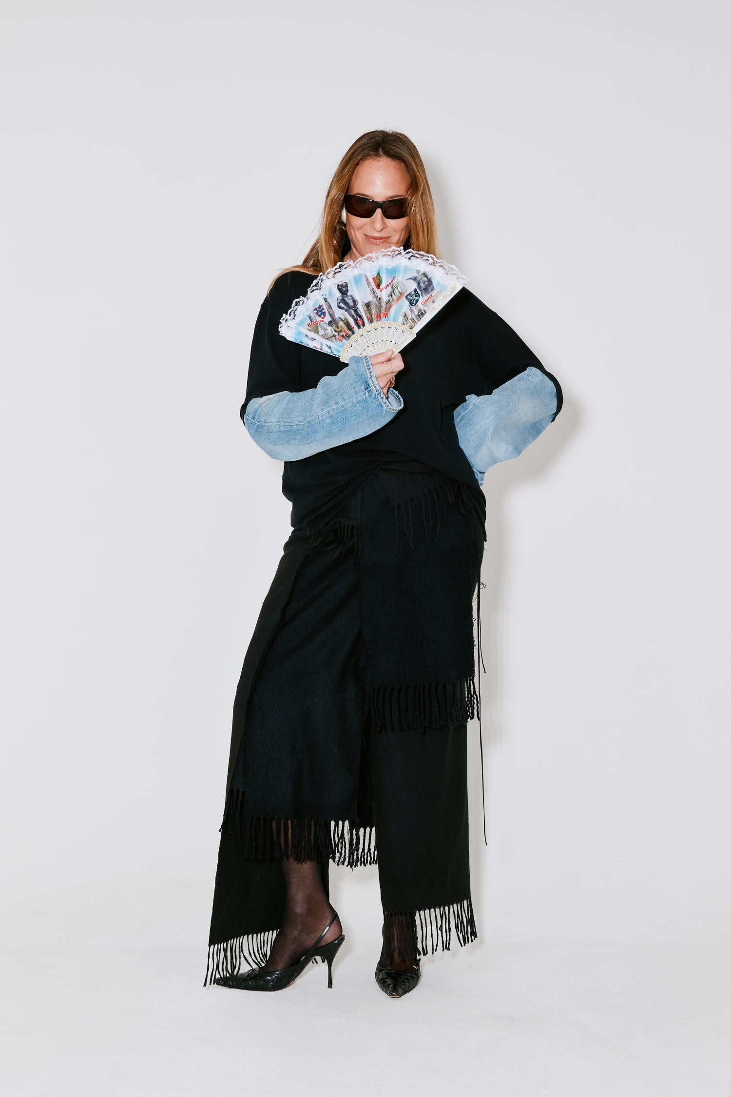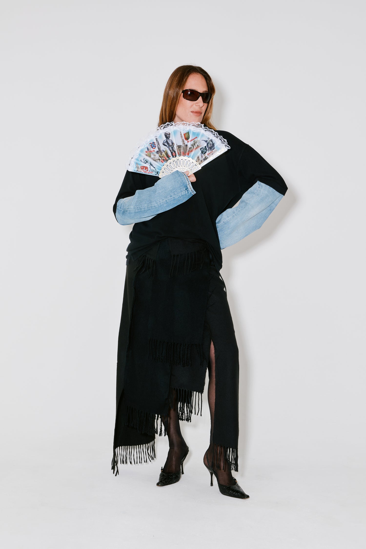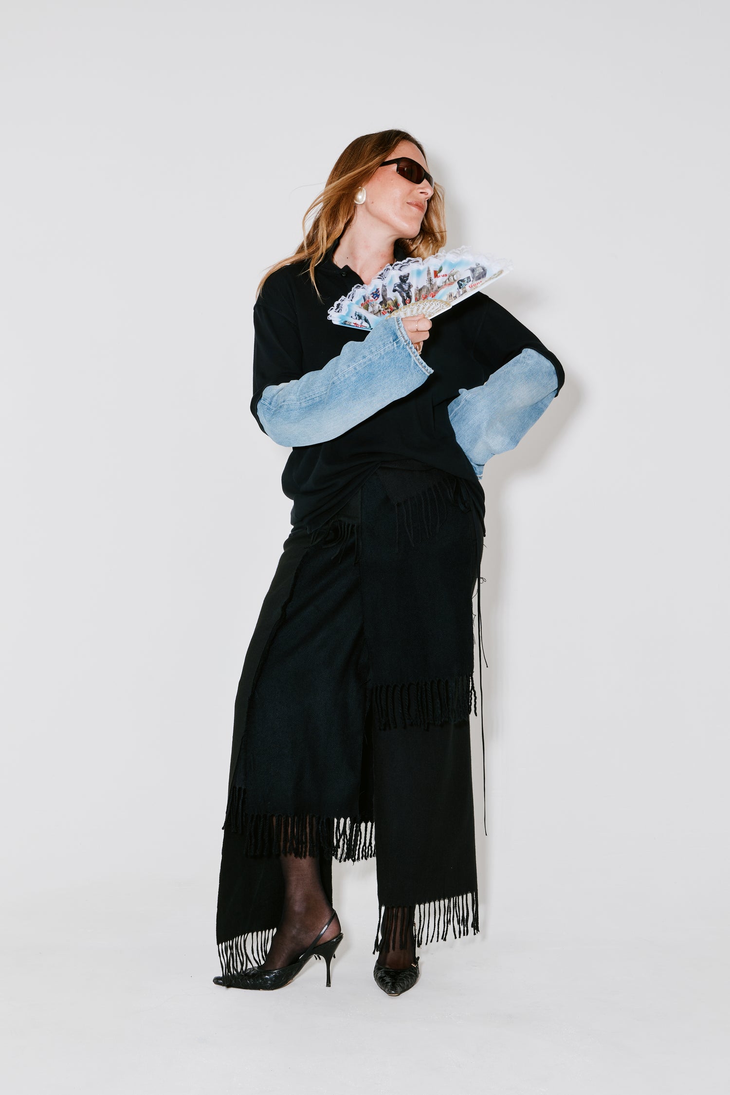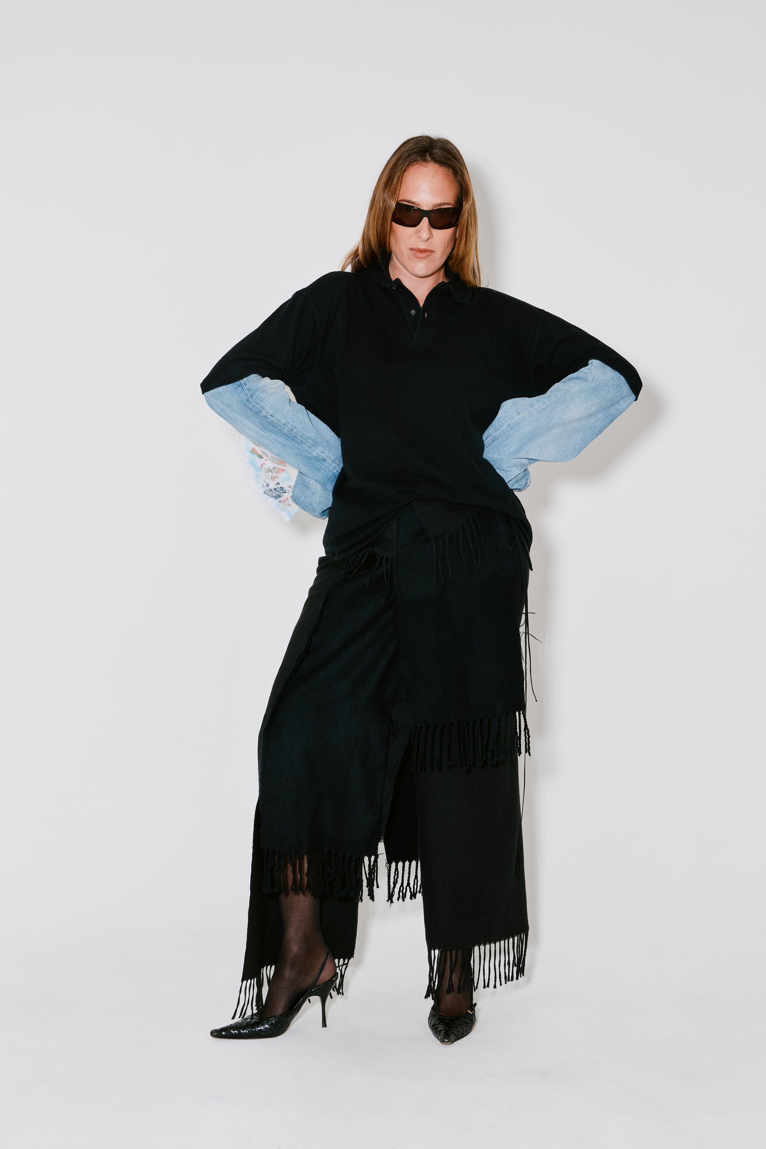 TOM is a long sleeve polo made from upcycled cotton, featuring contrast denim shirt sleeves. Designed with a classic collar, partial button placket, and dropped shoulders. Cut to a relaxed fit with extended sleeves and a hip-length silhouette.