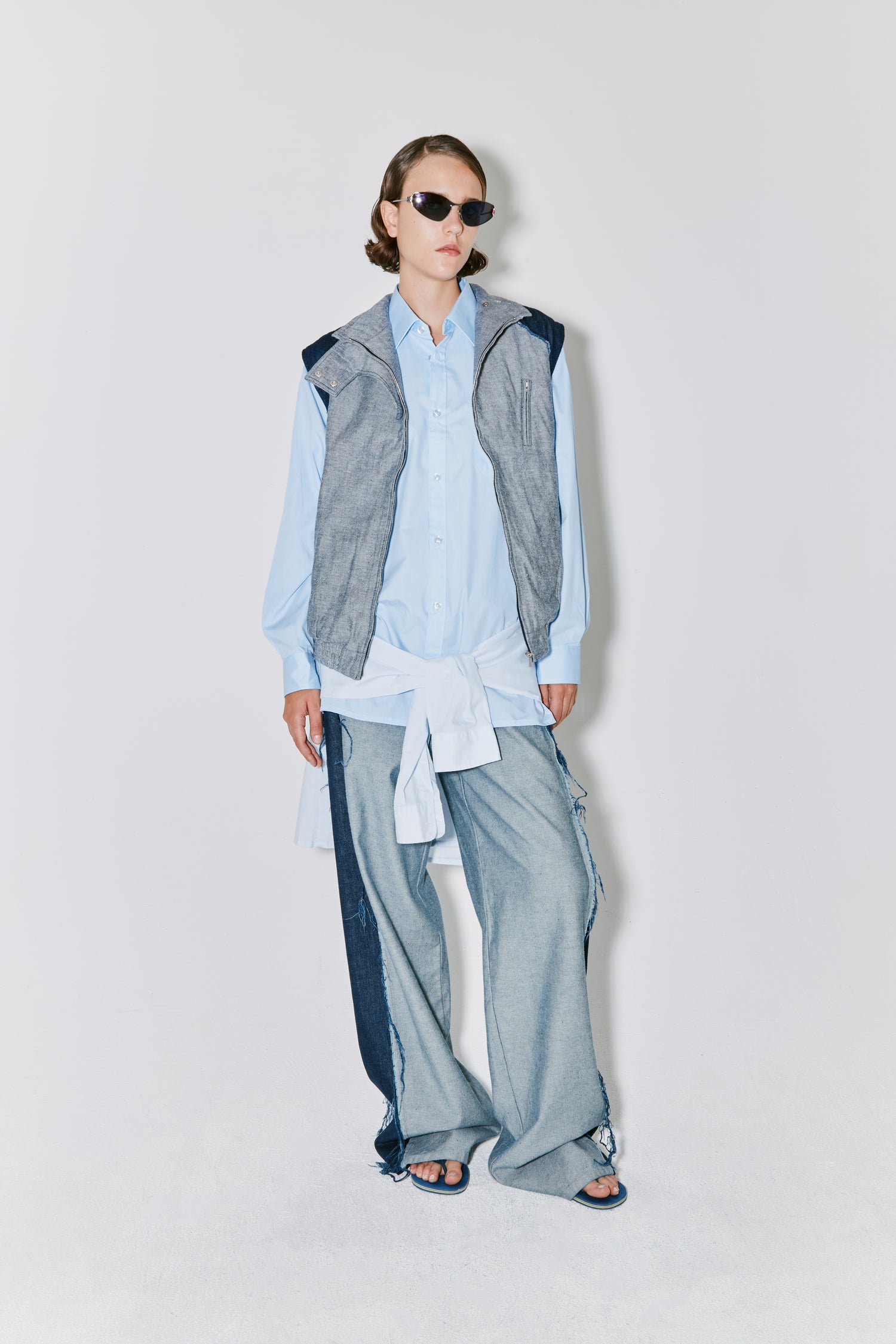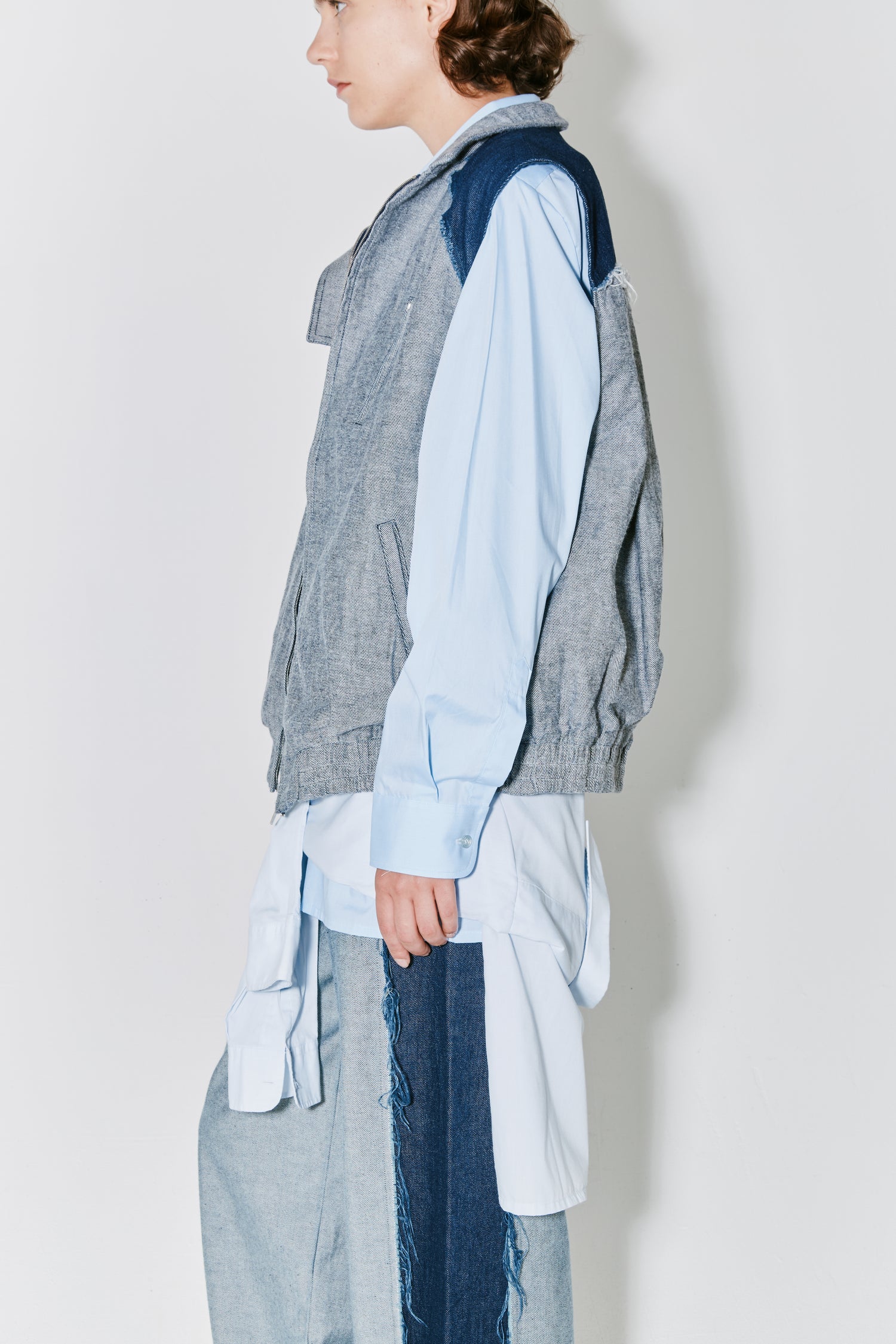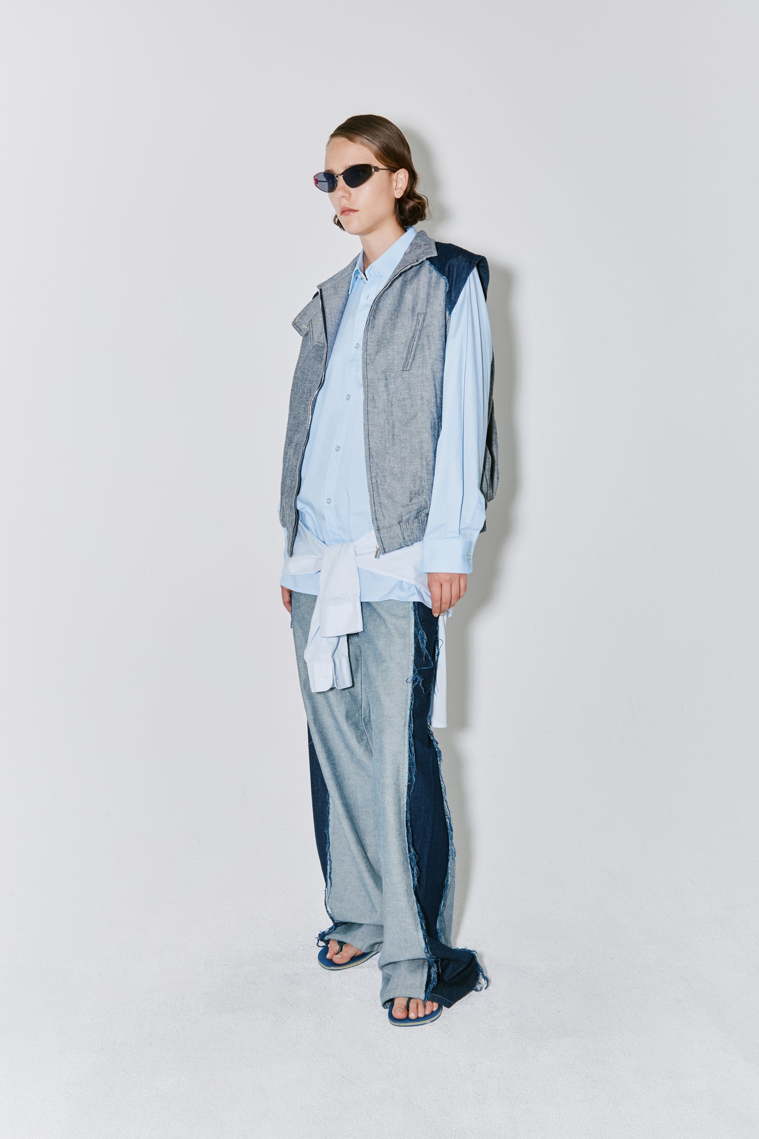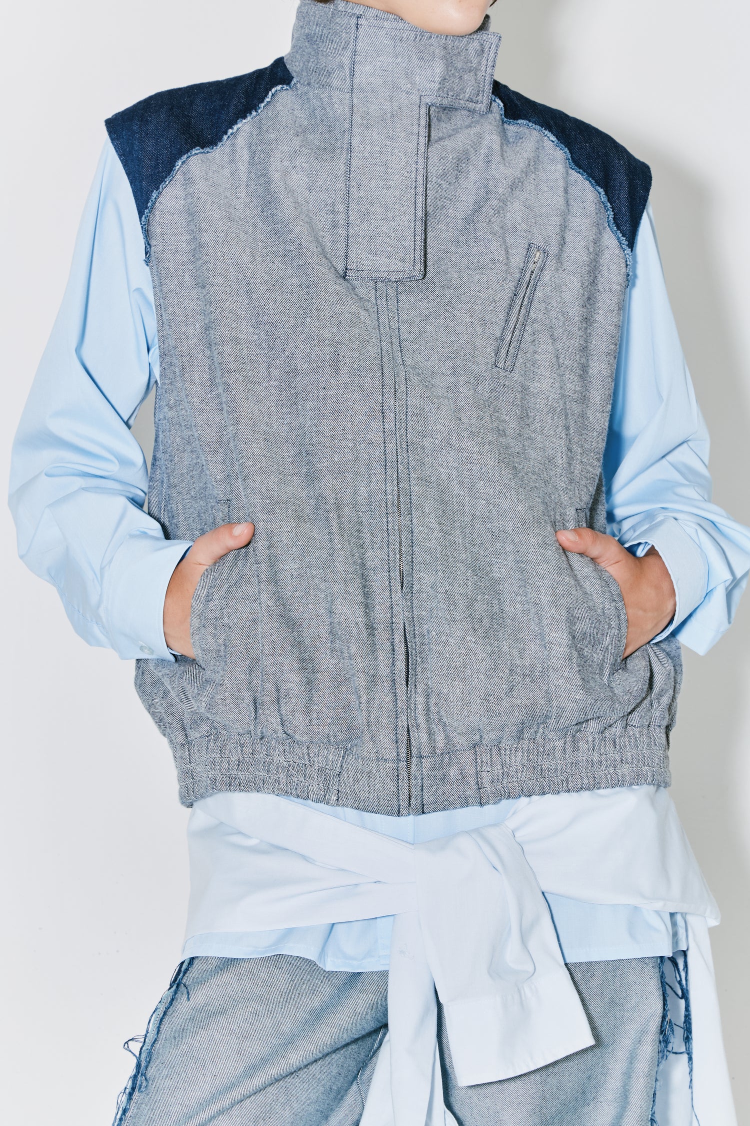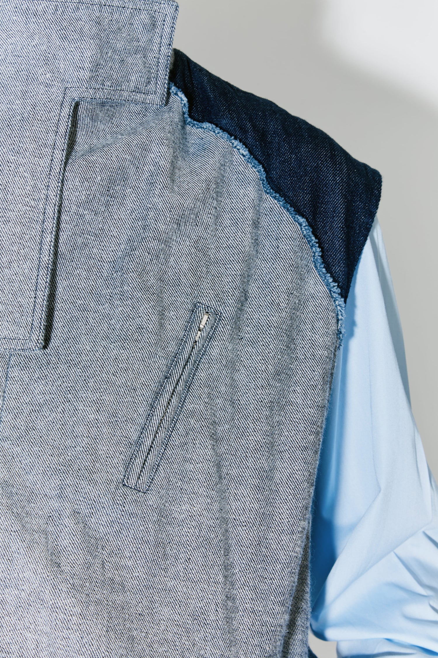 VALI is a sleeveless bomber crafted from Italian denim, featuring a double slider zip closure, an elastic waistband, relaxed fit and an -inside out-denim.