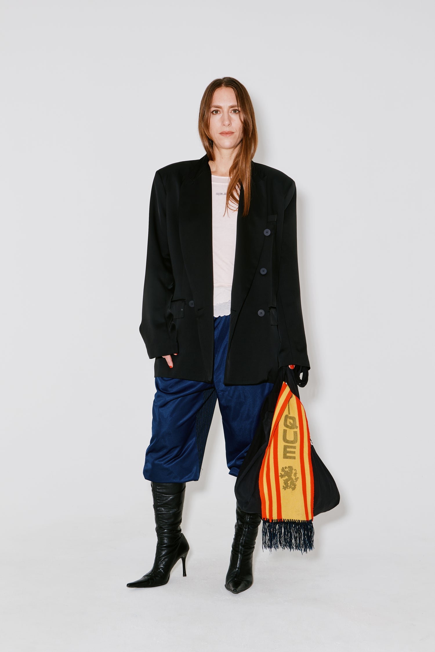 VENDOME is an oversized blazer in black Italian viscose. Features a classic tailored collar, two-button front closure, and flap pockets. Designed with strong shoulders and a long, straight cut for a relaxed yet structured silhouette.