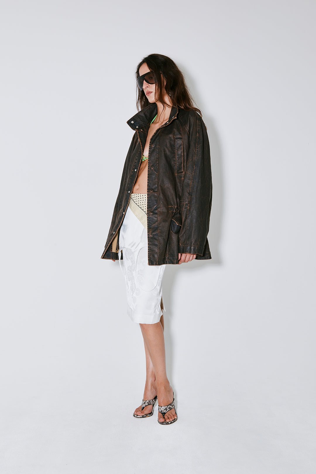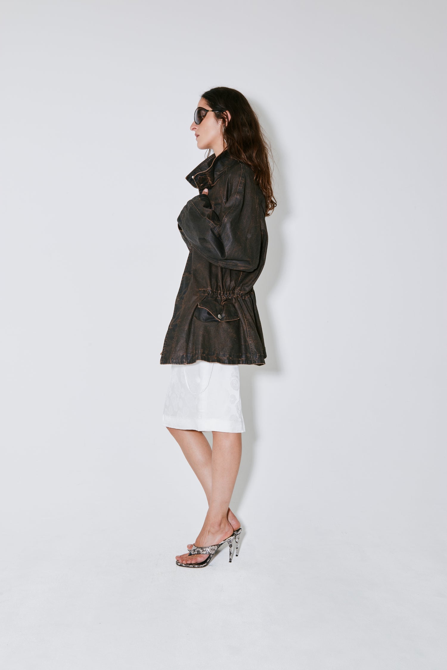 VEGAS is a jacket crafted from Italian coated cotton with a brown wax finish. Features four pockets, snap button closure adjustable waist with a cord tunnel. Designed with a slightly glossy surface for a modern twist on workwear. Cut to a structured, boxy silhouette.