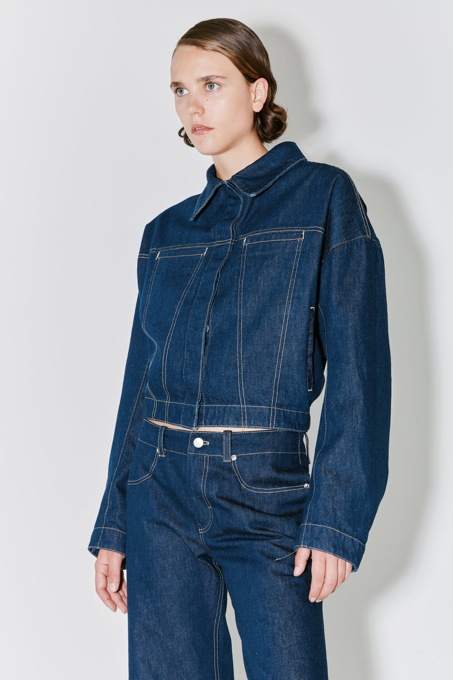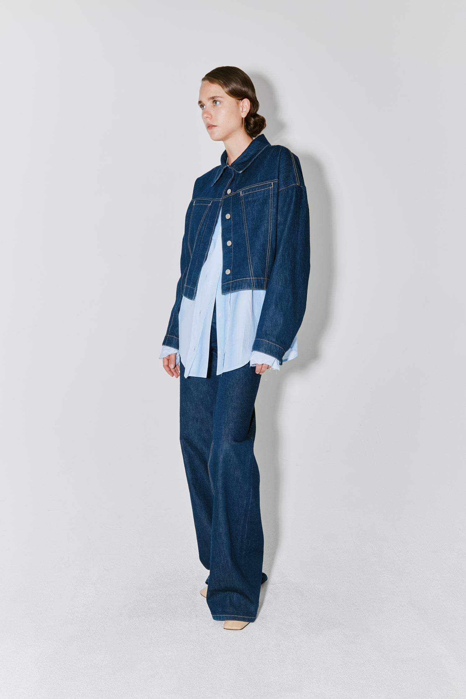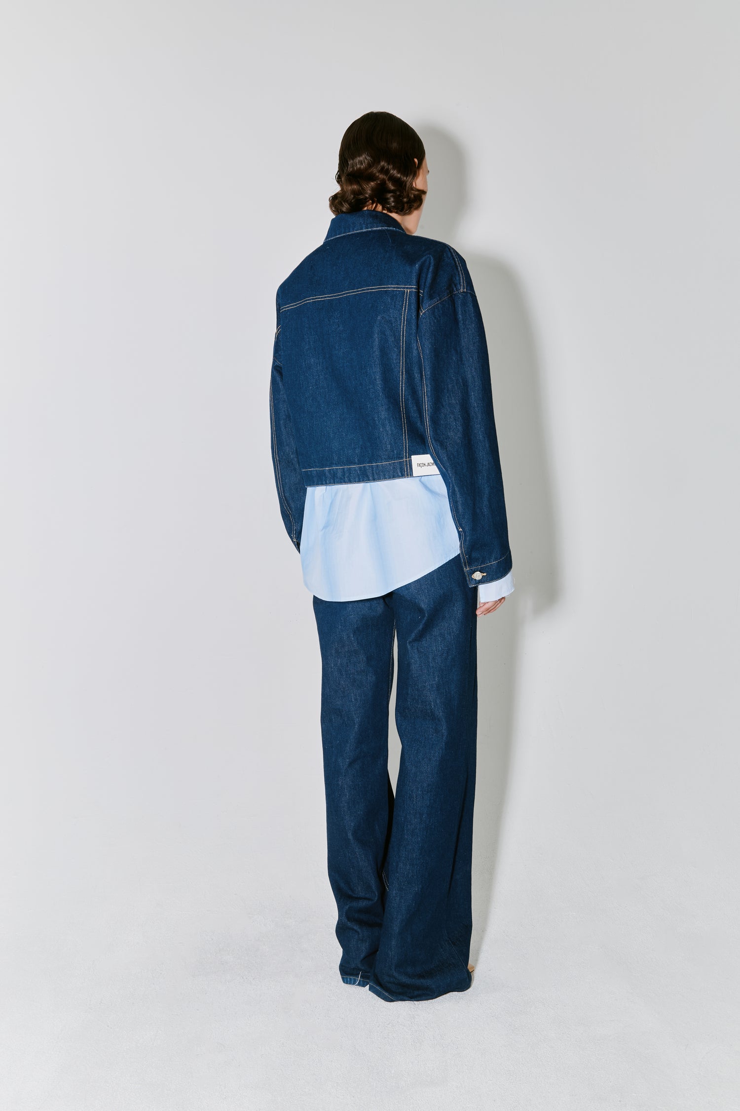 VERONICA is a straight fit denim jacket crafted in Italian dark blue denim, this trompe-l’œil jacket reimagines traditional codes in a playful way.
