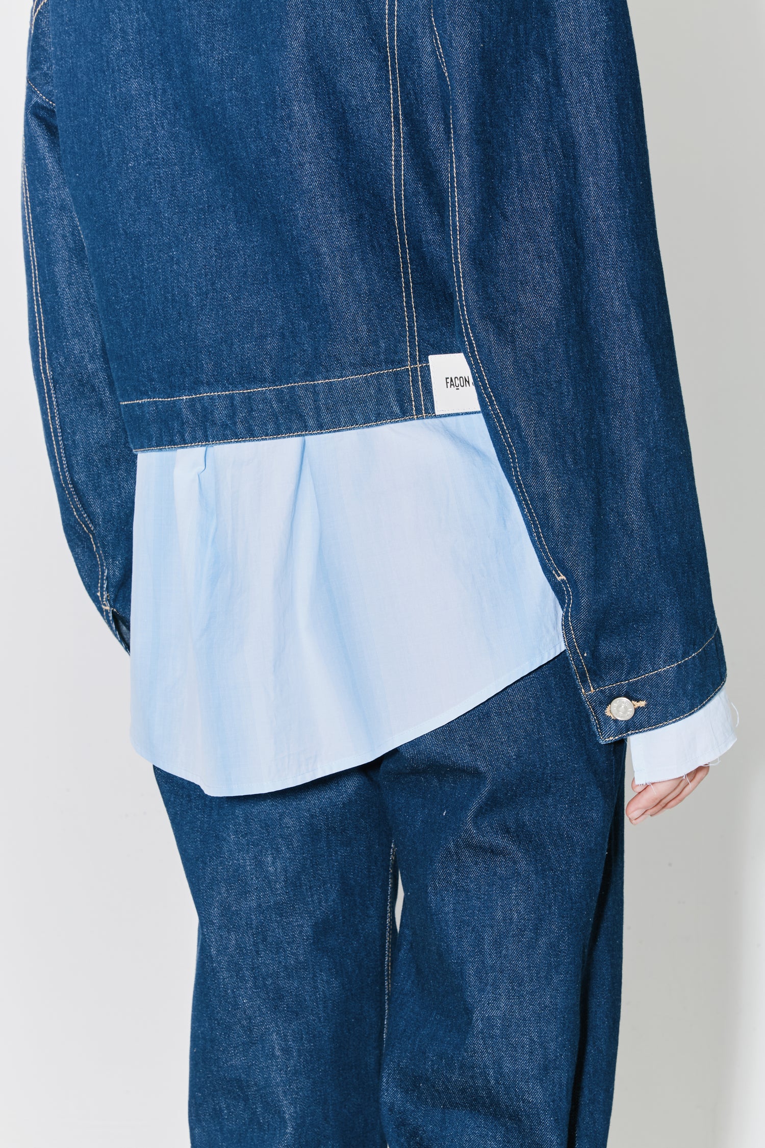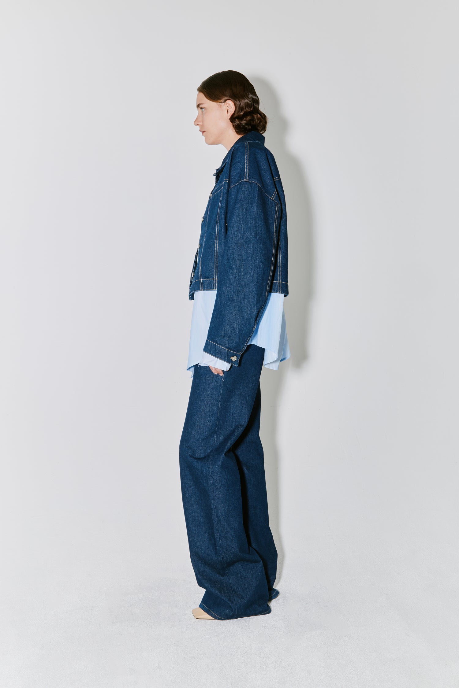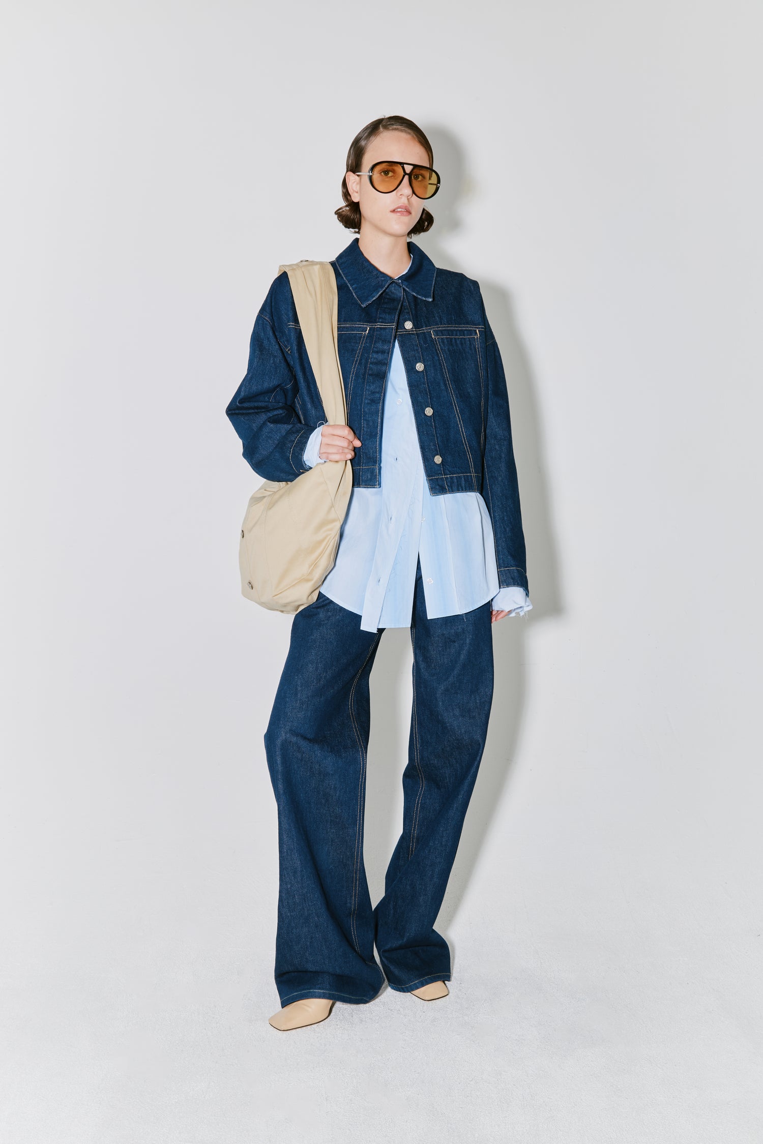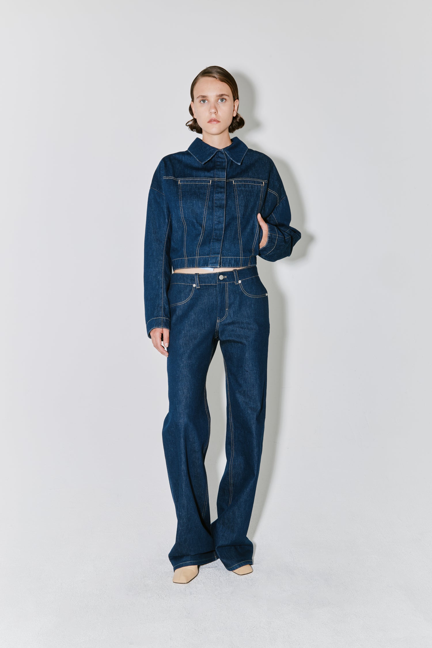 VERONICA is a straight fit denim jacket crafted in Italian dark blue denim, this trompe-l’œil jacket reimagines traditional codes in a playful way.