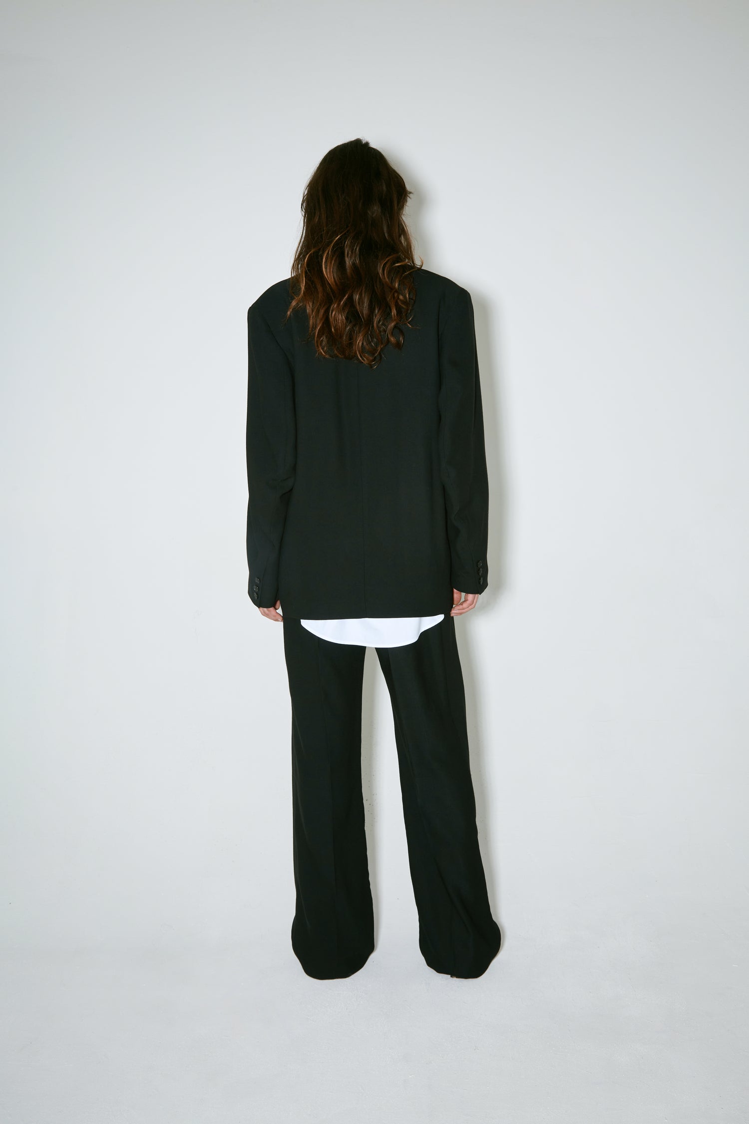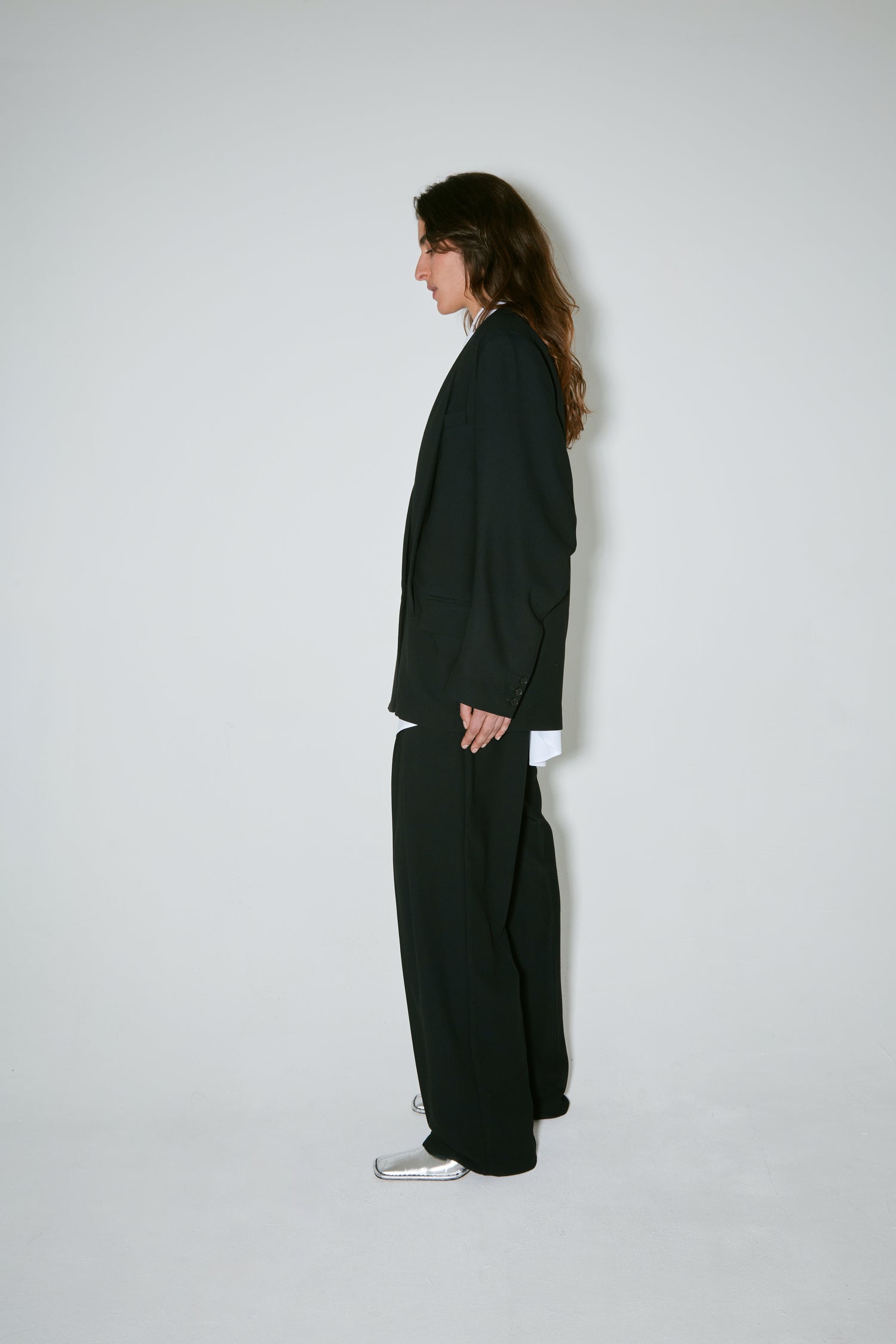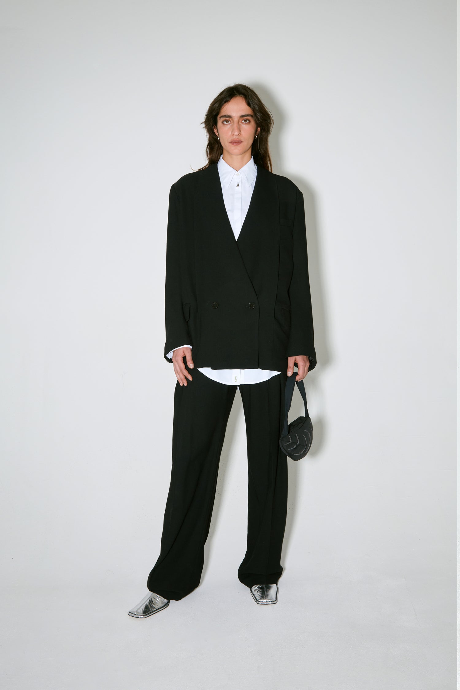 VOLKER is a sleek oversized pleated blazer made with a black Italian viscose. Features an overlap button closure with a deep V neck and collar. This classic yet comfortable piece can elevate any outfit in many different styles.
